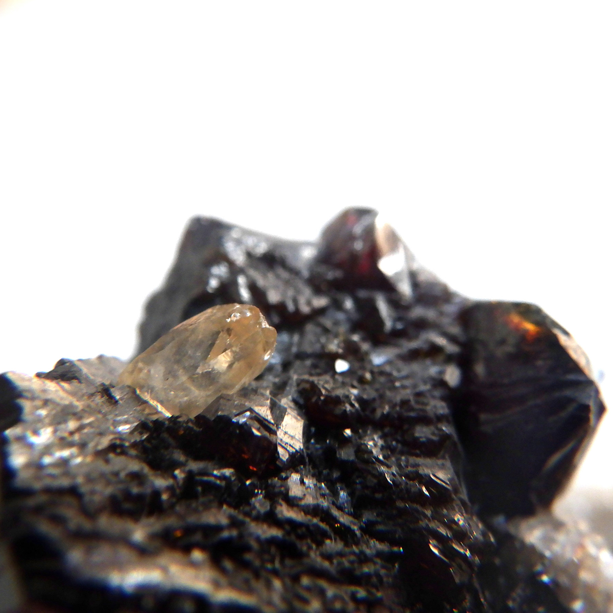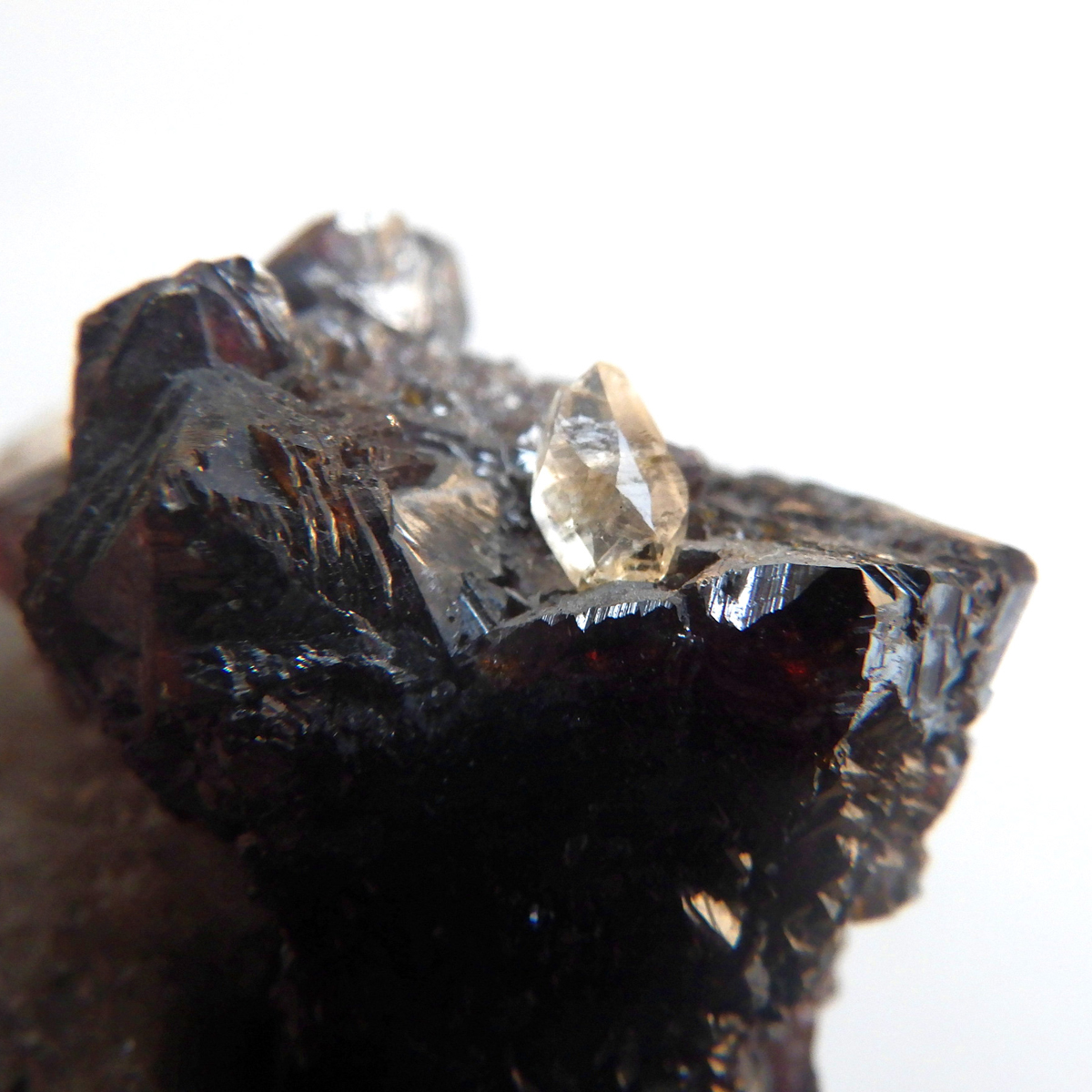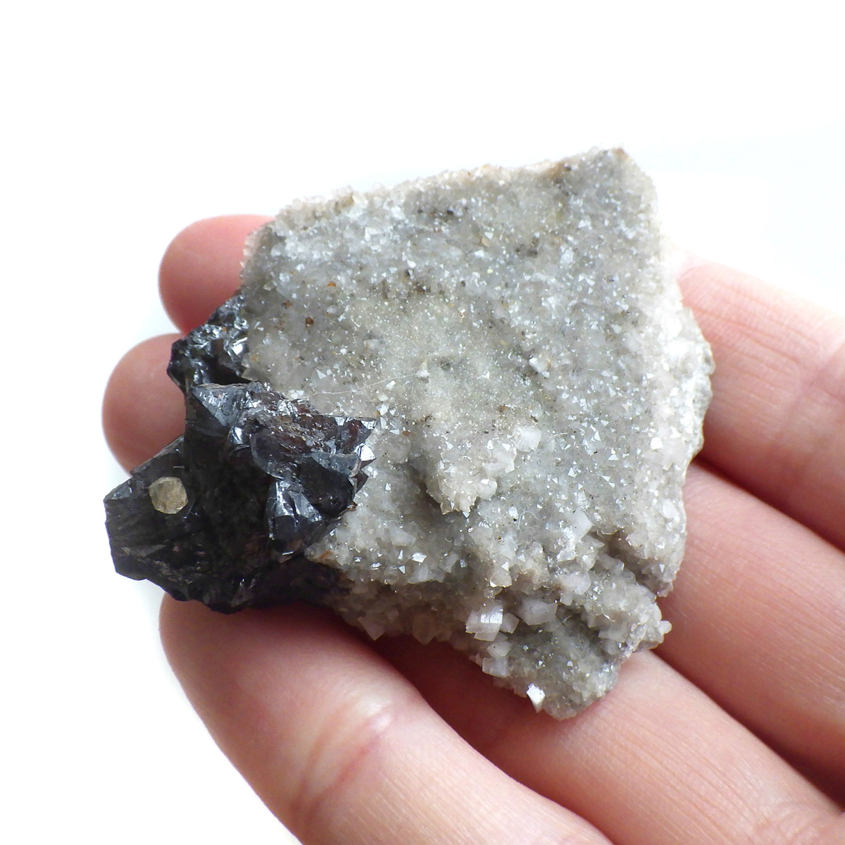 アメリカ・テネシー州産のスファレライト原石です。 スファレライトはガレーナなどの他の鉱物とよく間違えられていたことからギリシャ語のあてにならないという意味のsphalerosにちなんで名付けられたそうです。スファレライトは和名で閃亜鉛鉱といいます。水晶やカルサイトと共生しており、どちらの結晶もキラキラと美しい原石です。