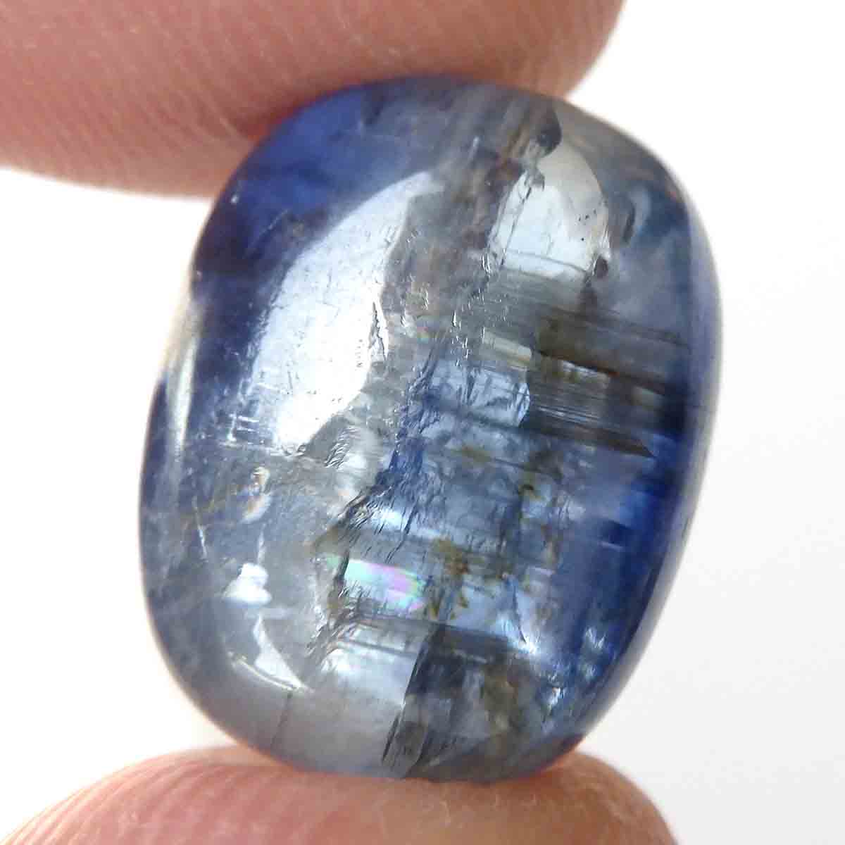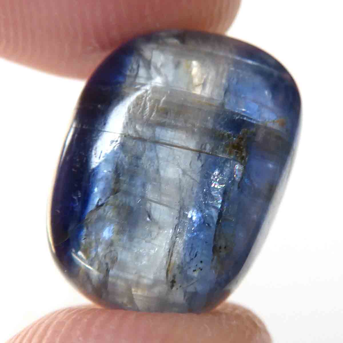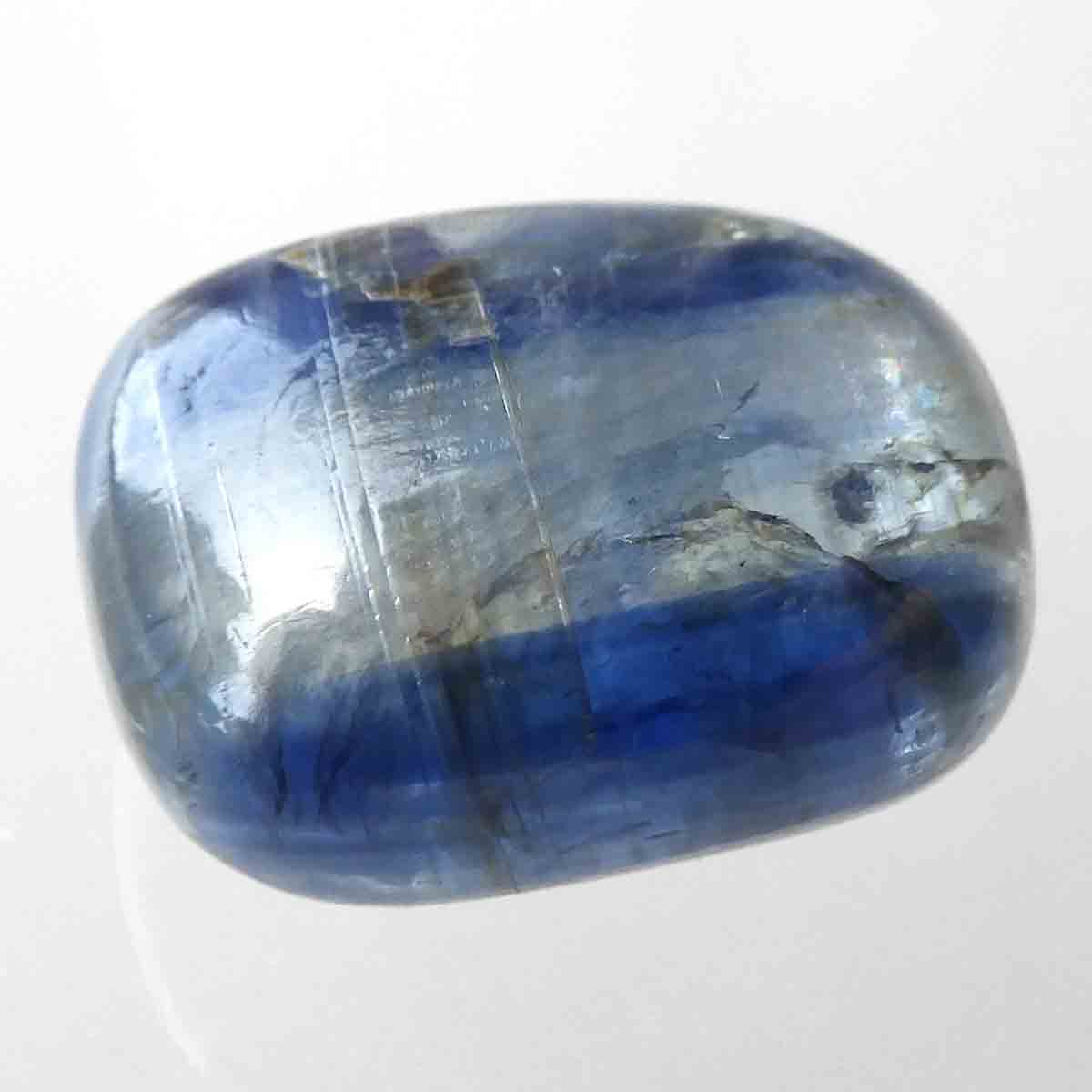ネパール・ヒマラヤ産のカイヤナイト、タンブルです。カイヤナイトの独特のブルーは、サファイアと同じく、含まれる鉄とチタンが要因となっています。外見だけではブルーサファイアと見間違うこともあります。見た目にも一つの方向に繊維がはっきりと伸びている感じなのですが、カイヤナイトを磨いた玉等はまるで宇宙から見た地球を思わせるような、深く美しいブルーのグラデーションが美しい石です。