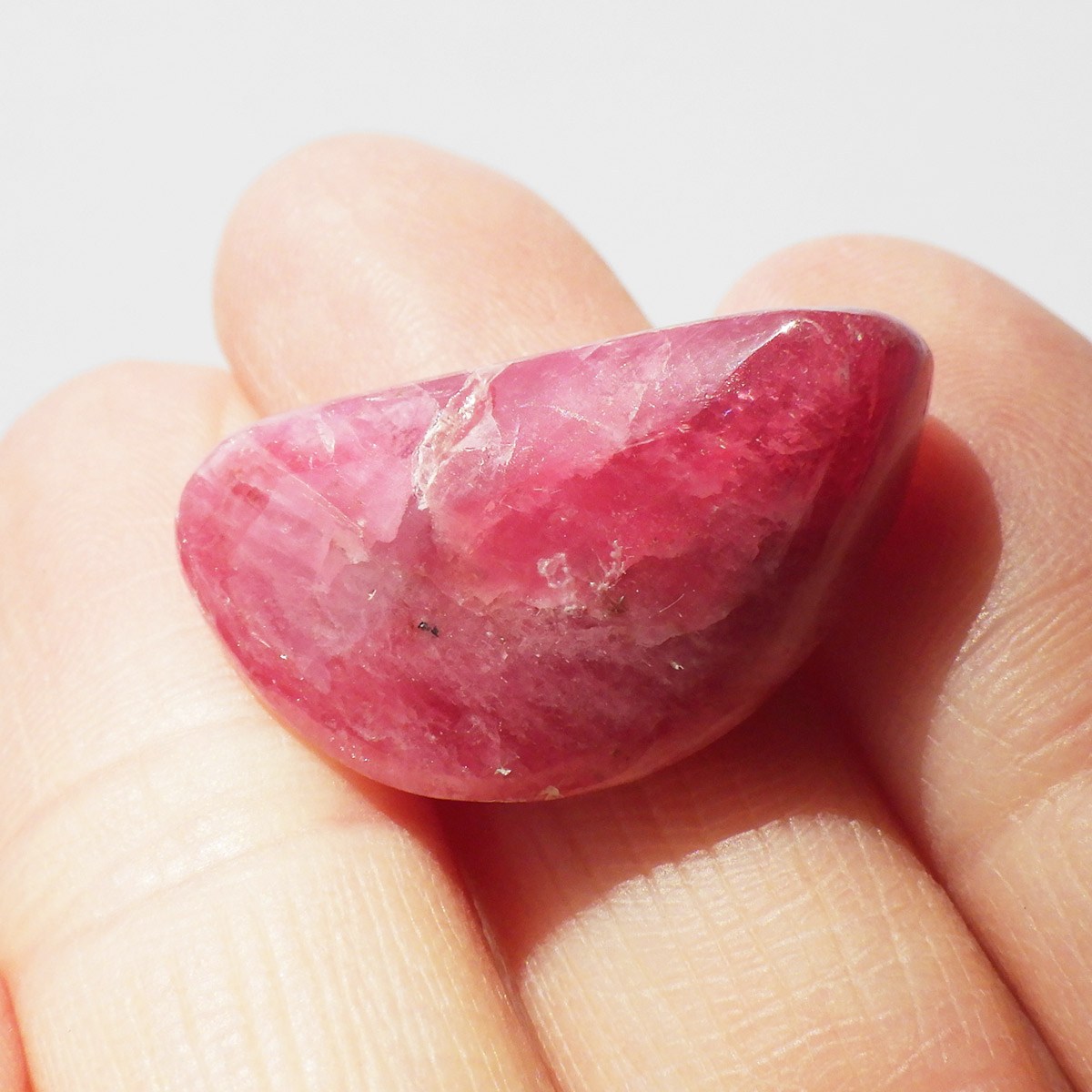 ブラジル産のロードナイト、タンブルです。まさに可憐なバラを連想させる高貴な紅色が人気のロードナイトですが、今回ご用意しているものは、AAAクラスのものです。ブラジル産のロードナイトのトップグレードのもので、鮮やかな発色は紅色に近く、光を通すとさらにまたその発色が美しいです。