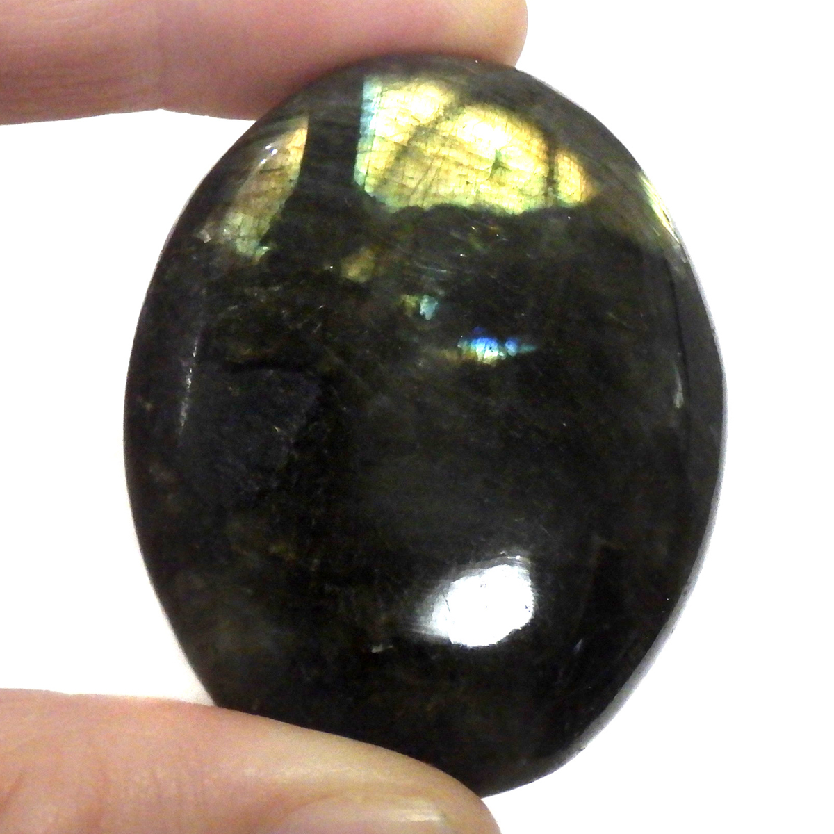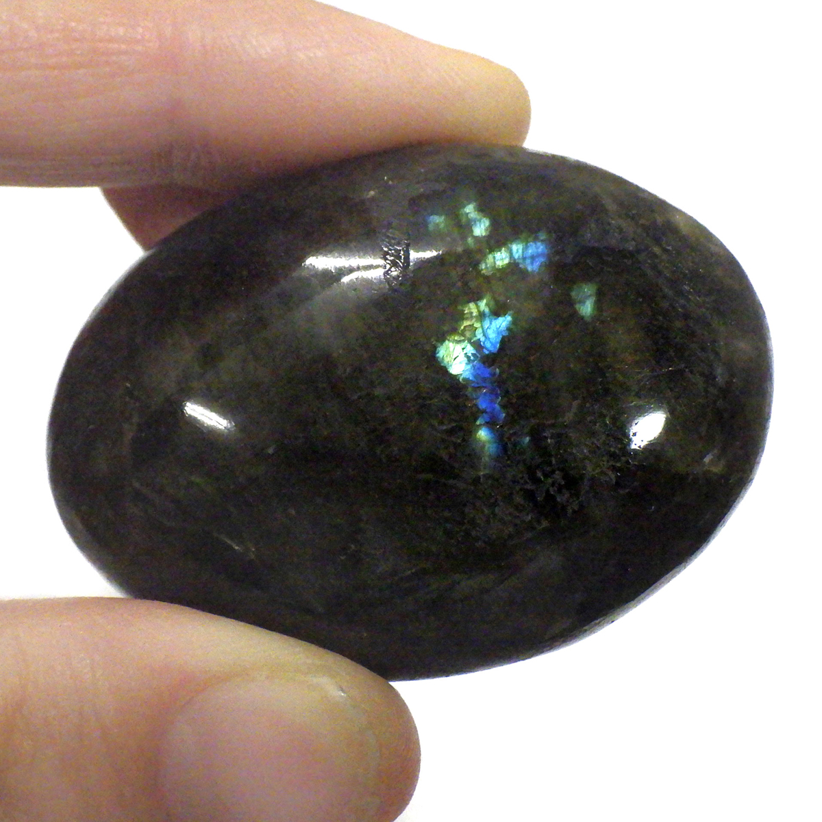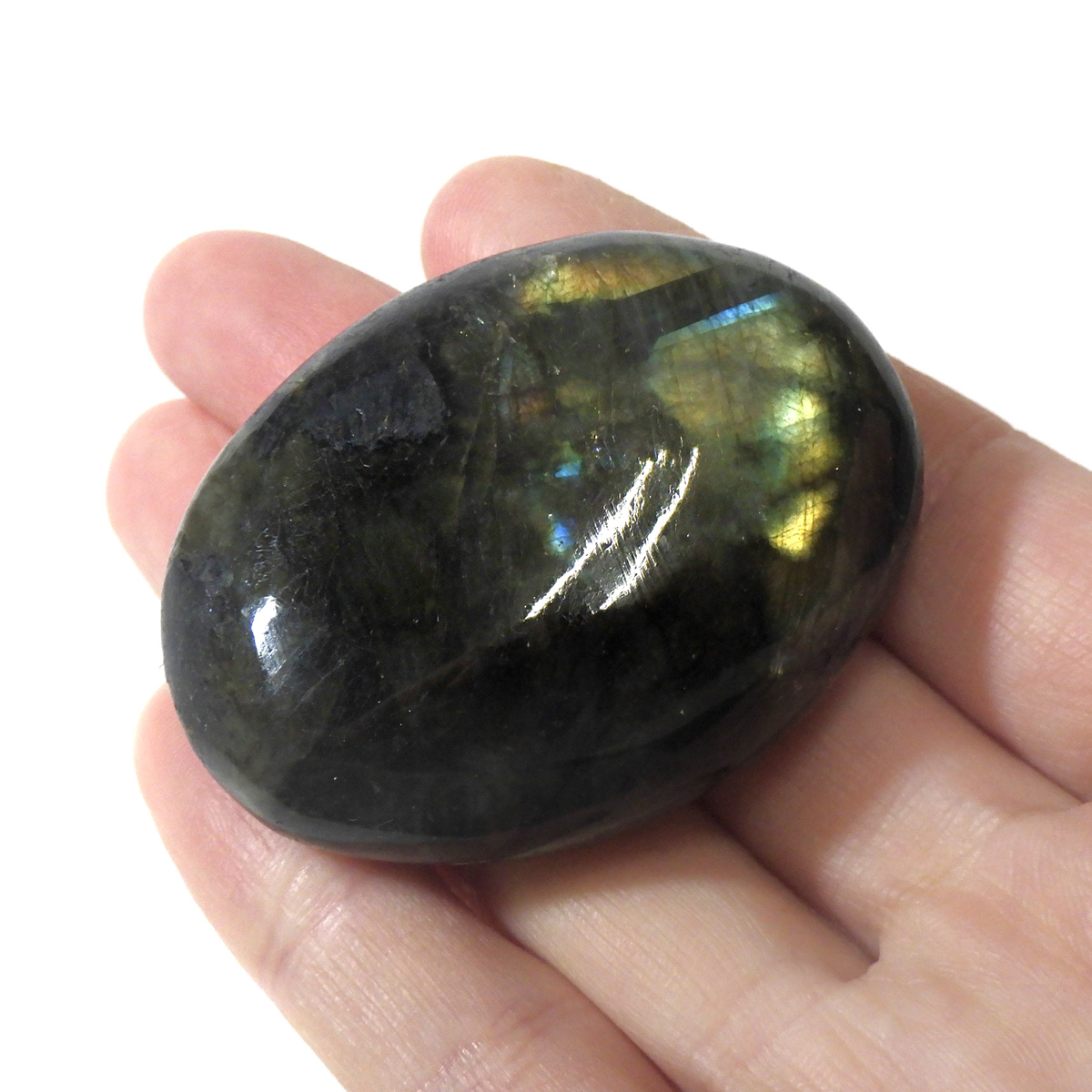 マダガスカル産のラブラドライト磨きペブルです。 見る角度によってオーロラのような色彩を変える美しい光を持つのが特徴です。 石自体はグレーなどの地味めな色合いをしていますが、そこに鮮やかな輝きが浮かび上がるところから「アゲハ蝶の羽」に例えられる事もある美しい石です。 ラブラドライトは、月・太陽を象徴するといわれています。根気強い実行力を養い、信念を貫けるよう導く力があるとされます。そして、直感力・洞察力・創造性を高めてくれるでしょう。自信を失いかけた時に、生まれた意味・生きる意味を気づかせるサポートをしてくれ、生きる力を引き出してくれるといわれています。