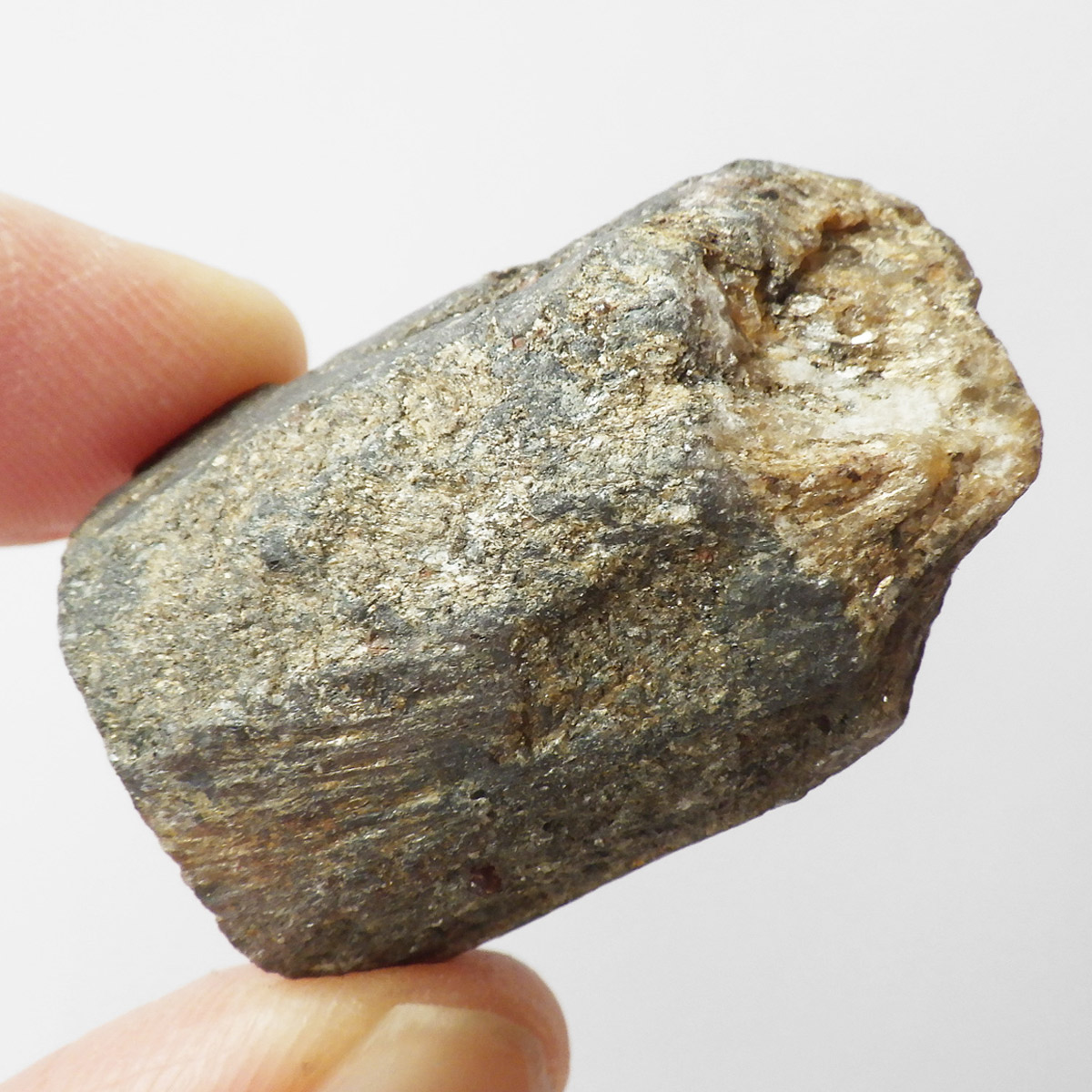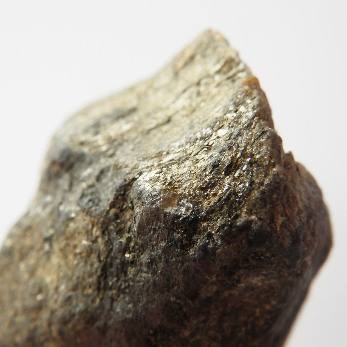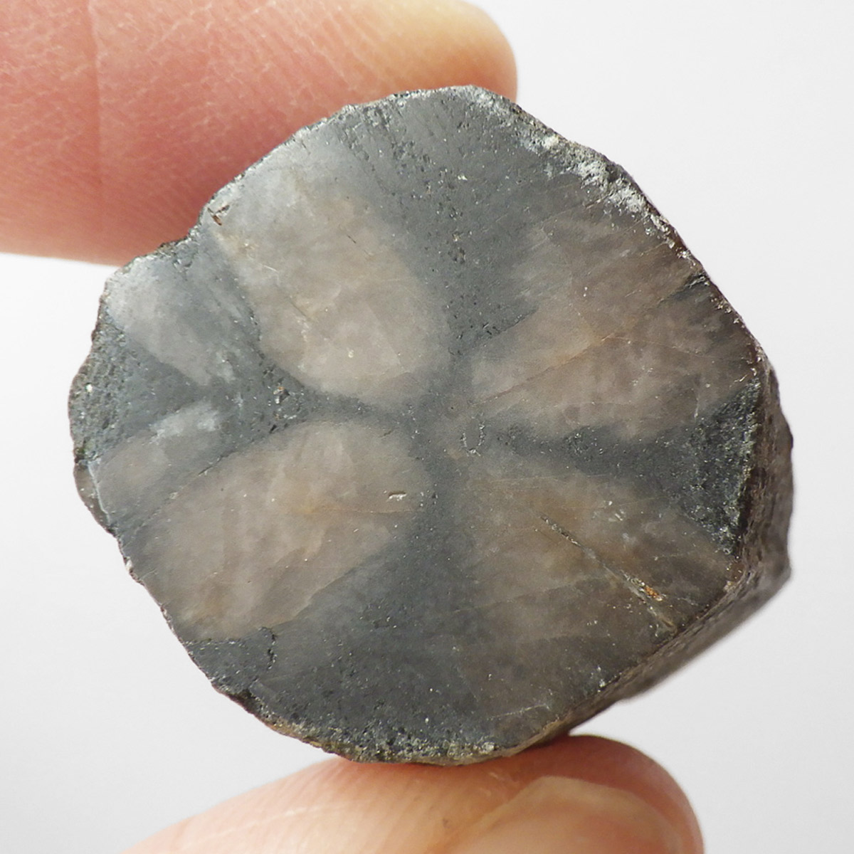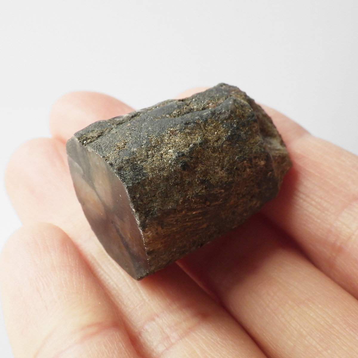 チャイナ産、キャストライト原石です。濃いブラウンに黒の十字模様が大変魅力的な石です。キャストライトの名前は、輪切りにすると黒い十字の模様が現れることから、ギリシャ語で「対角線的な配列」という意味の「Chiastos」に由来しています。キャストライトは、黒鉛(グラファイト)などの黒色含有物を対称的に含んだ紅柱石(アンダルサイト)です。クロスストーンとも呼ばれ、粘板岩と花こう岩の接触部に産出します。