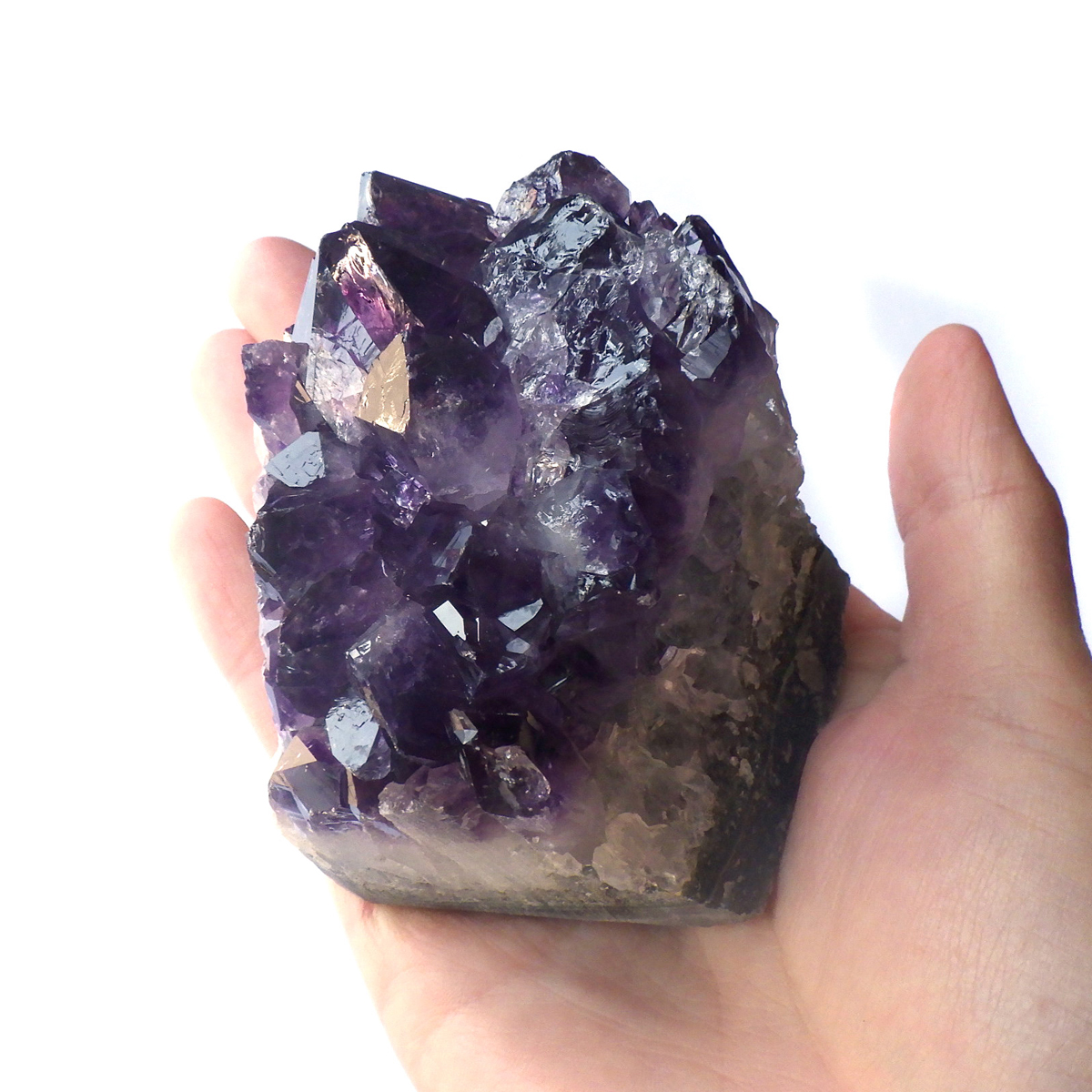 ブラジル産の特大サイズのアメジストクラスターです。大きな粒の結晶が美しく成長したアメジストクラスターです。透明感があり、濃い紫のグラデーションが美しい一点です。ブレスレットや空間の浄化用に置いていただくといいと思います。