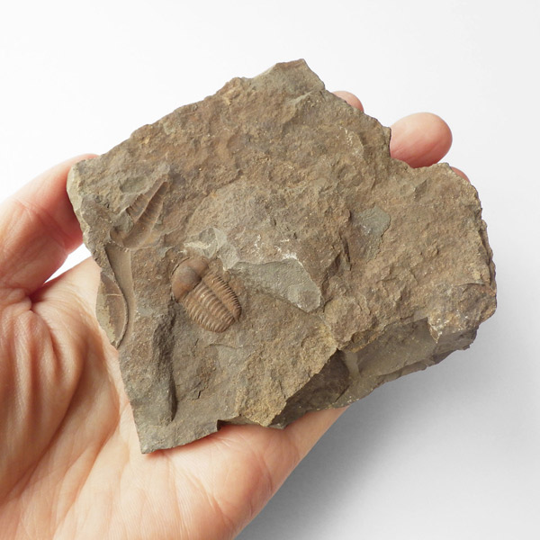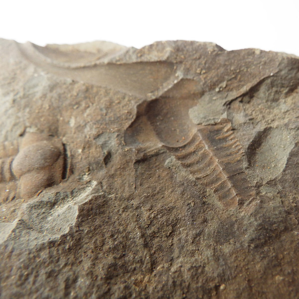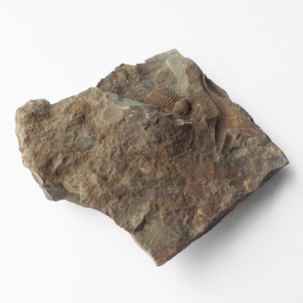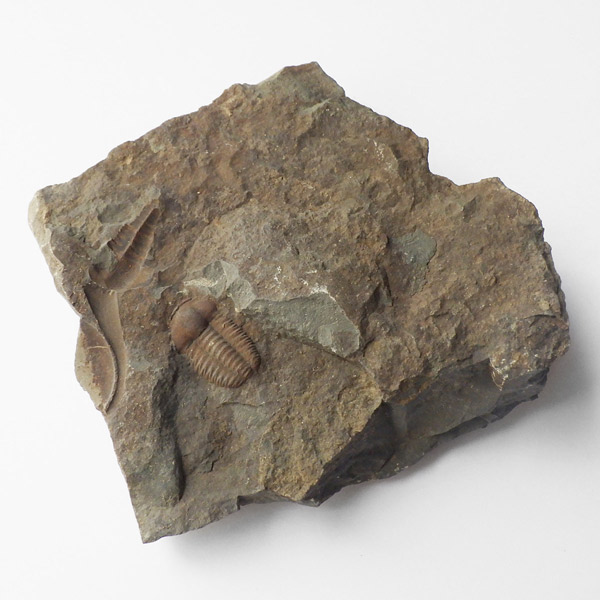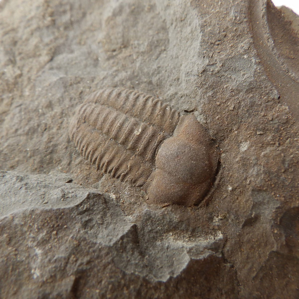 母岩を含む三葉虫の化石です。三葉虫類はカンブリア紀初期から繁栄し、ペルム紀末で絶滅したとされています。三葉虫の名前の由来は縦に三区分される葉状の構造にちなんでいるとされています。
