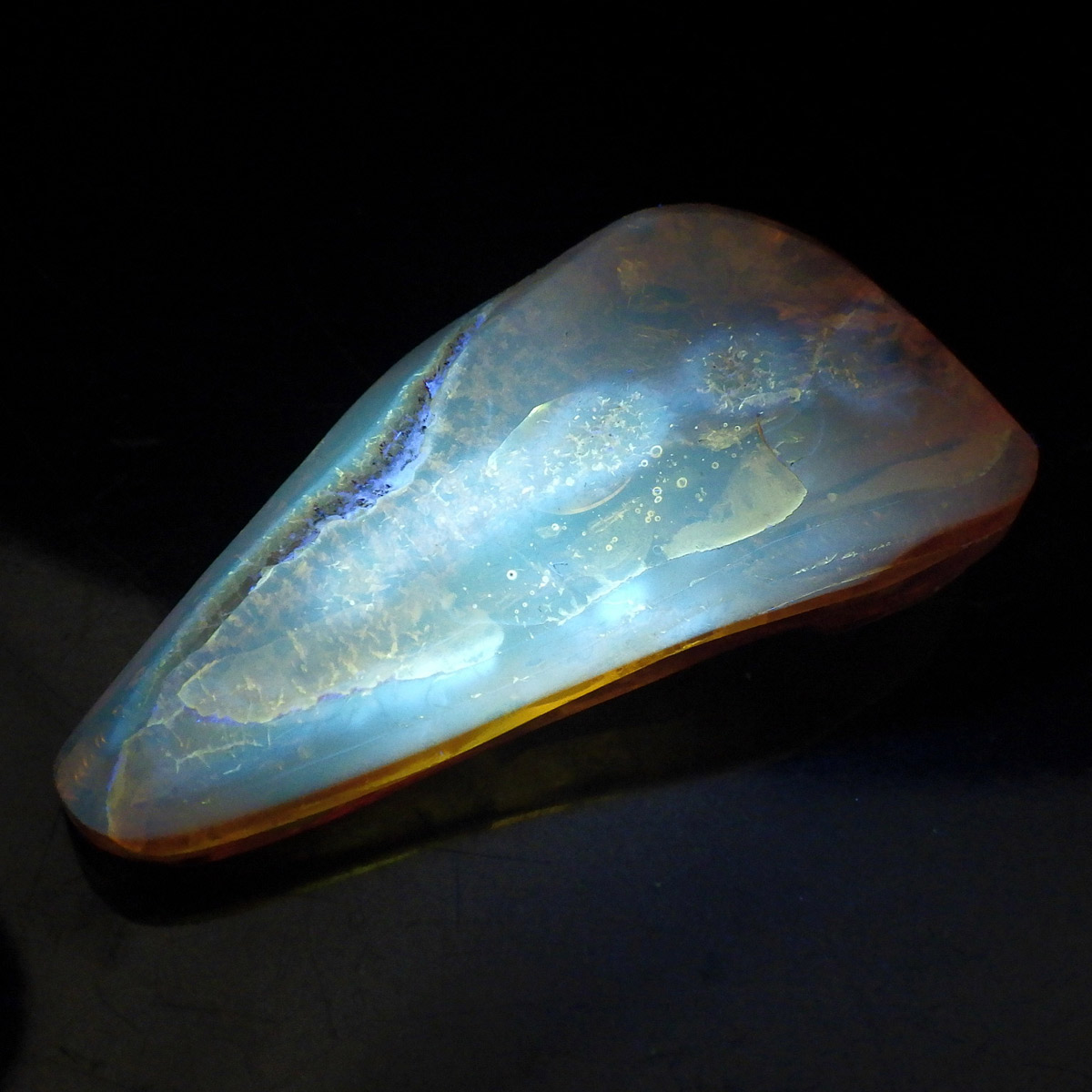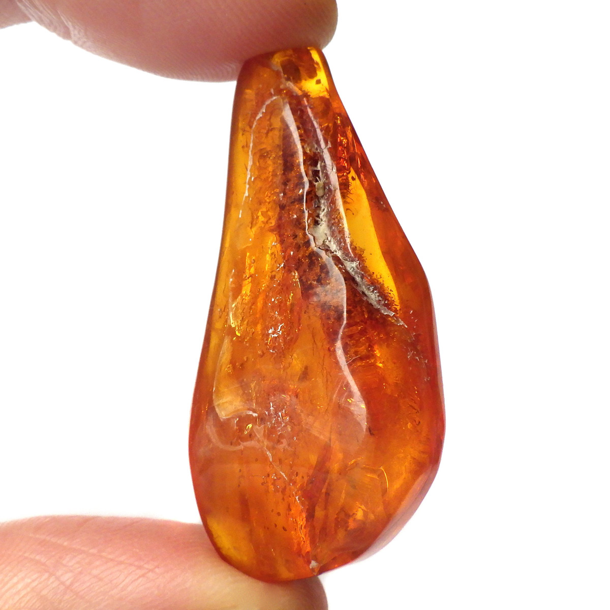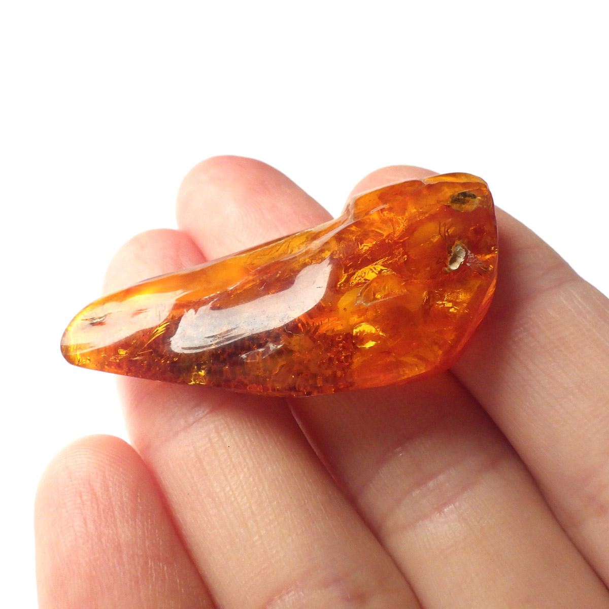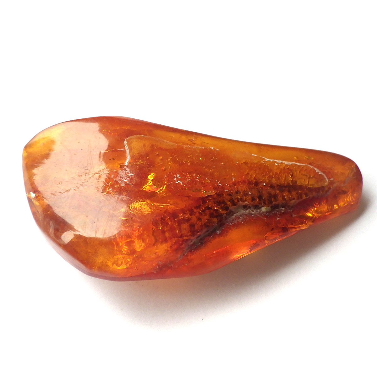 バルト海産の虫入りアンバー(琥珀)、原石です。 松柏類の樹脂が3000万年以上の時を経て化石化したもので、バルト海沿岸地方で多く産出し、紀元前2000年頃、ヨーロッパではすでに「アンバールート」という交易ルートがあったほど人気があったようです。 アンバーという名前は、古代アラビア語の「アンバール(海に漂うもの)」が由来です。樹脂を含む樹木が地殻変動などで海底に沈み、化石へと熟成され海岸に流れ着いたからで、「シー・アンバー」と呼ばれます。また、古代の昆虫などが入ったものは学術的価値も高く、「インセクト・アンバー」と呼ばれます。