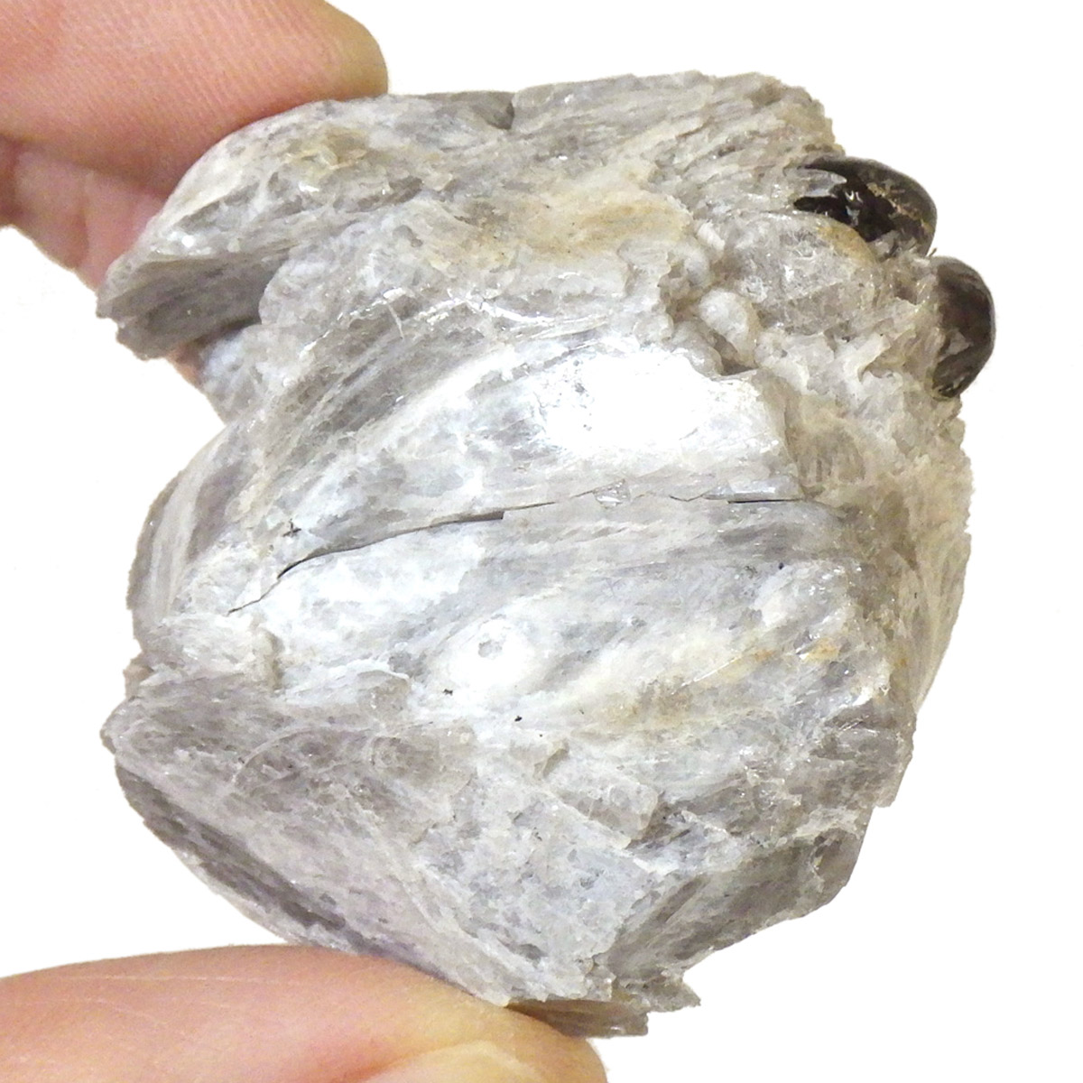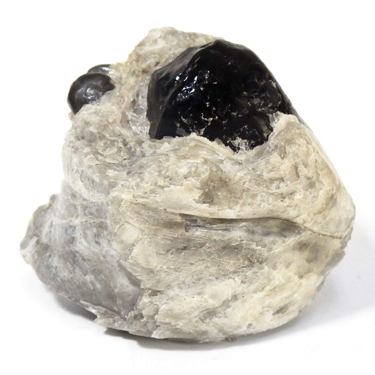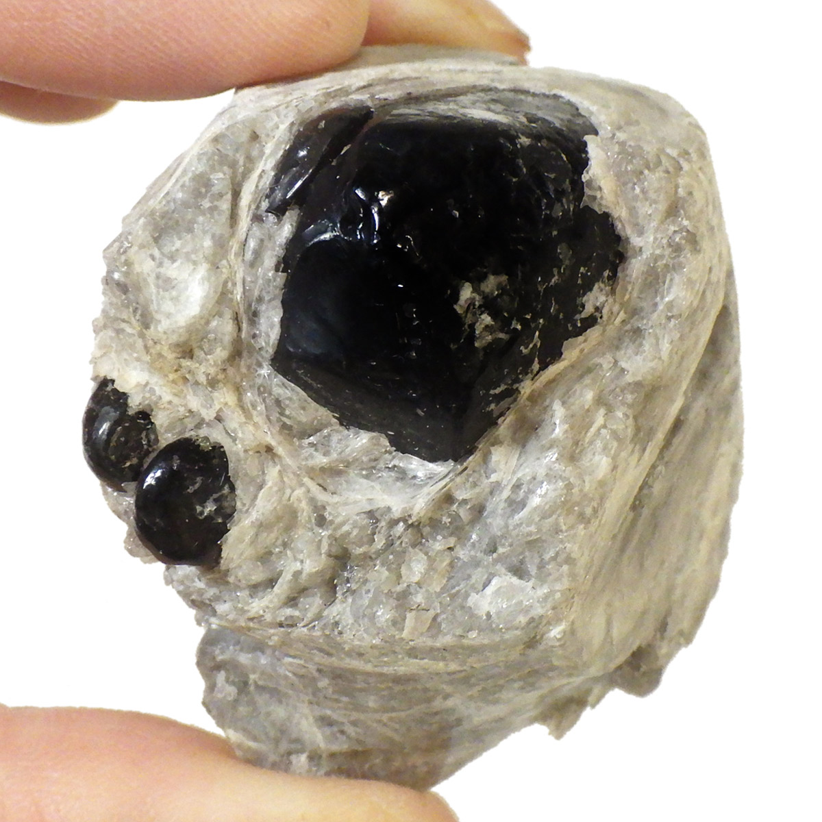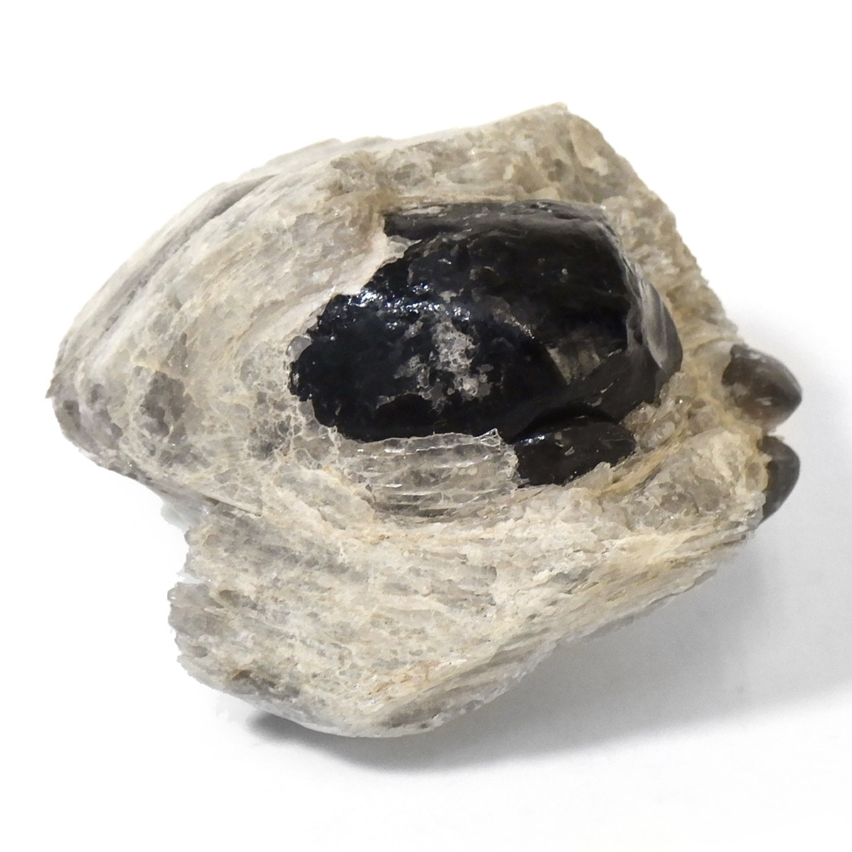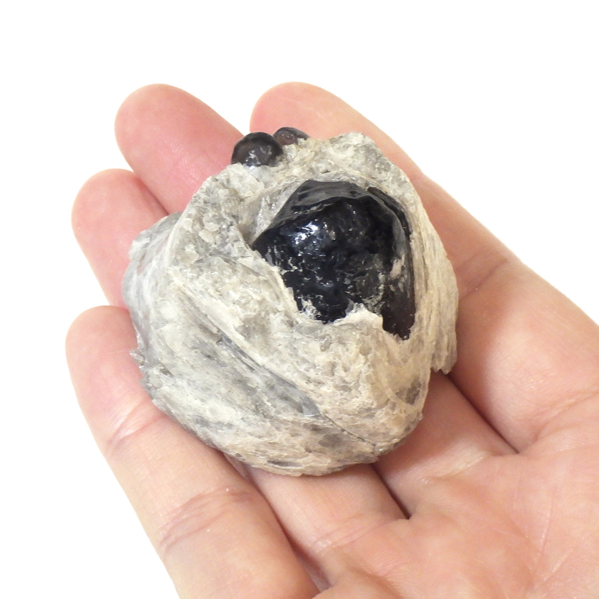 アメリカ・アリゾナ州産のアパッチティアーズ原石です。アパッチティアーズはオブシディアンの一種ですが、通常のオブシディアンとは違い、粘性度の高い溶岩が急速に冷えてつくられる白い真珠岩に埋もれていて、砕くとドロップの形状で産出されます。オブシディアンは天然のガラスで、溶岩が地表付近で急速に冷えて、ガラス質になったものです。そのオブシディアンの中でも、アメリカのアリゾナ州やニューメキシコ州で見つかるものをアパッチティアーズと呼んでいます。アパッチとは、アメリカの先住民族であるネイティブ・アメリカンの部族の名前です。先住民族であるネイティブアメリカンのアパッチ族がヨーロッパの移民との戦争で聖地を追われ、多くの生命が奪われたり、奴隷にされたりした悲しみの黒い涙が地中で固まった涙の結晶と言い伝えられています。