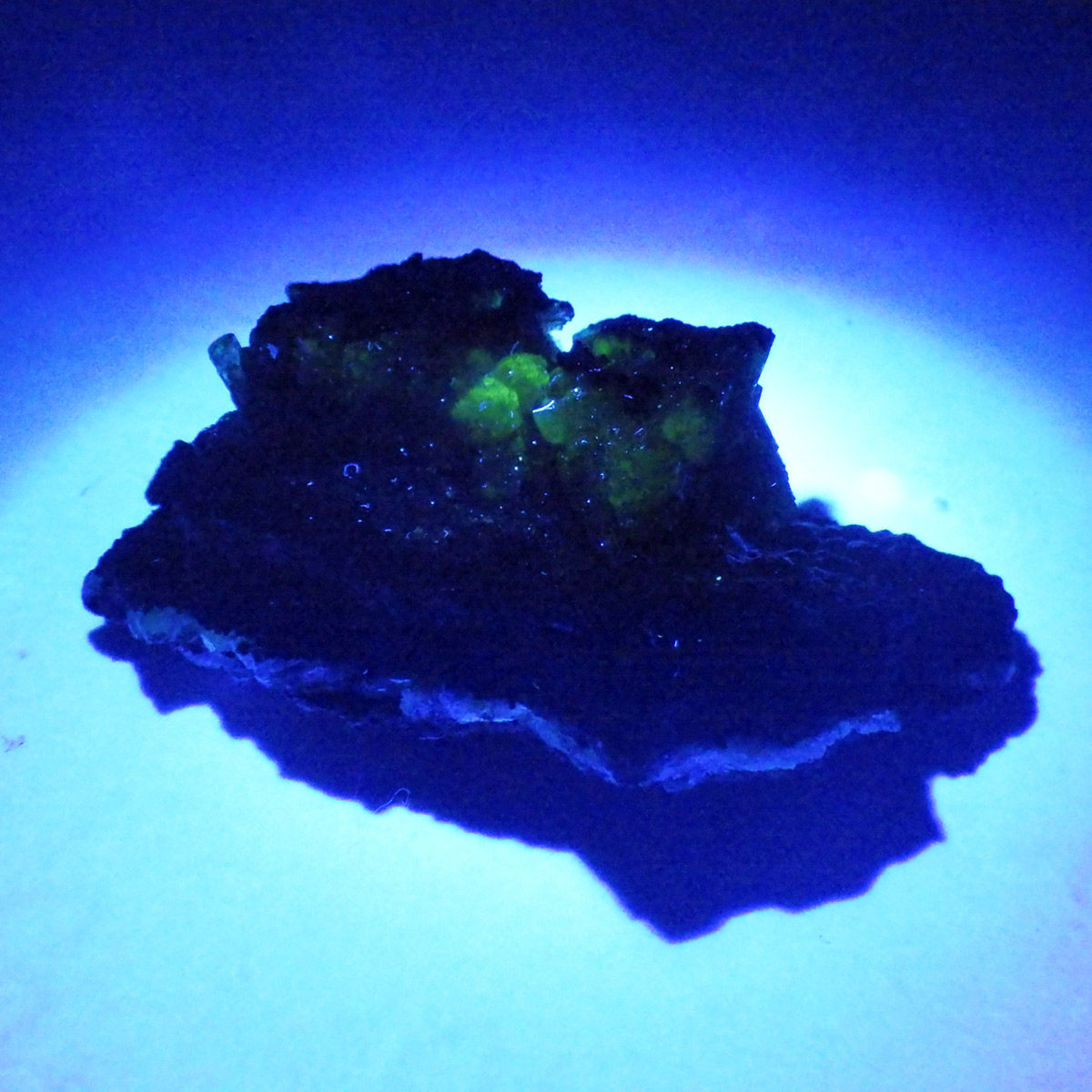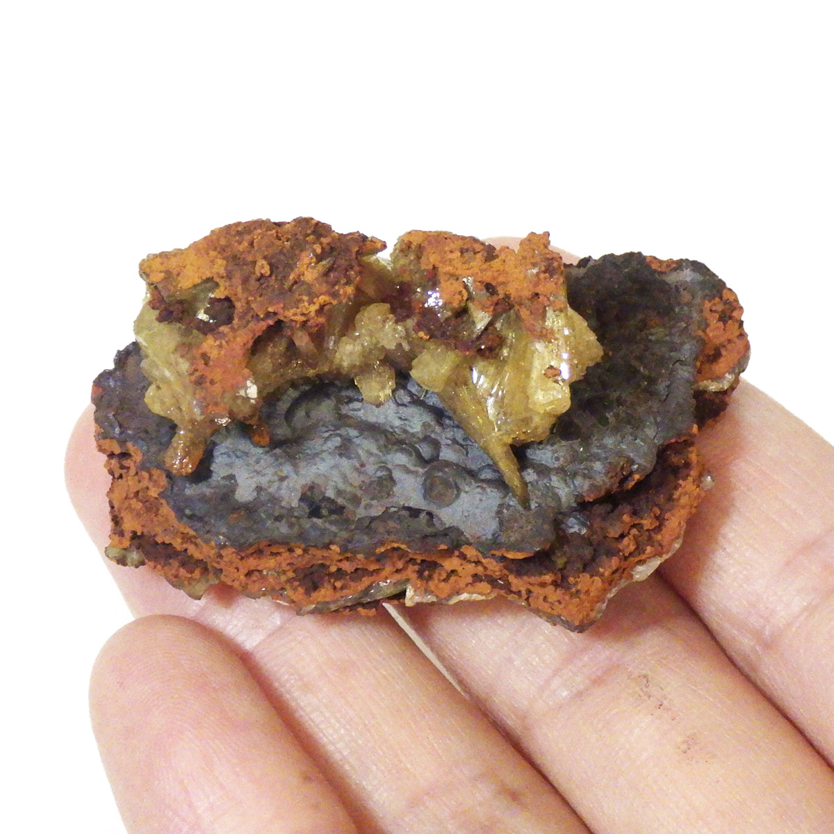 メキシコ産アダマイト原石です。アダマイトはフランス人鉱物学者アダムにちなんで命名されました。和名はアダム鉱。色は黄色、緑、ピンク、菫色と銅やコバルトなど微量成分を含むことによって色の程度が変わります。結晶は花弁状や放射状に成長し、色が鮮やかで光沢があります。多くのアダマイトは蛍光性があり、結晶がブラックライトで鮮緑色にきれいに光ります。
