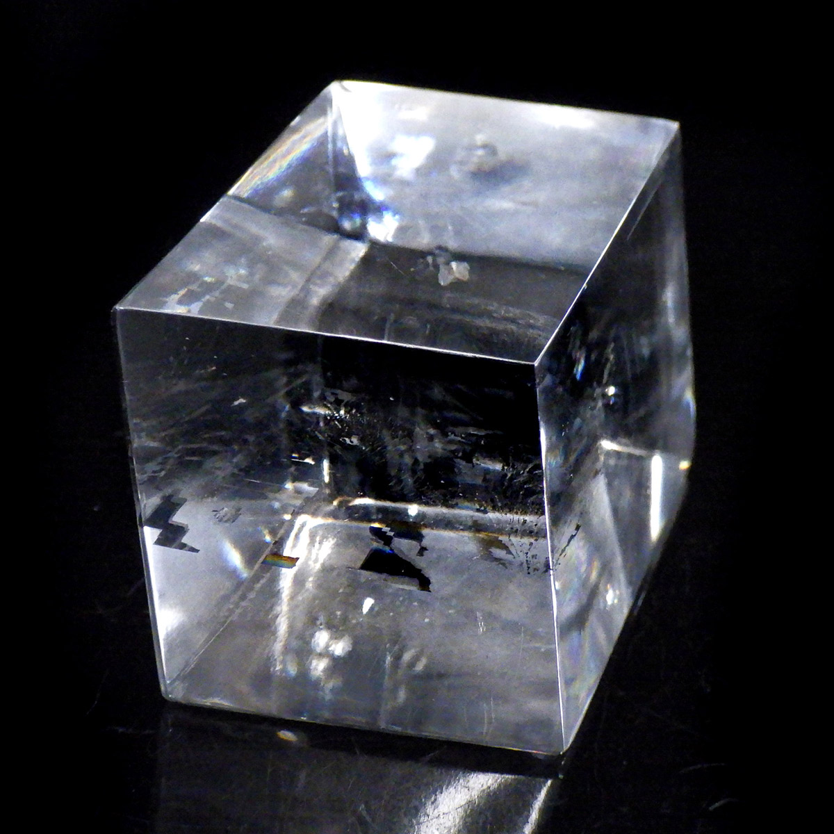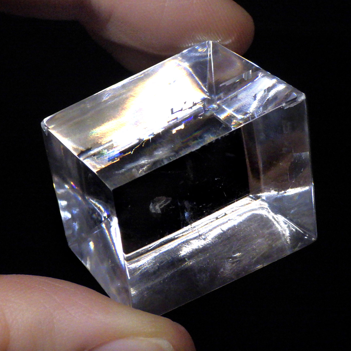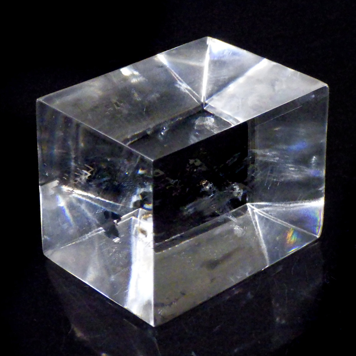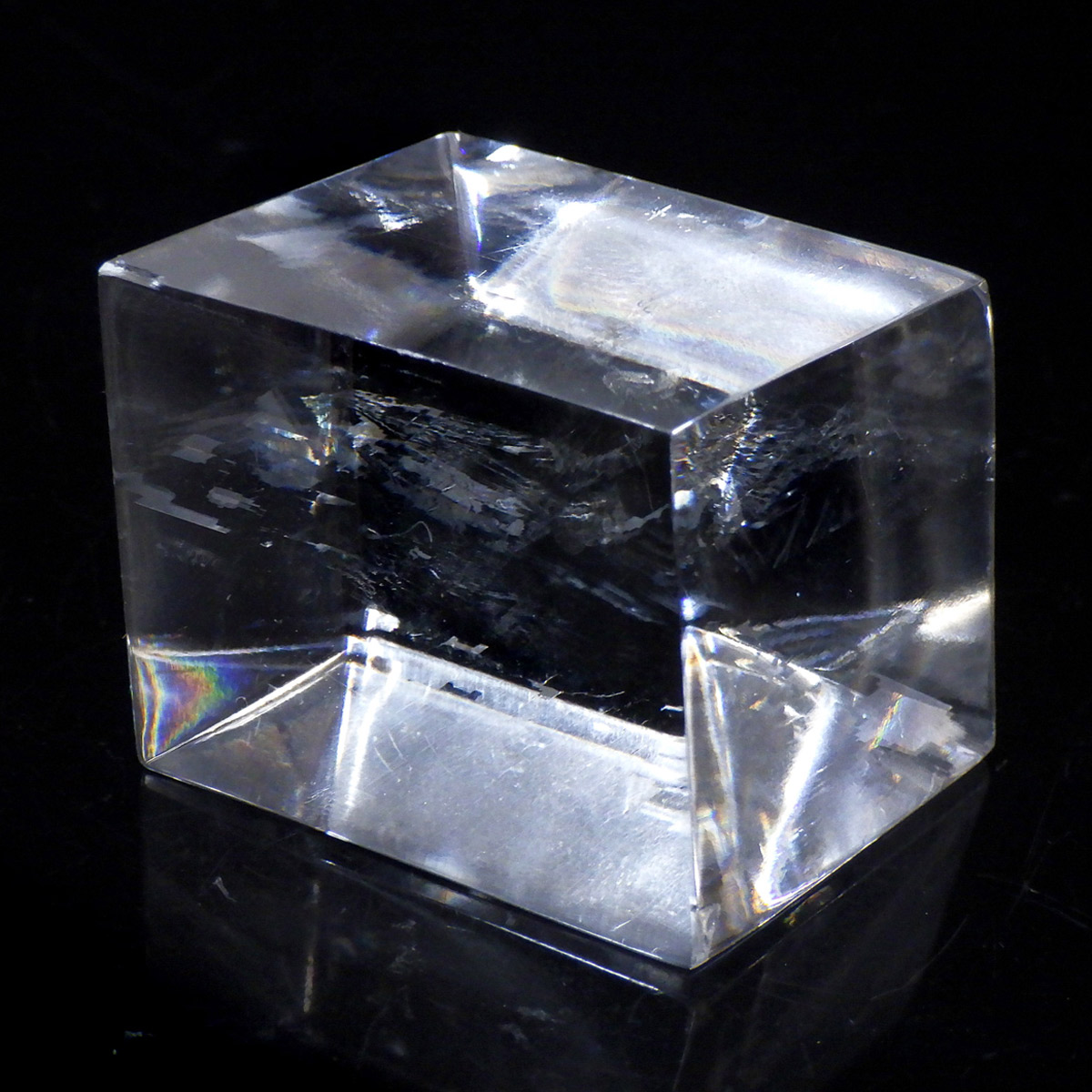 マダガスカル産のオプティカルカルサイトです。無色透明で良質のカルサイトのことをオプティカルカルサイトと呼びます。高い透明度を持ち、様々な角度からレインボーを見ることができます。複屈折という光学現象を持ち、文字の上に載せると二つにダブって見える「ダブリング(二重像現象)」のような現象を起こします。一定方向に向かって割れる劈開性によって平行四辺形の形になります。 他の産地のものよりマダガスカル産のオプティカルカルサイトはクラックが少なくきれいな印象です。