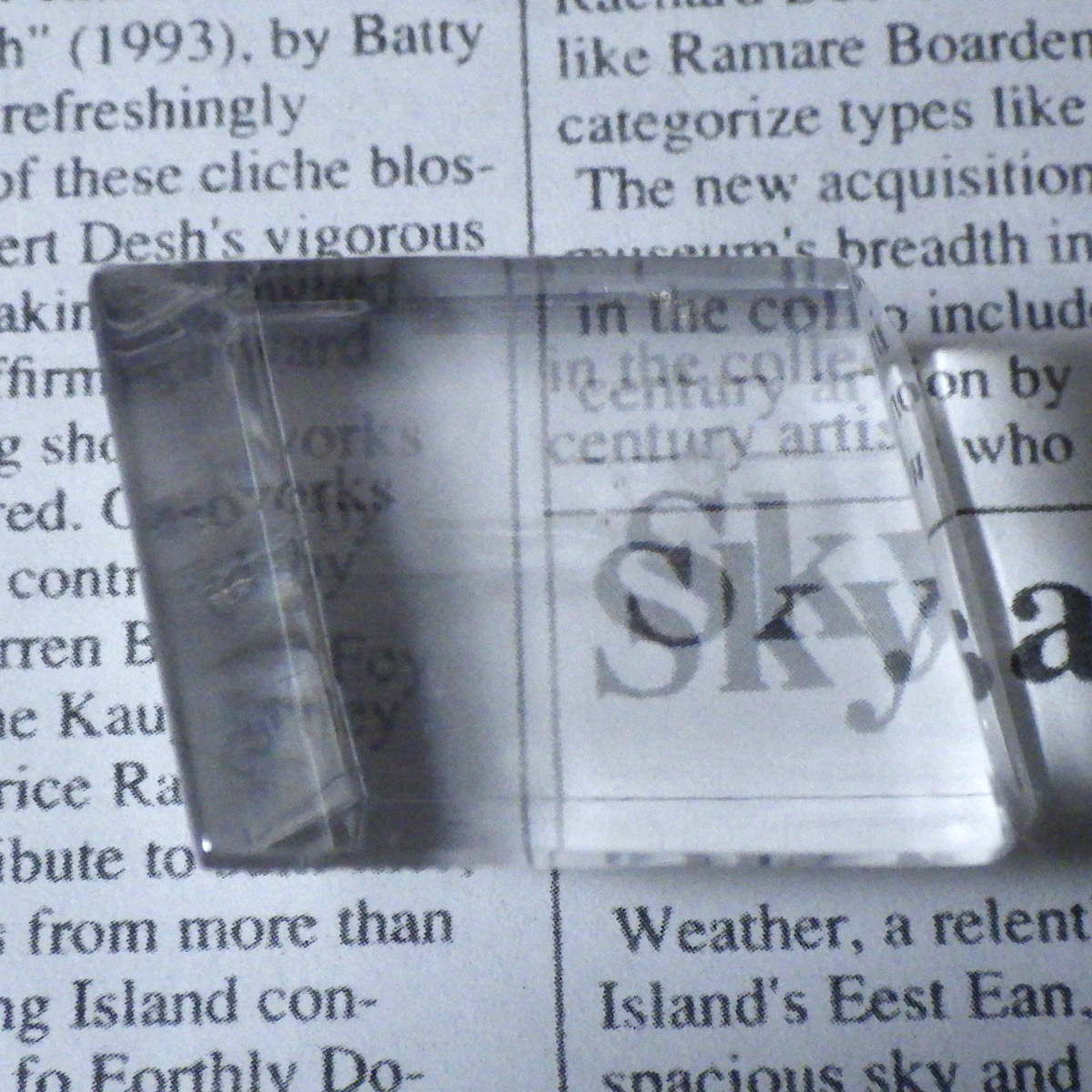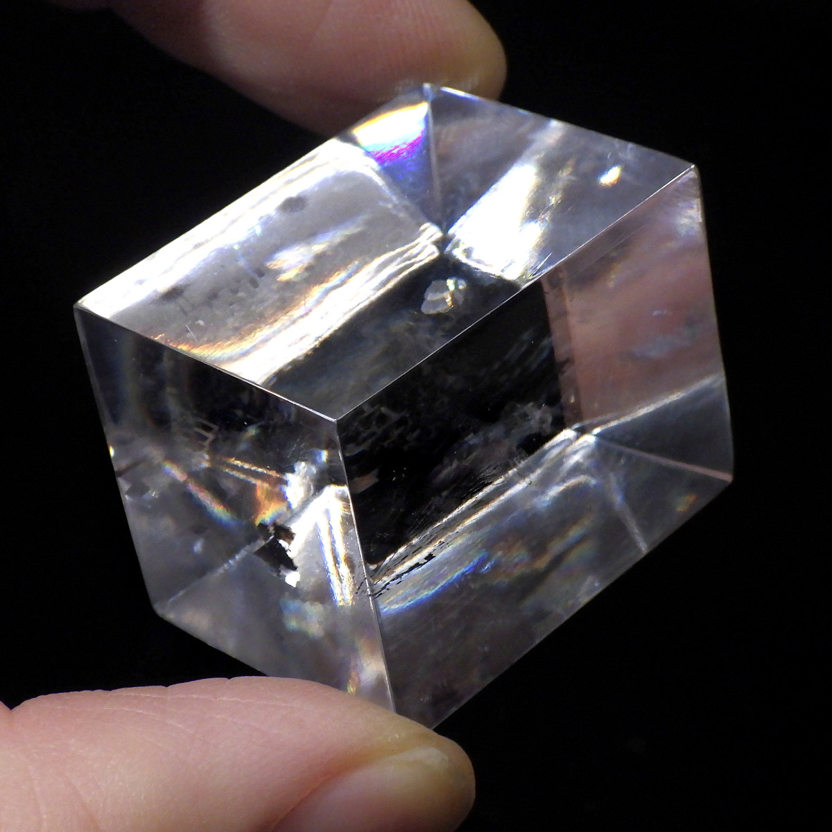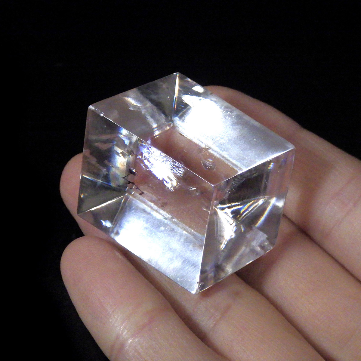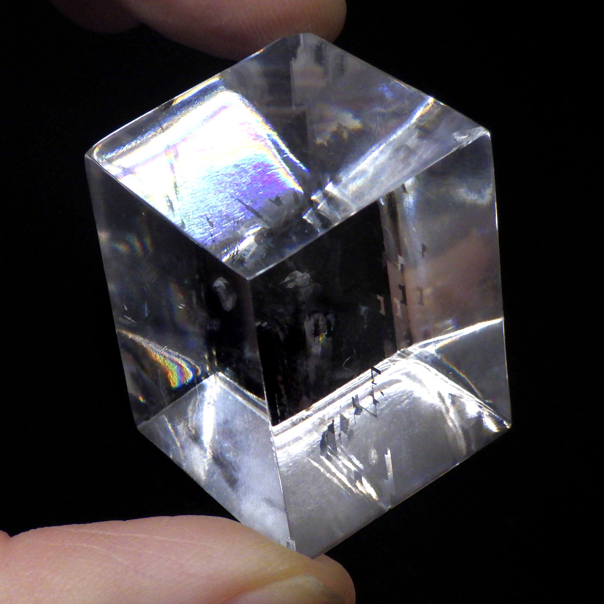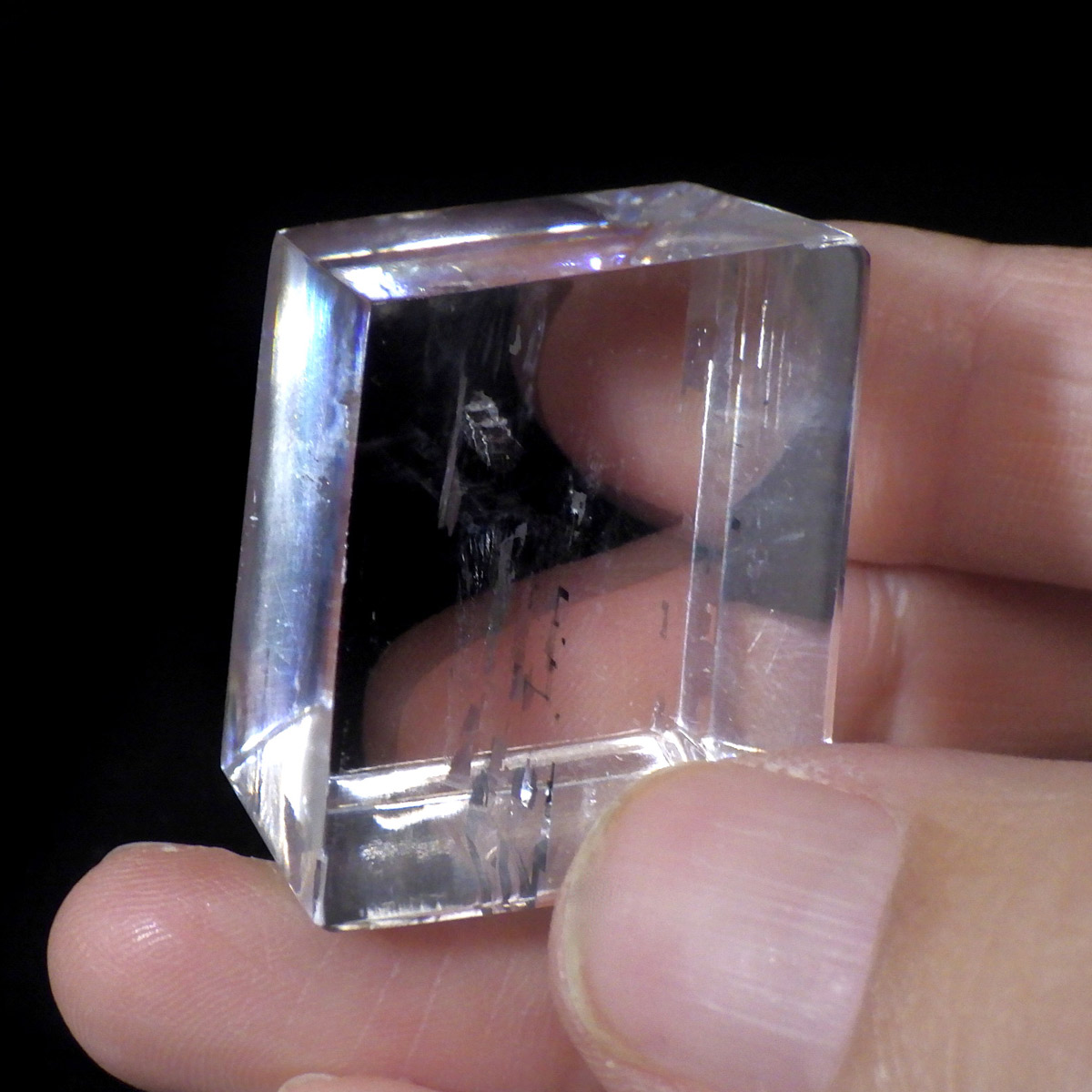 マダガスカル産のオプティカルカルサイトです。無色透明で良質のカルサイトのことをオプティカルカルサイトと呼びます。高い透明度を持ち、様々な角度からレインボーを見ることができます。複屈折という光学現象を持ち、文字の上に載せると二つにダブって見える「ダブリング(二重像現象)」のような現象を起こします。一定方向に向かって割れる劈開性によって平行四辺形の形になります。 他の産地のものよりマダガスカル産のオプティカルカルサイトはクラックが少なくきれいな印象です。