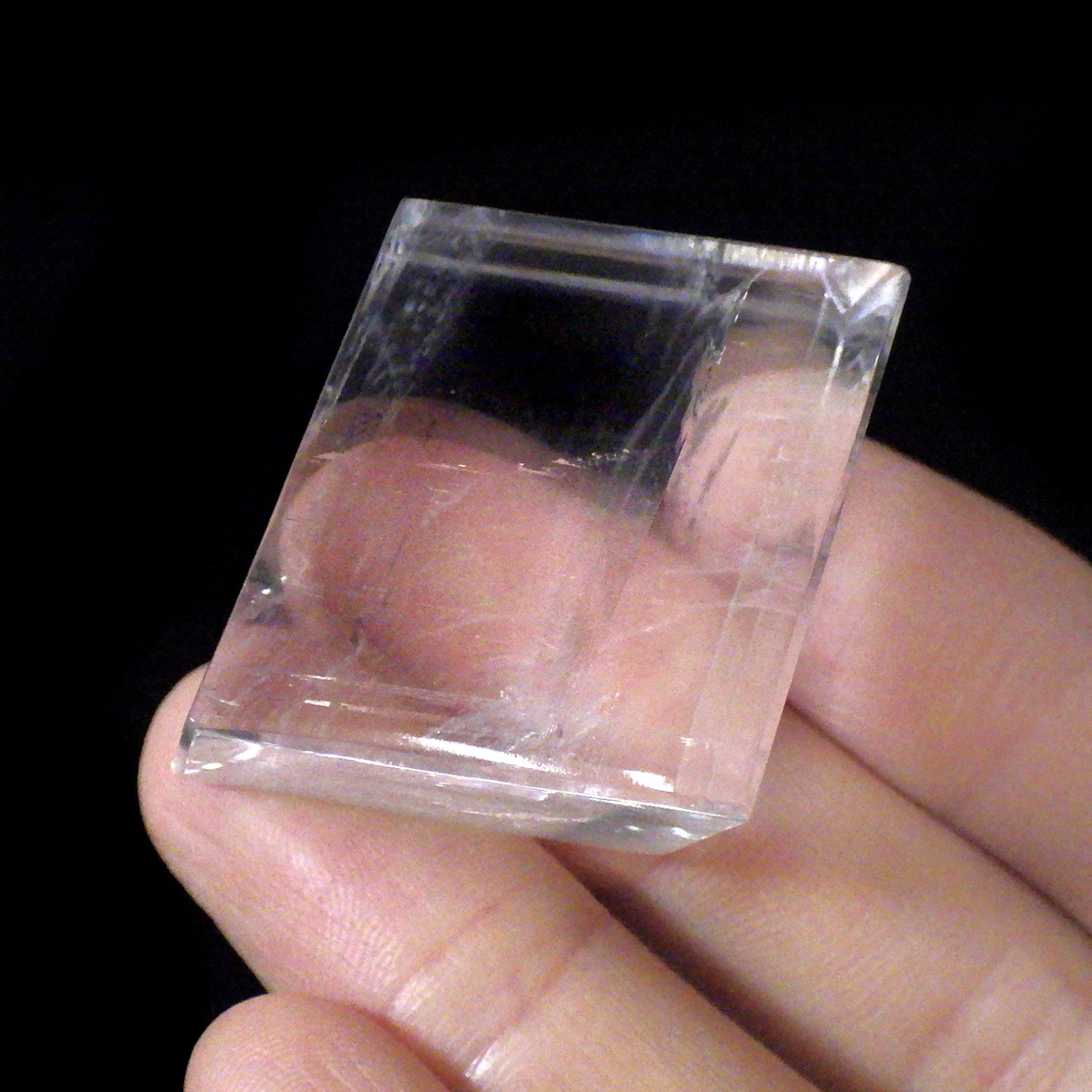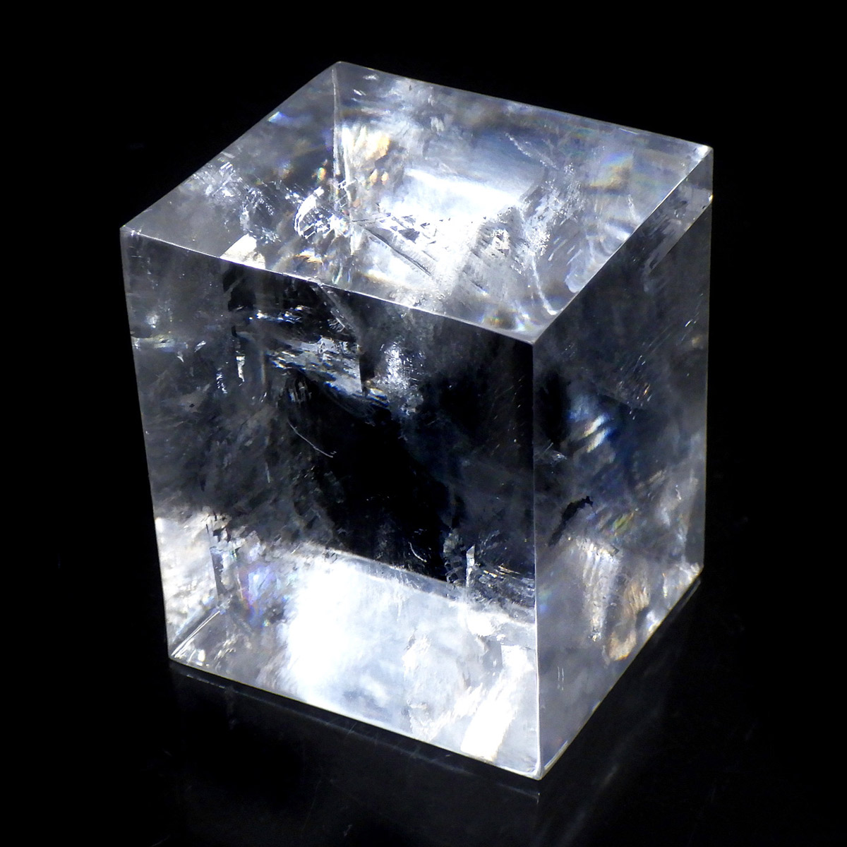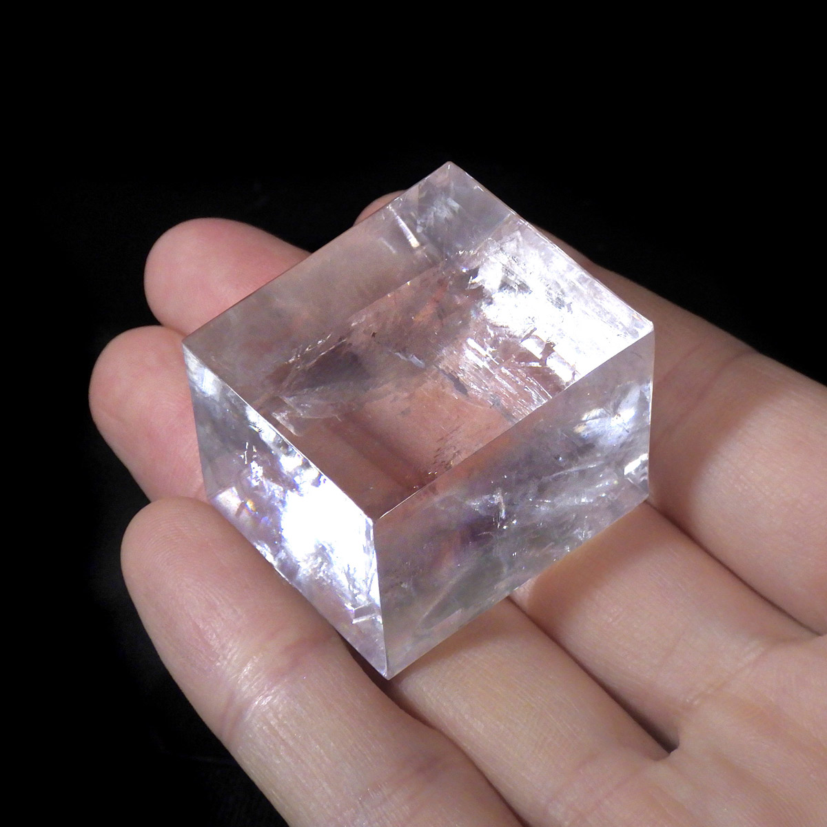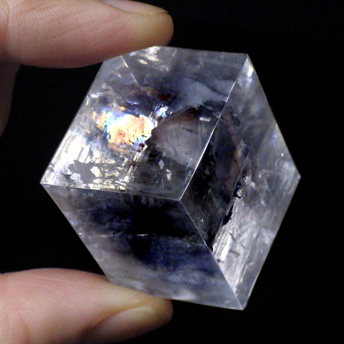 マダガスカル産のオプティカルカルサイトです。無色透明で良質のカルサイトのことをオプティカルカルサイトと呼びます。高い透明度を持ち、様々な角度からレインボーを見ることができます。複屈折という光学現象を持ち、文字の上に載せると二つにダブって見える「ダブリング(二重像現象)」のような現象を起こします。一定方向に向かって割れる劈開性によって平行四辺形の形になります。 他の産地のものよりマダガスカル産のオプティカルカルサイトはクラックが少なくきれいな印象です。