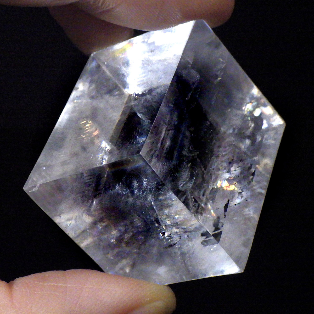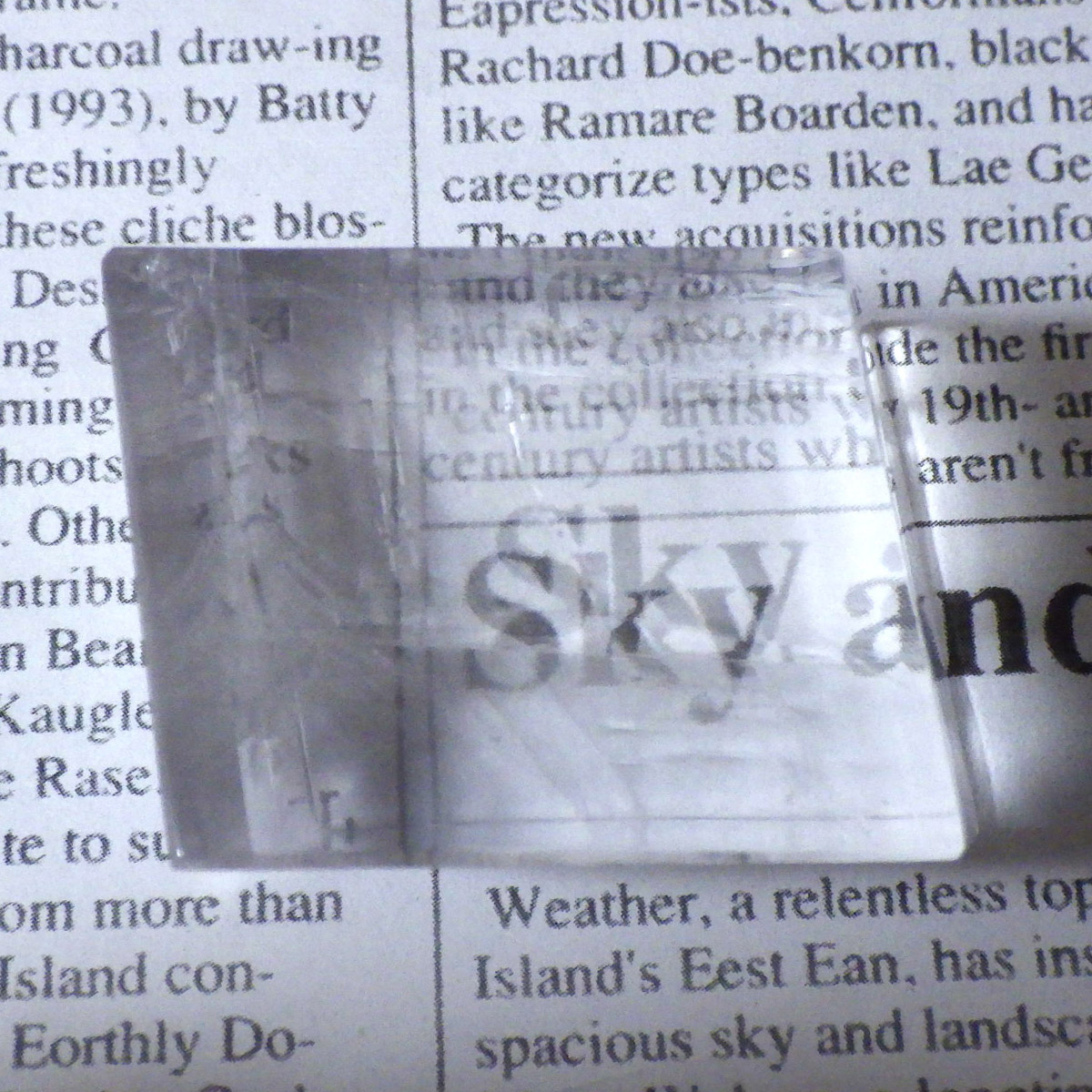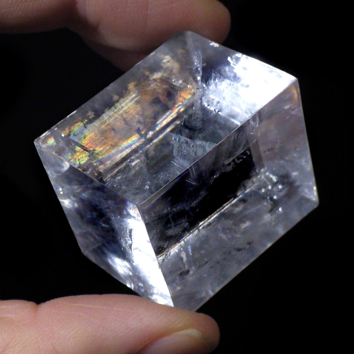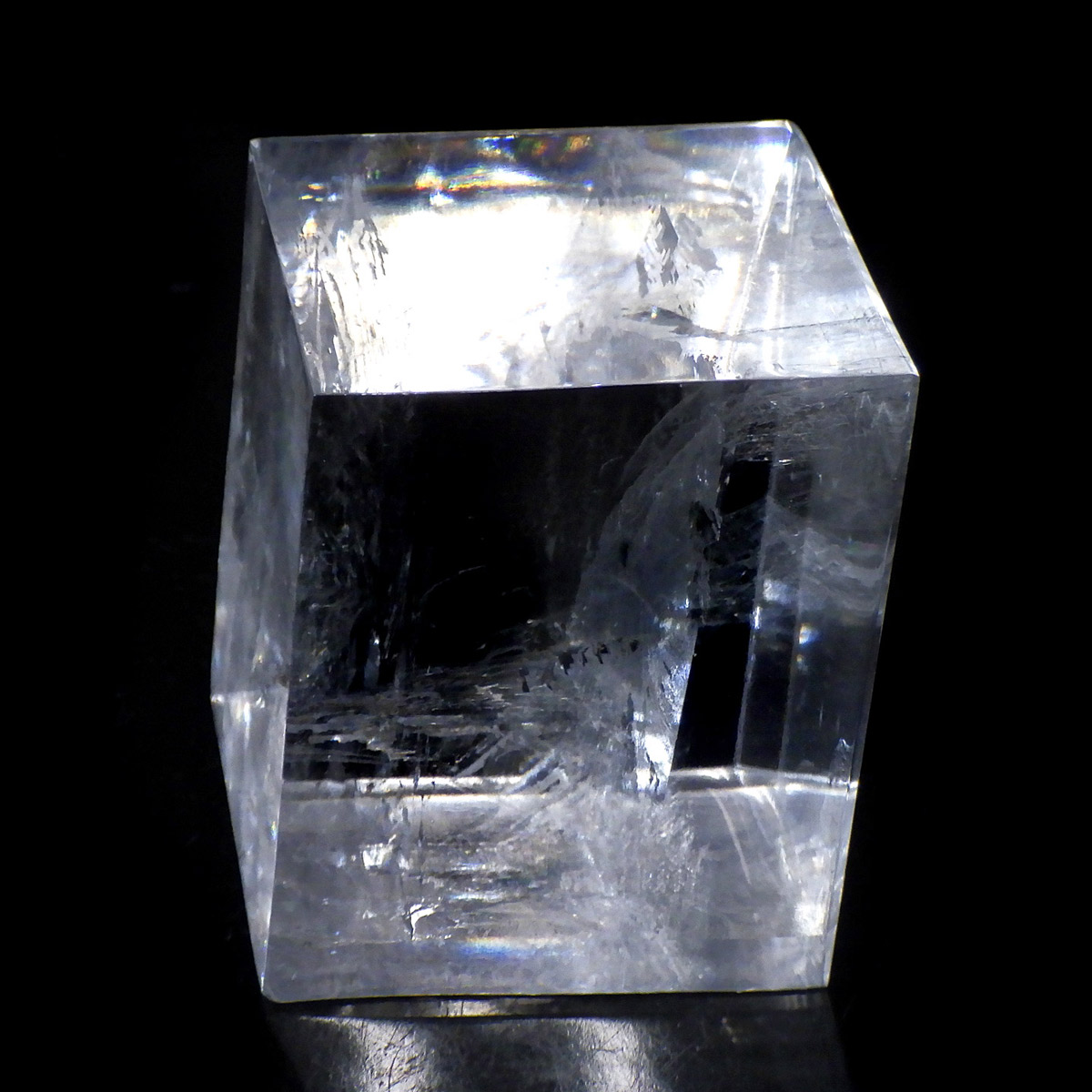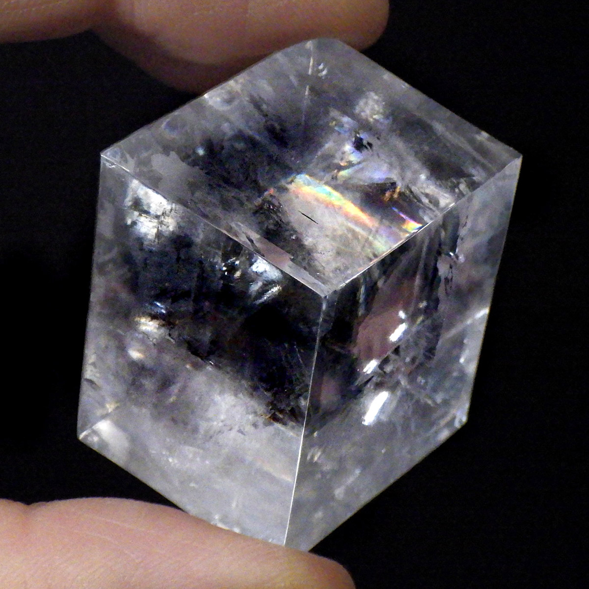 マダガスカル産のオプティカルカルサイトです。無色透明で良質のカルサイトのことをオプティカルカルサイトと呼びます。高い透明度を持ち、様々な角度からレインボーを見ることができます。複屈折という光学現象を持ち、文字の上に載せると二つにダブって見える「ダブリング(二重像現象)」のような現象を起こします。一定方向に向かって割れる劈開性によって平行四辺形の形になります。 他の産地のものよりマダガスカル産のオプティカルカルサイトはクラックが少なくきれいな印象です。