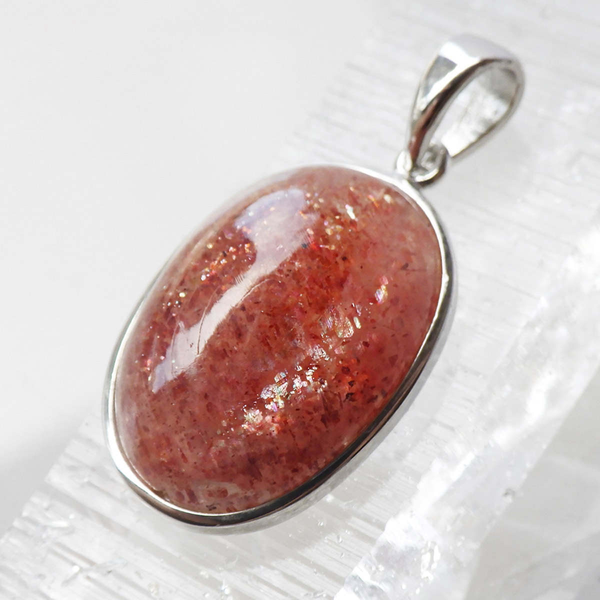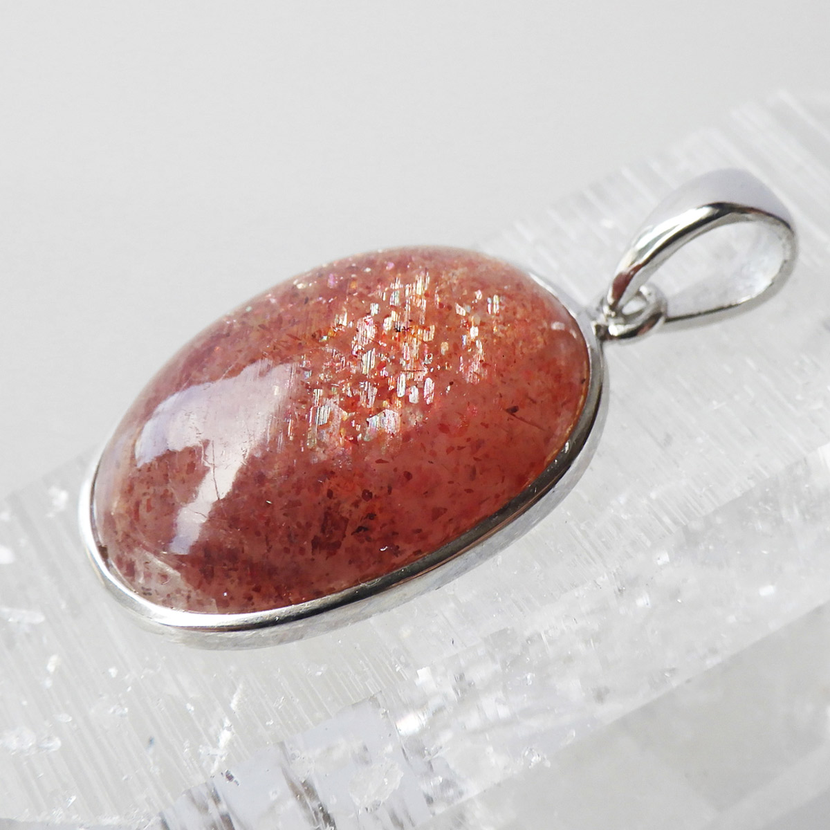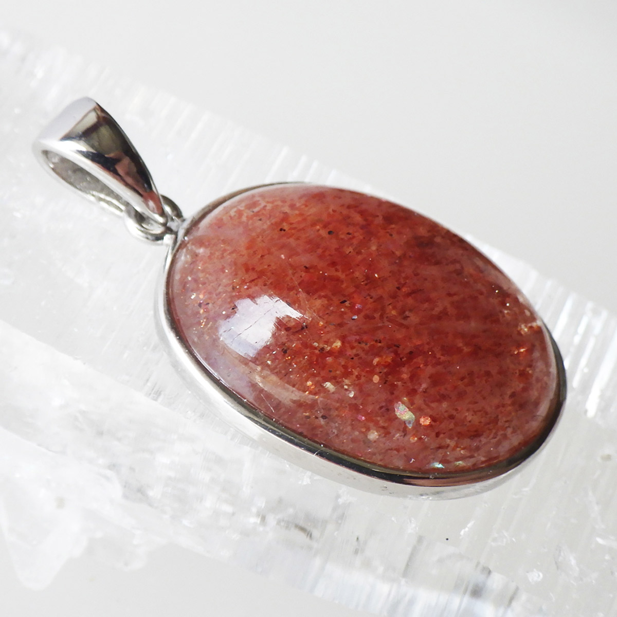 インド産のサンストーン、ペンダントトップです。 灼熱の太陽を彷彿とするオレンジ色のキラキラした石、 それがサンストーンです。太陽のように表面が輝き、キメの細かいマイカのキラキラとした光が魅力的に現れます。 サンストーンは長石に分類されることもあり、白濁した個体が多いのですが、高い透明感に恵まれた見事なペンダントトップです。かわいい楕円型でサイズも大きく存在感があります。