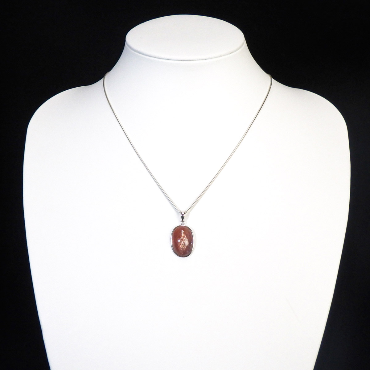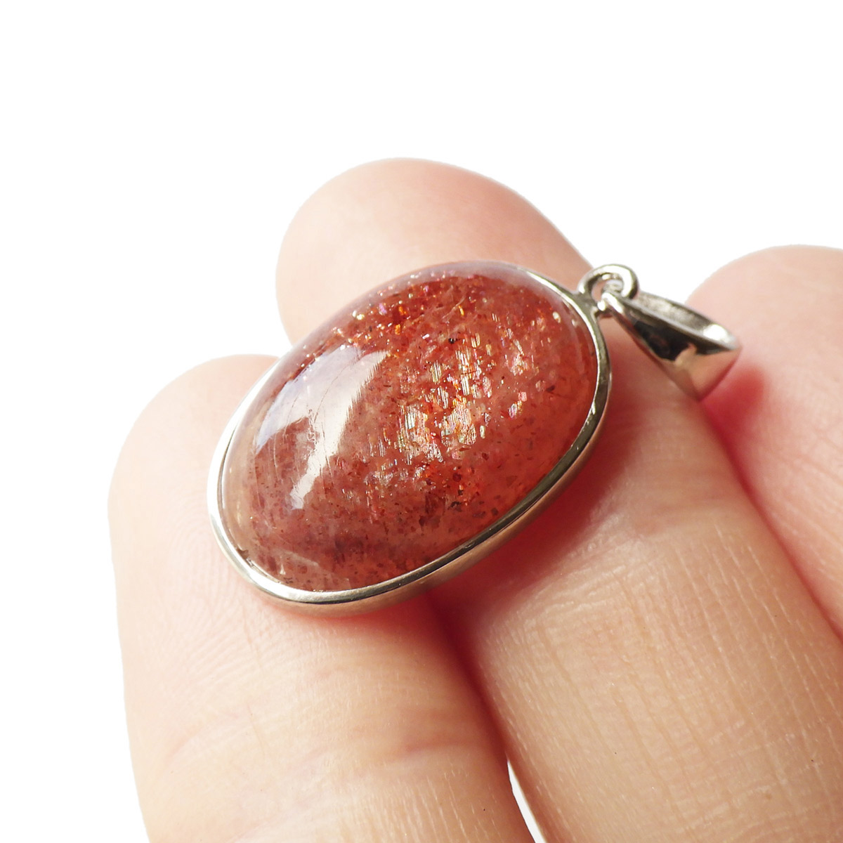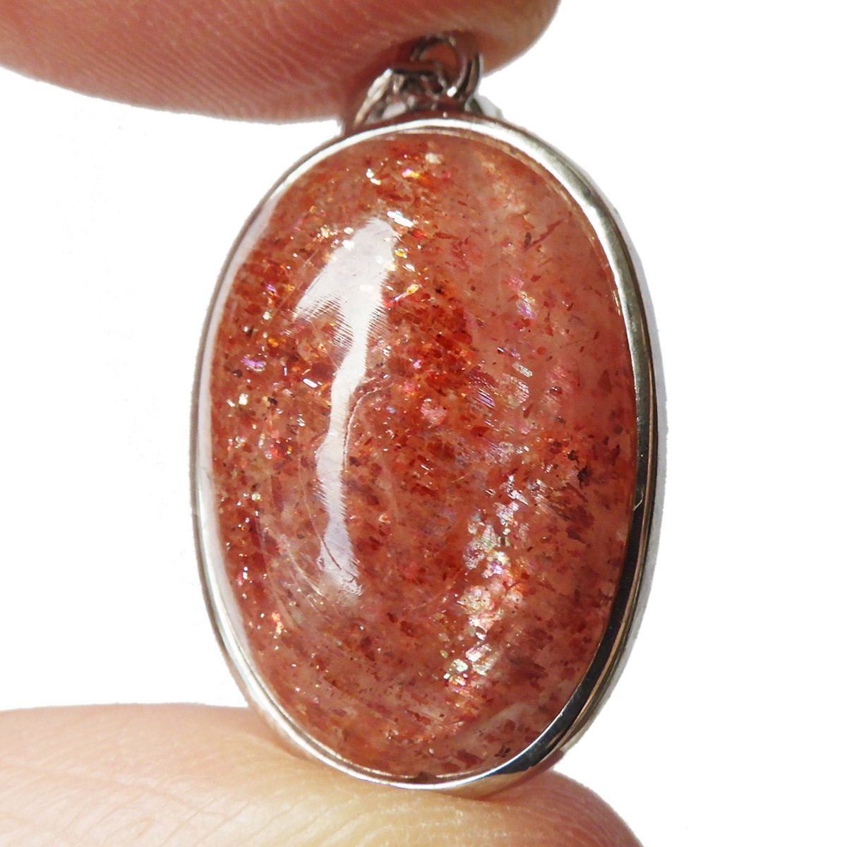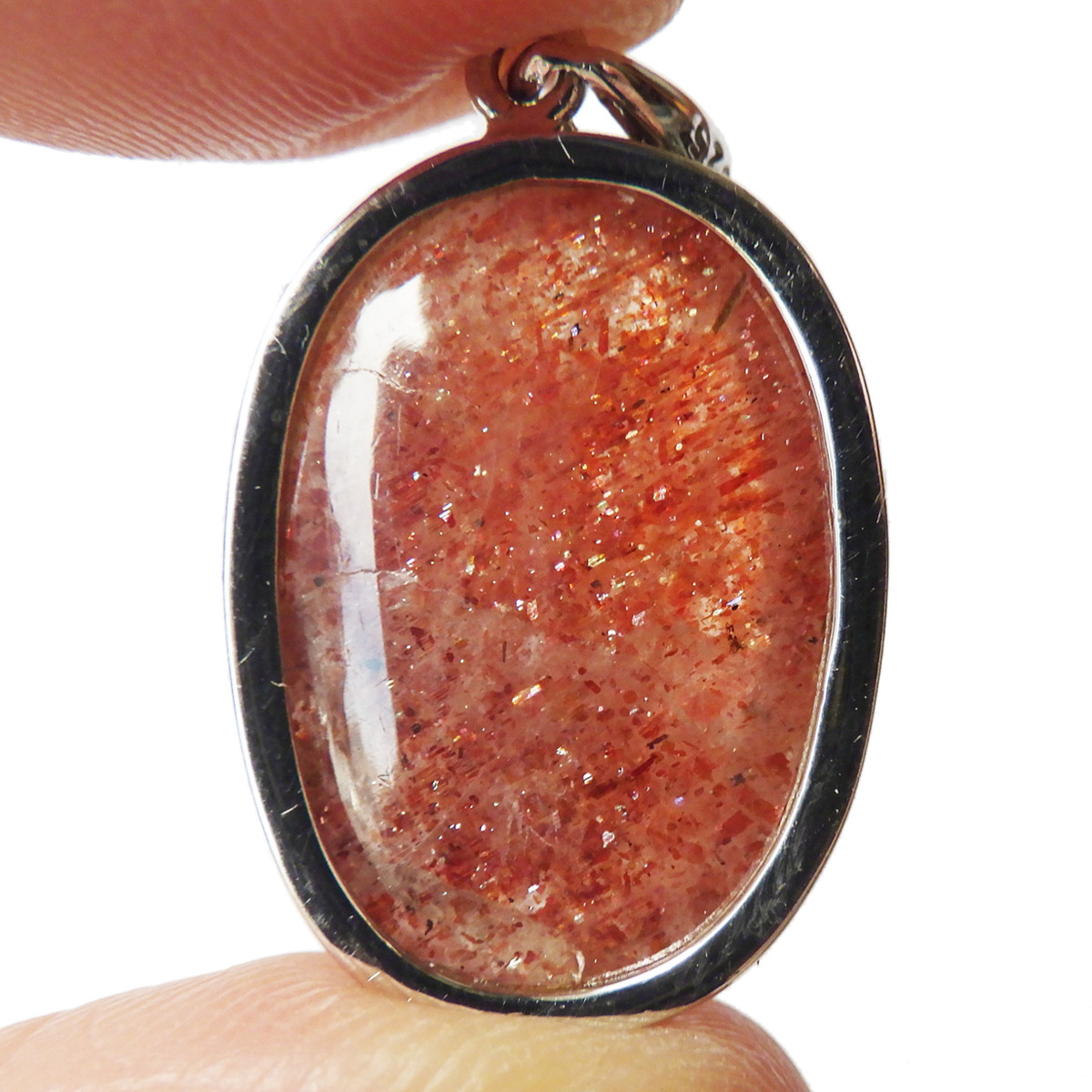 インド産のサンストーン、ペンダントトップです。 灼熱の太陽を彷彿とするオレンジ色のキラキラした石、 それがサンストーンです。太陽のように表面が輝き、キメの細かいマイカのキラキラとした光が魅力的に現れます。 サンストーンは長石に分類されることもあり、白濁した個体が多いのですが、高い透明感に恵まれた見事なペンダントトップです。かわいい楕円型でサイズも大きく存在感があります。