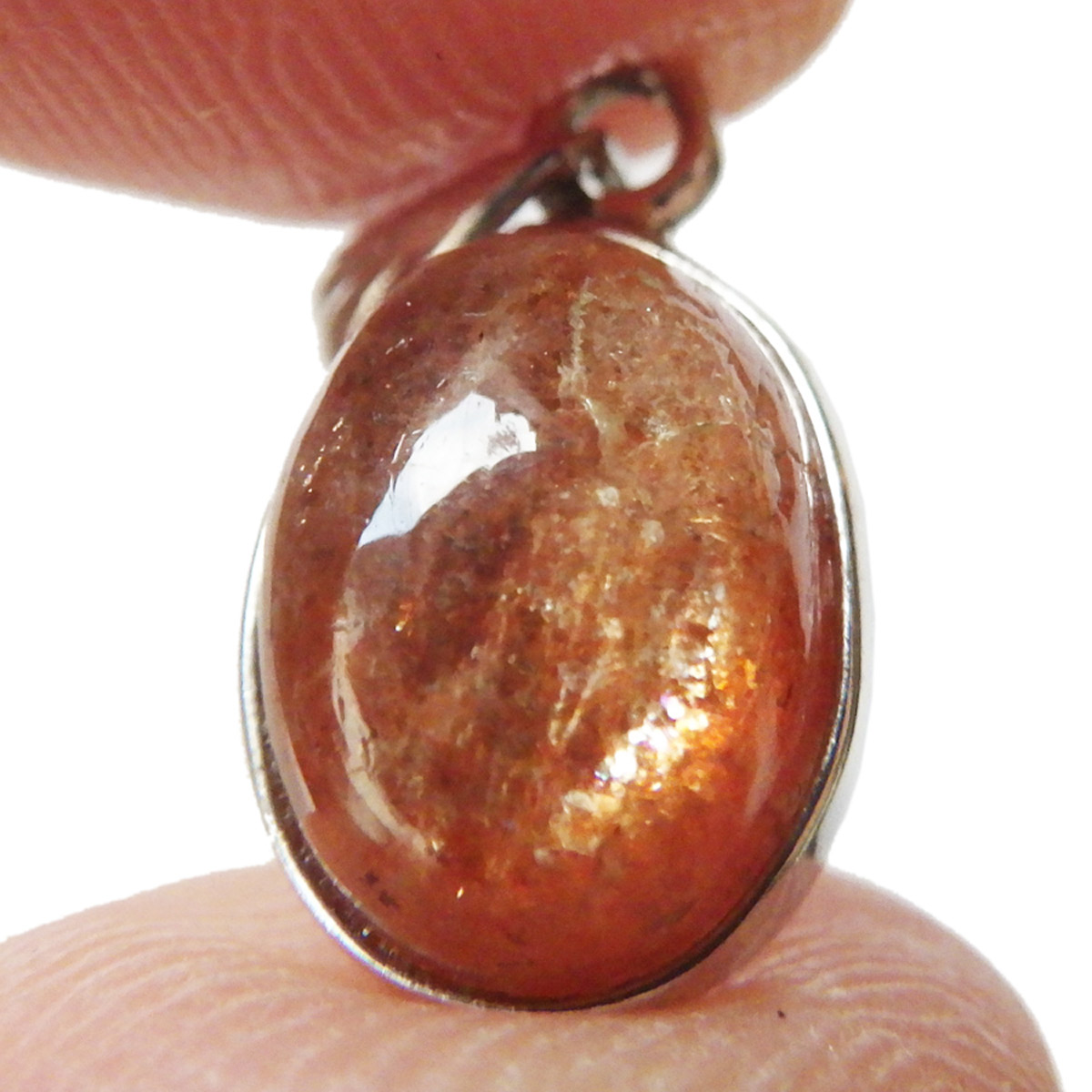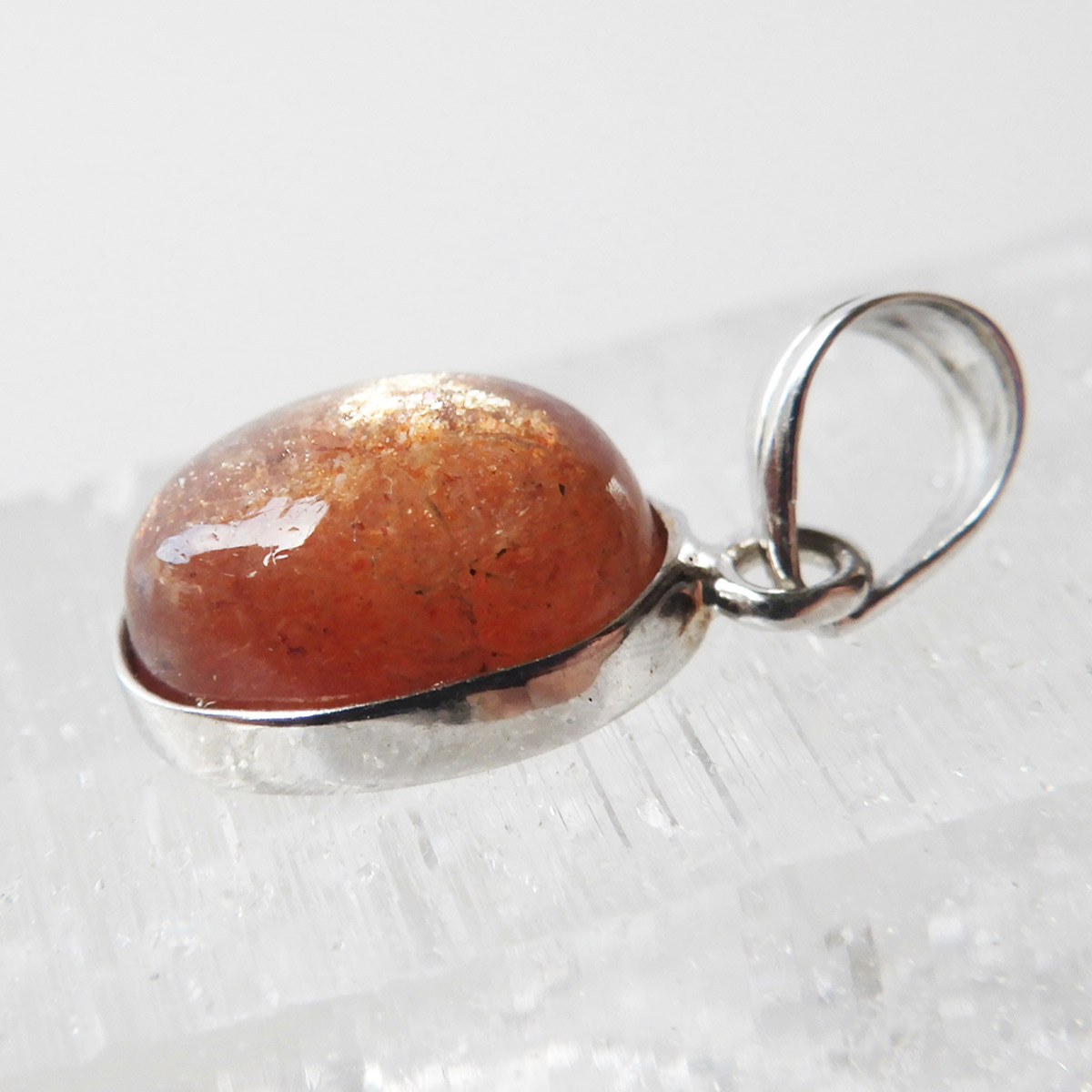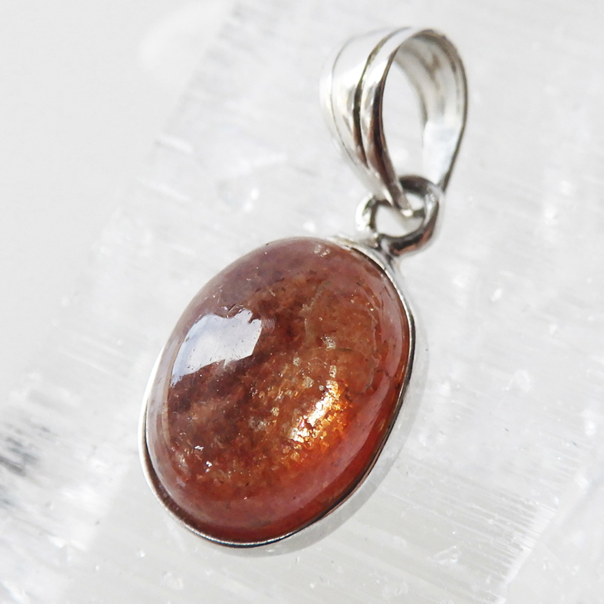 インド産のサンストーン、ペンダントトップです。 灼熱の太陽を彷彿とするオレンジ色のキラキラした石、 それがサンストーンです。太陽のように表面が輝き、キメの細かいマイカのキラキラとした光が魅力的に現れます。 楕円型で可愛らしいペンダントトップです。