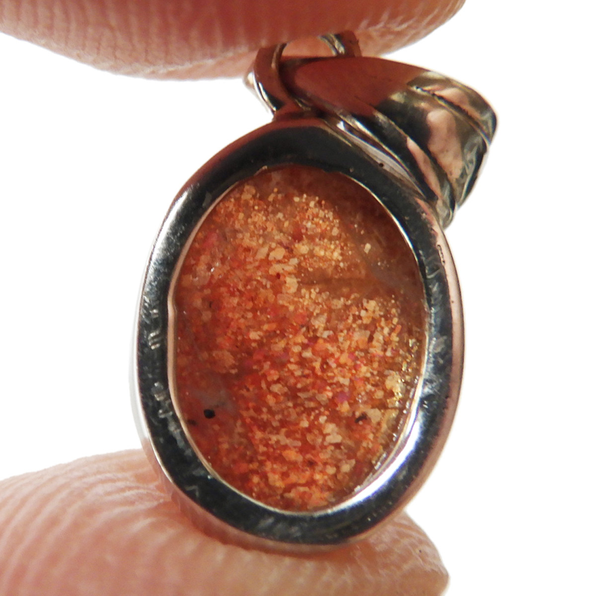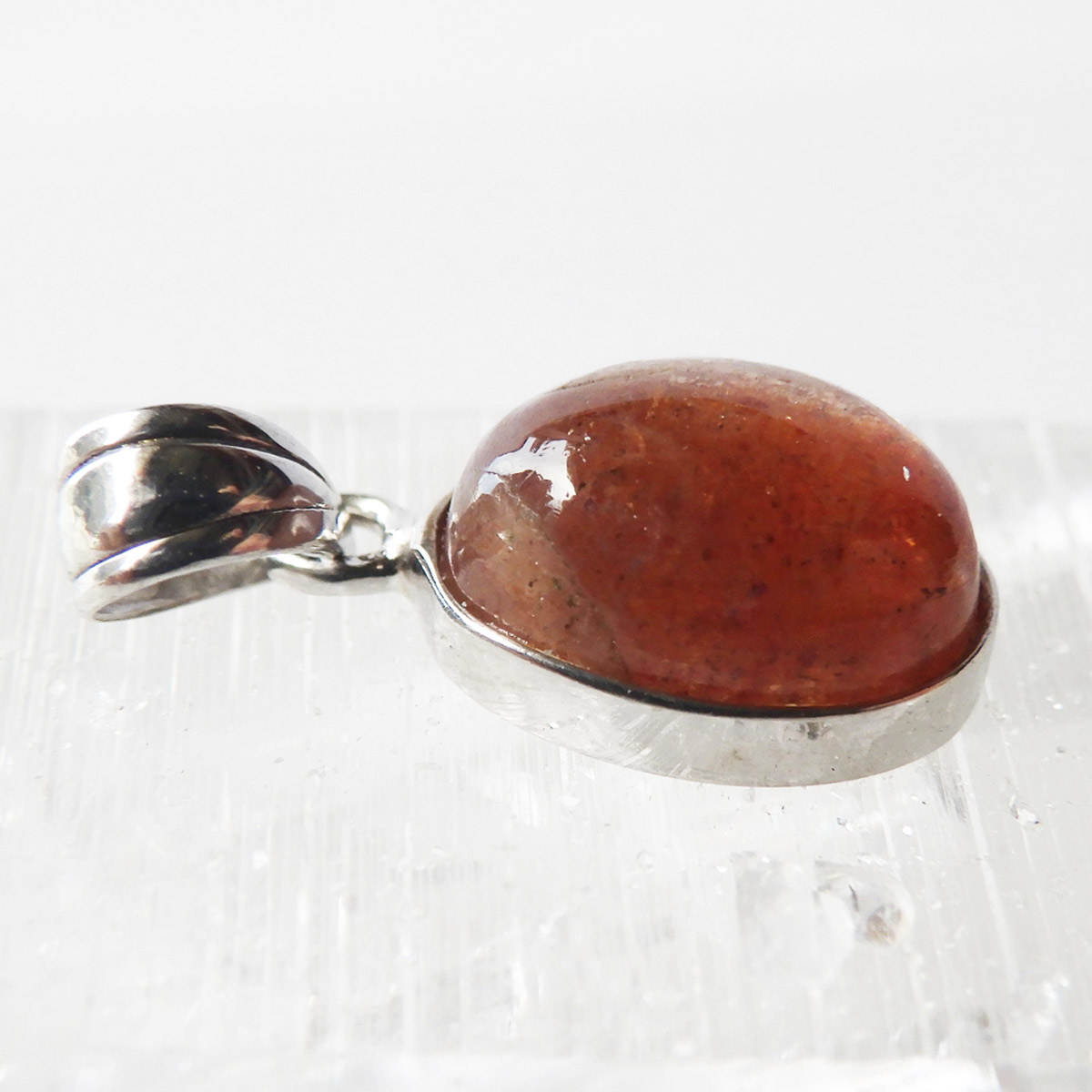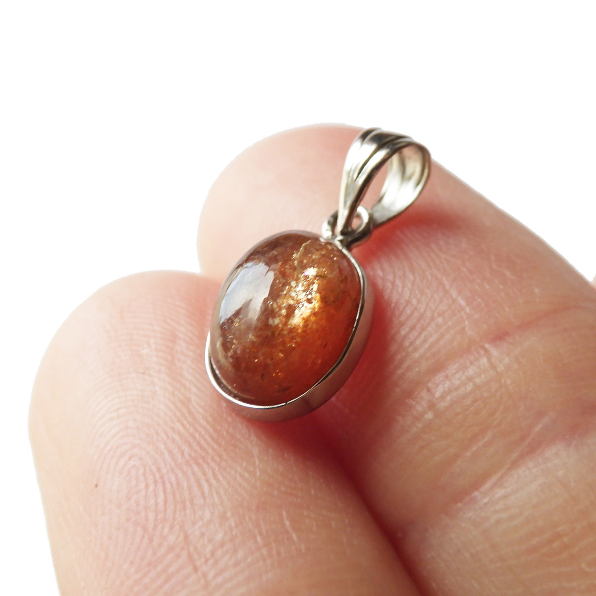 インド産のサンストーン、ペンダントトップです。 灼熱の太陽を彷彿とするオレンジ色のキラキラした石、 それがサンストーンです。太陽のように表面が輝き、キメの細かいマイカのキラキラとした光が魅力的に現れます。 楕円型で可愛らしいペンダントトップです。