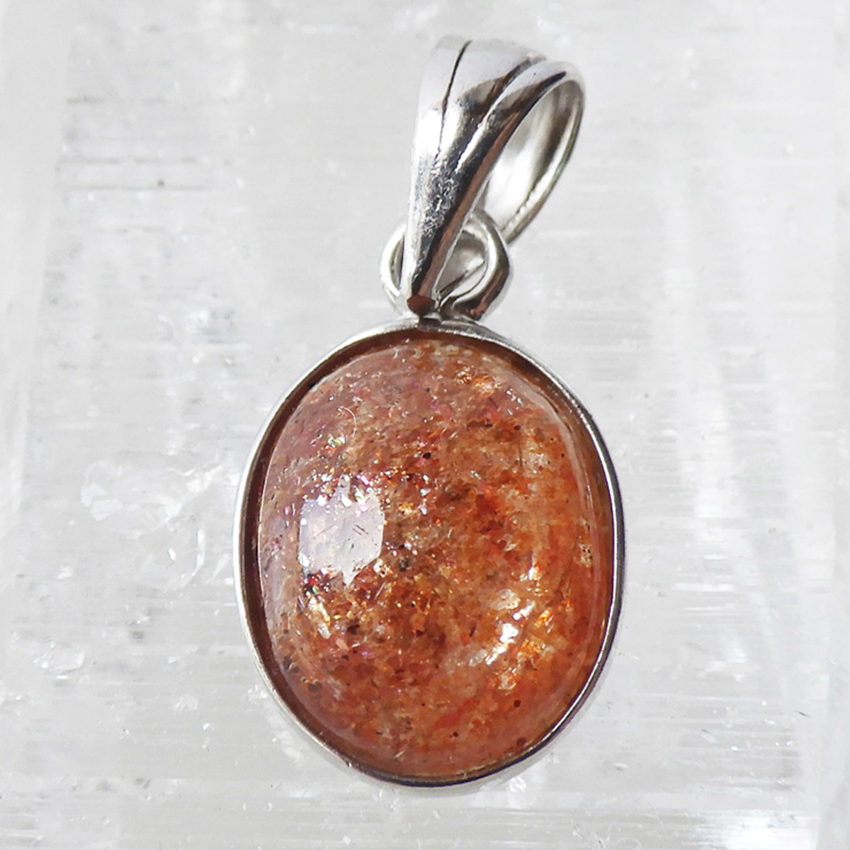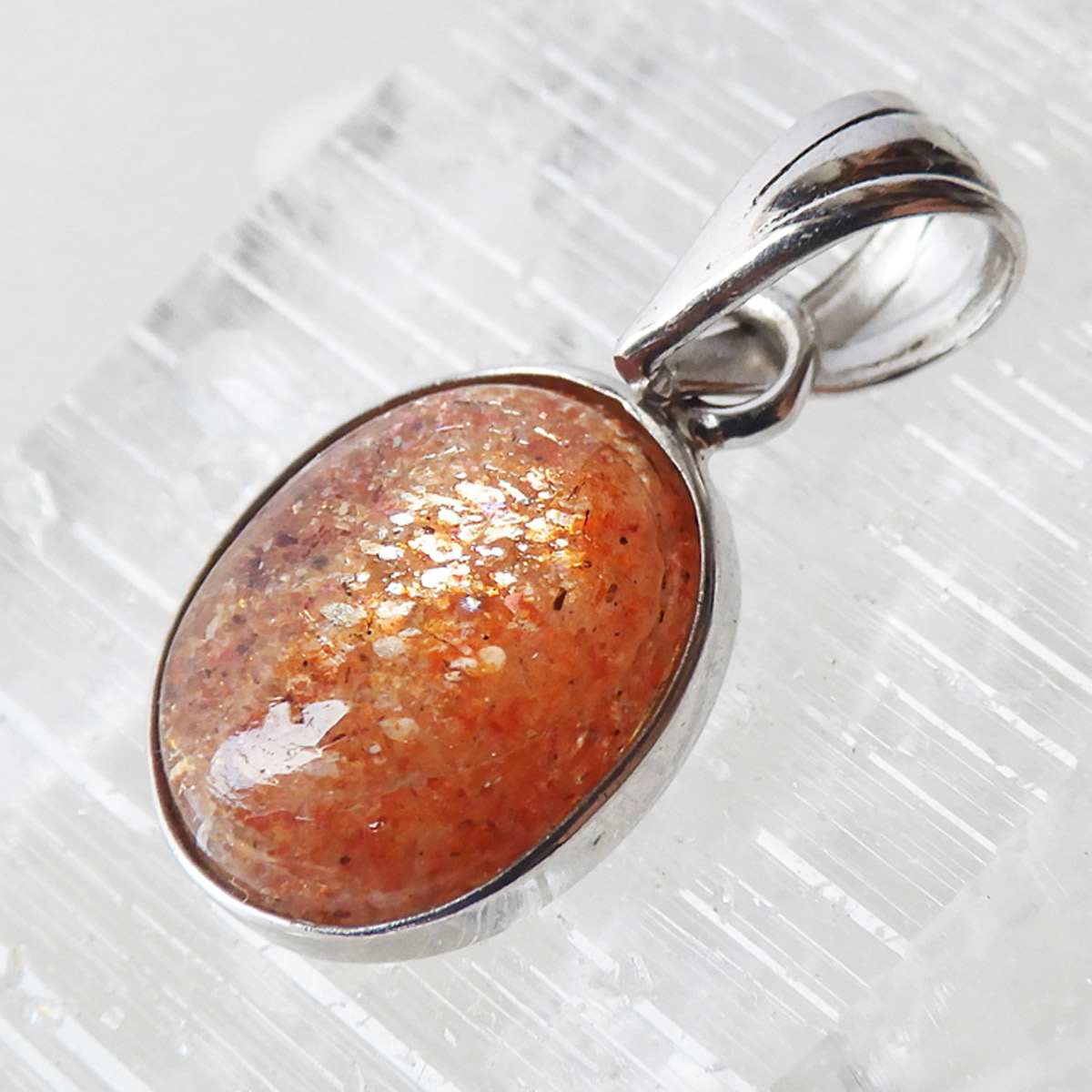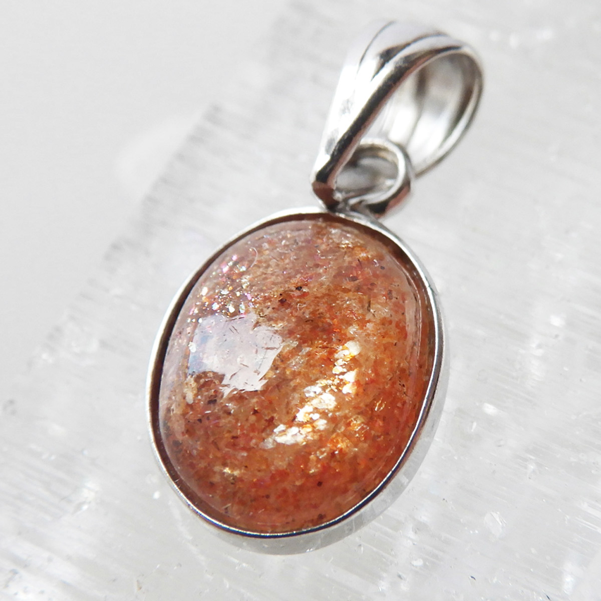インド産のサンストーン、ペンダントトップです。 灼熱の太陽を彷彿とするオレンジ色のキラキラした石、 それがサンストーンです。太陽のように表面が輝き、キメの細かいマイカのキラキラとした光が魅力的に現れます。 楕円型で可愛らしいペンダントトップです。