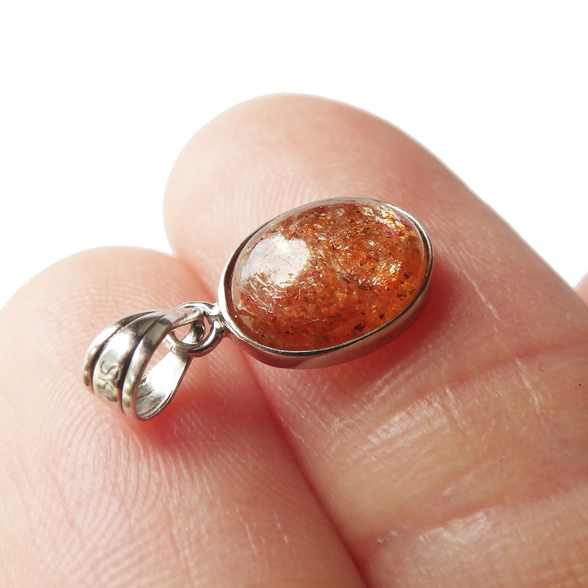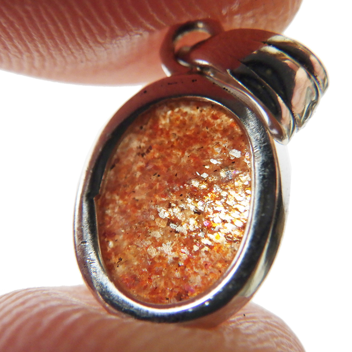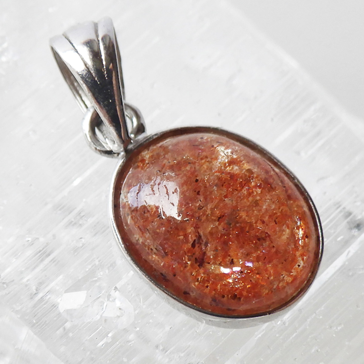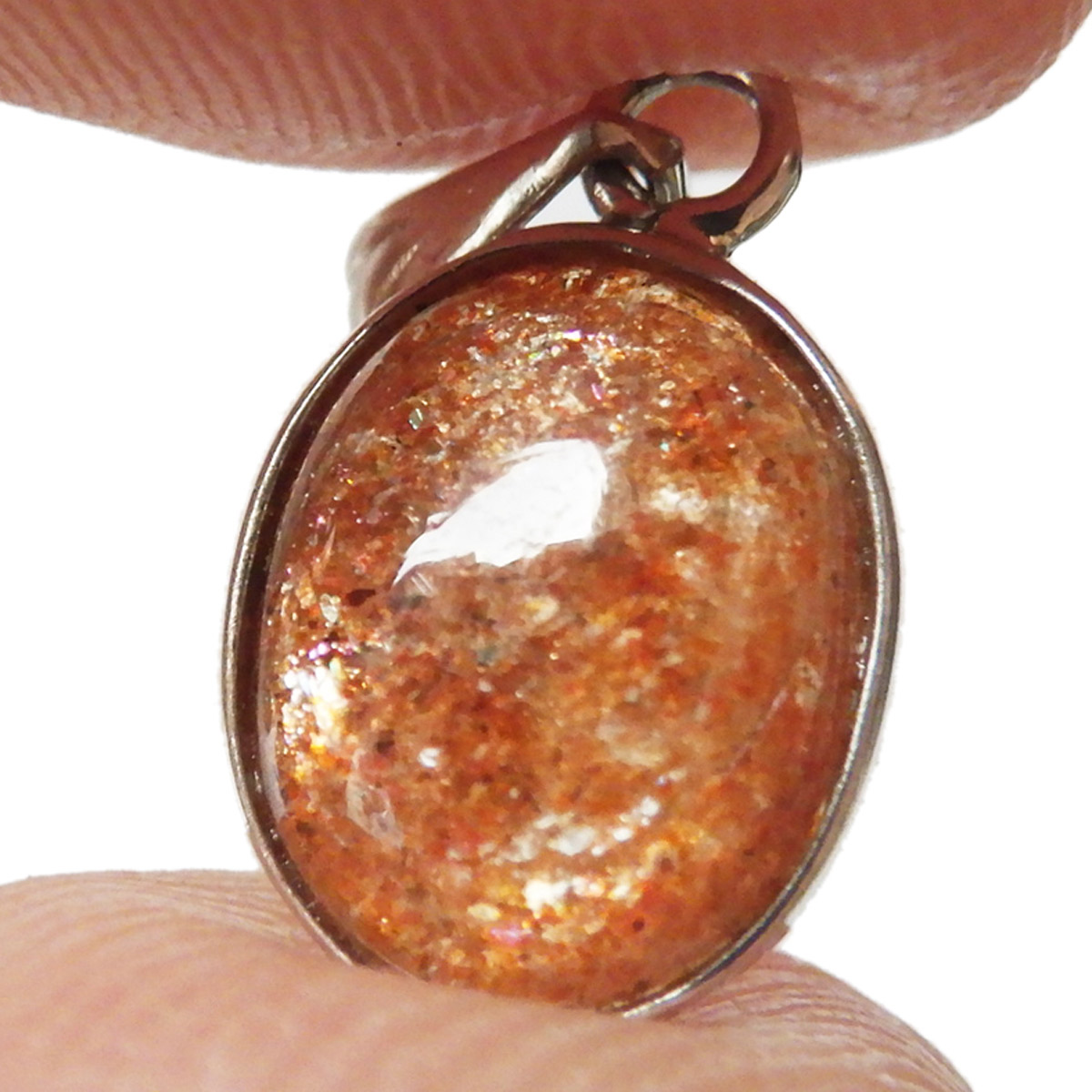 インド産のサンストーン、ペンダントトップです。 灼熱の太陽を彷彿とするオレンジ色のキラキラした石、 それがサンストーンです。太陽のように表面が輝き、キメの細かいマイカのキラキラとした光が魅力的に現れます。 楕円型で可愛らしいペンダントトップです。