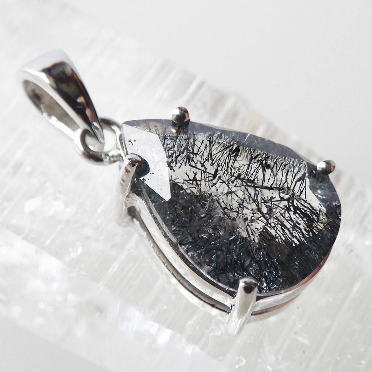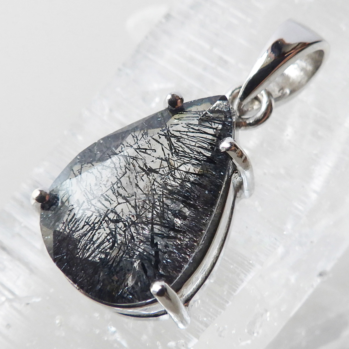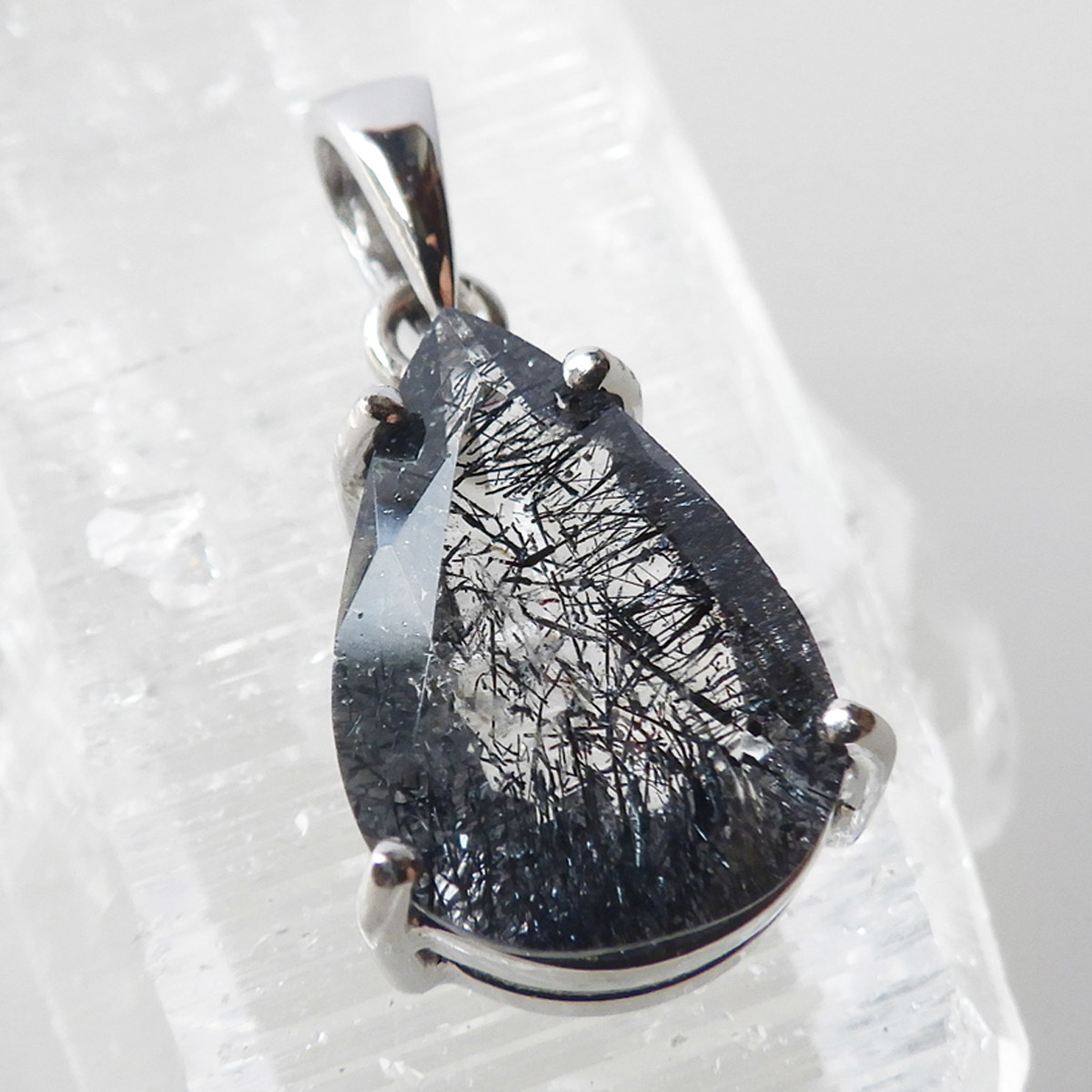 ブラジル産プラチナゲーサイトインクォーツのペンダントトップです。しずく形にカットしたかわいらしいペンダントです。ゲーサイトは和名で針鉄鉱と呼ばれ、その名の通り針状結晶を見せます。ブラックスーパーセブンにも近い存在です。透明度の高い水晶中にびっしりと針が入っており、角度を変えるたびにキラキラと表情が変わりとても美しいです。中央付近にチラッと赤い鉱物も見られます。ファセットカットによるキラキラとゲーサイトの細かな結晶のキラキラとした輝きが相まってとても魅力的です。