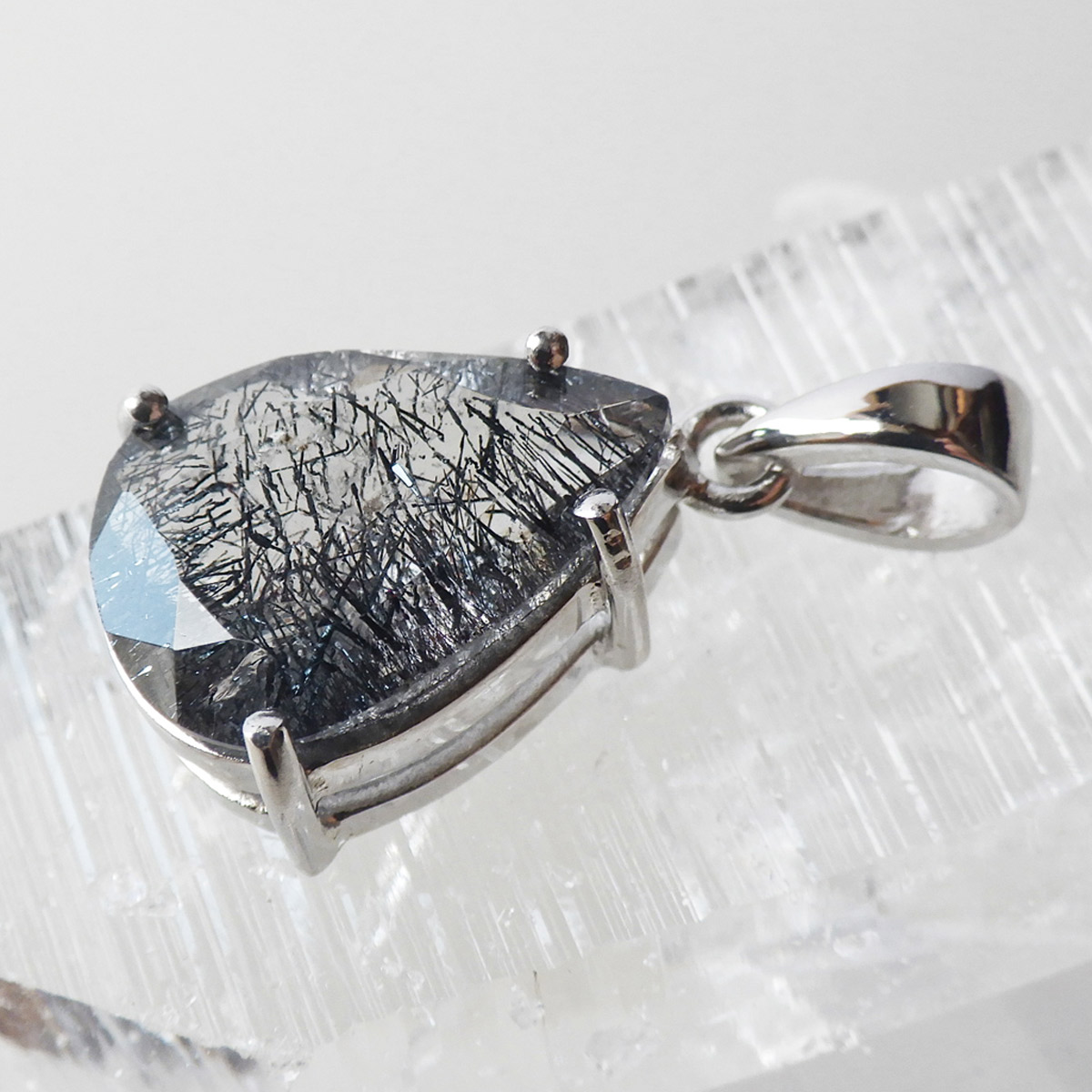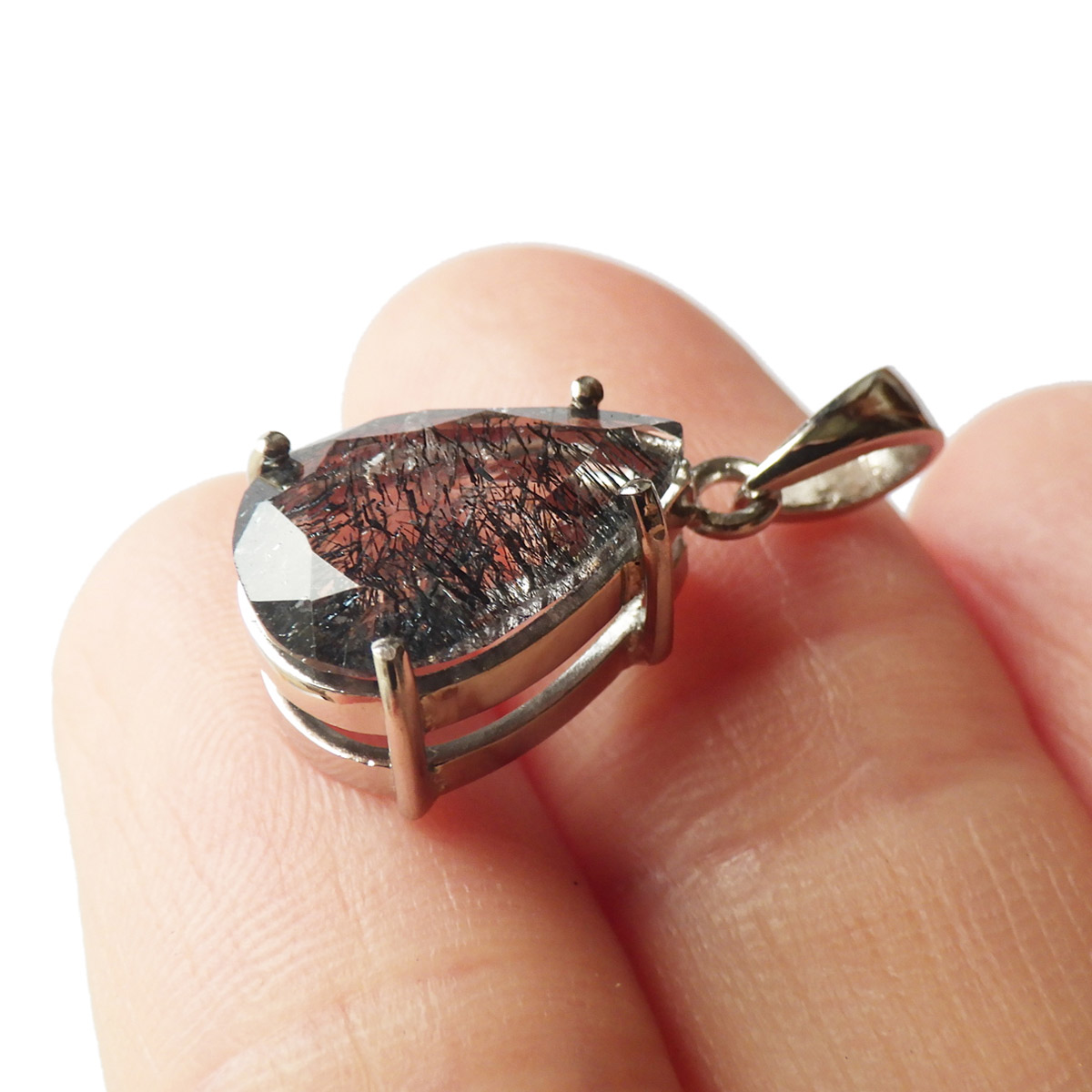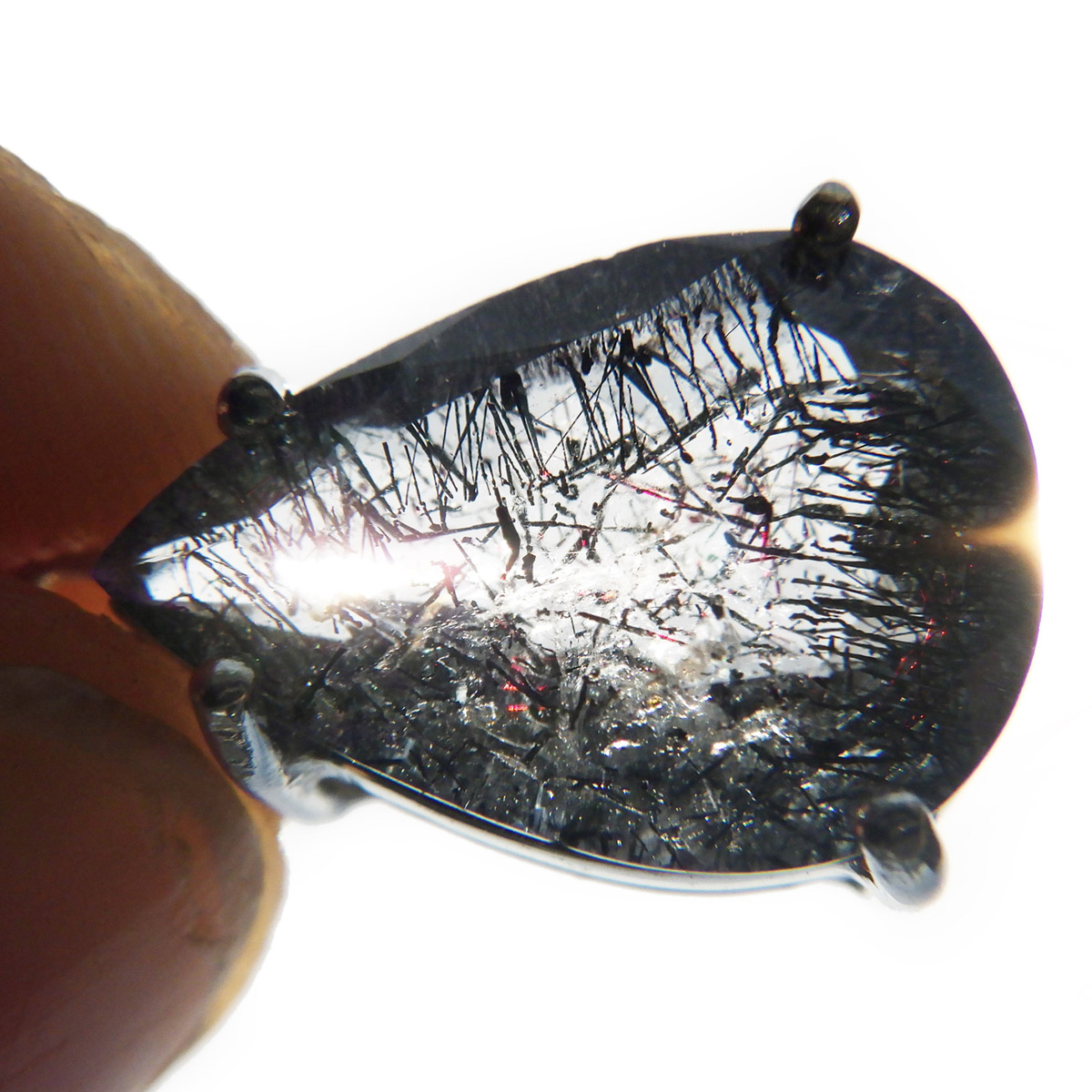 ブラジル産プラチナゲーサイトインクォーツのペンダントトップです。しずく形にカットしたかわいらしいペンダントです。ゲーサイトは和名で針鉄鉱と呼ばれ、その名の通り針状結晶を見せます。ブラックスーパーセブンにも近い存在です。透明度の高い水晶中にびっしりと針が入っており、角度を変えるたびにキラキラと表情が変わりとても美しいです。中央付近にチラッと赤い鉱物も見られます。ファセットカットによるキラキラとゲーサイトの細かな結晶のキラキラとした輝きが相まってとても魅力的です。