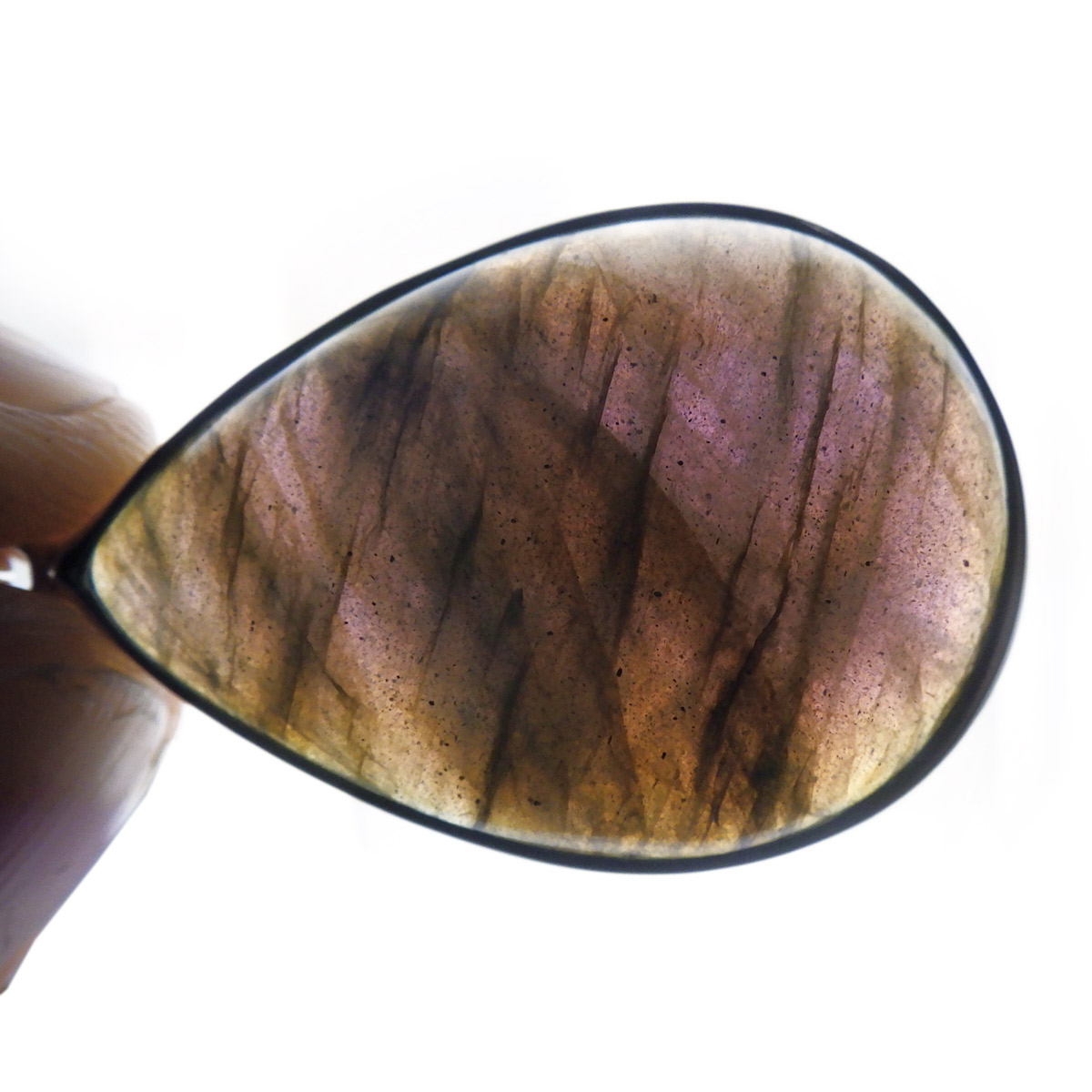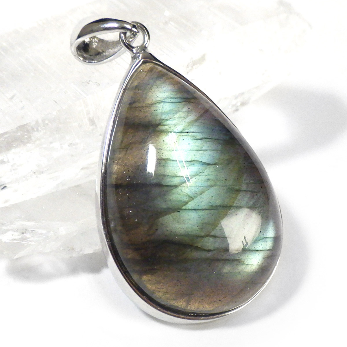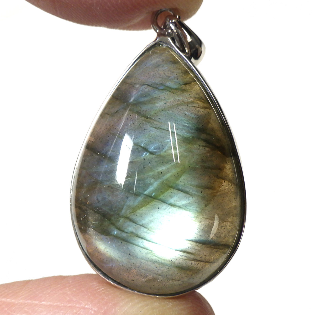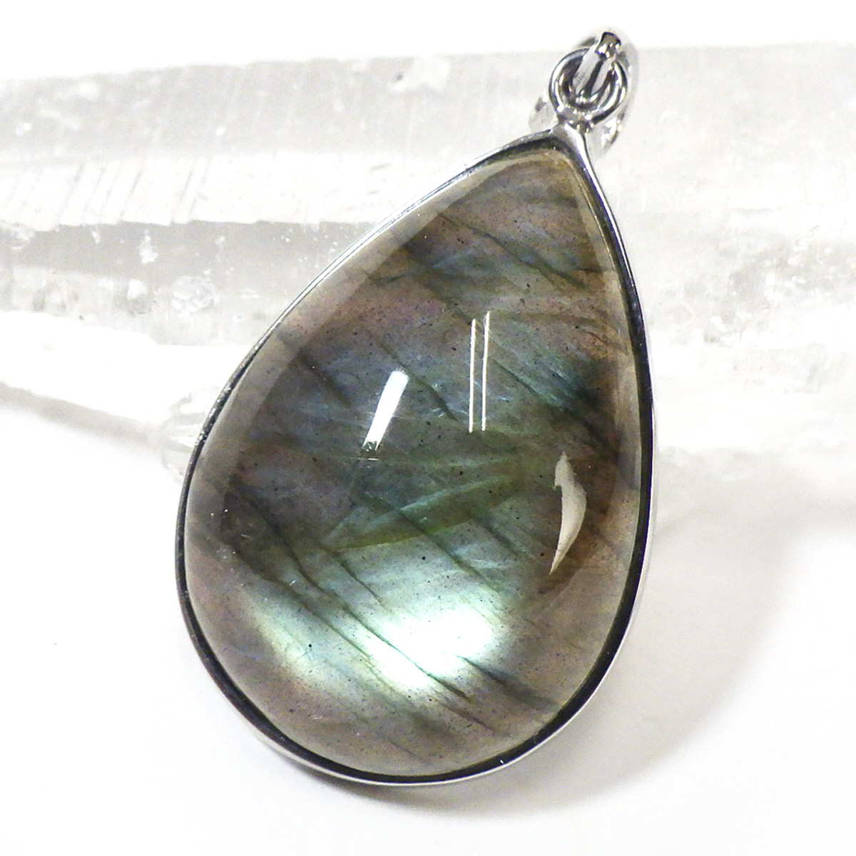 マダガスカル産ラブラドライトのペンダントトップです。ブルーグリーン系のラブラドレッセンスが見られます。よく見ると小さな内包物が星のようにキラキラと見られ、全体としてラブラドライトの大きな深みを感じます。また光に透かすとピンクやオレンジ系の色も見られ複雑な色相で非常に面白い個体です。石の加工はしずく形に艶やかな研磨を施しております。上から下から、どの角度から見てもラブラドレッセンスがしっかりと輝き、グリーンがかったブルーの表情の移り変わりが楽しいペンダントトップです。サイズも程よく存在感があり、ぷっくり具合もかわいいです。