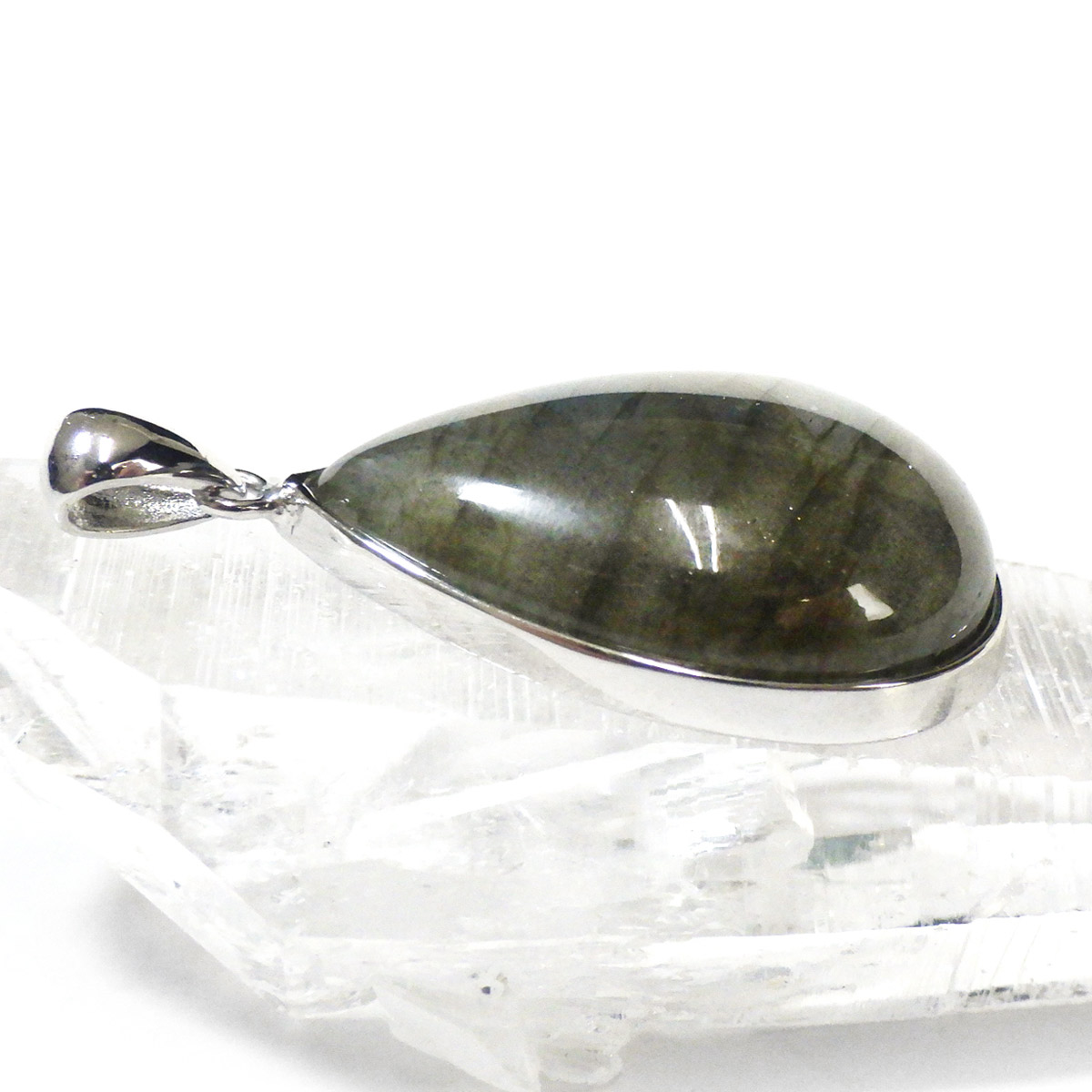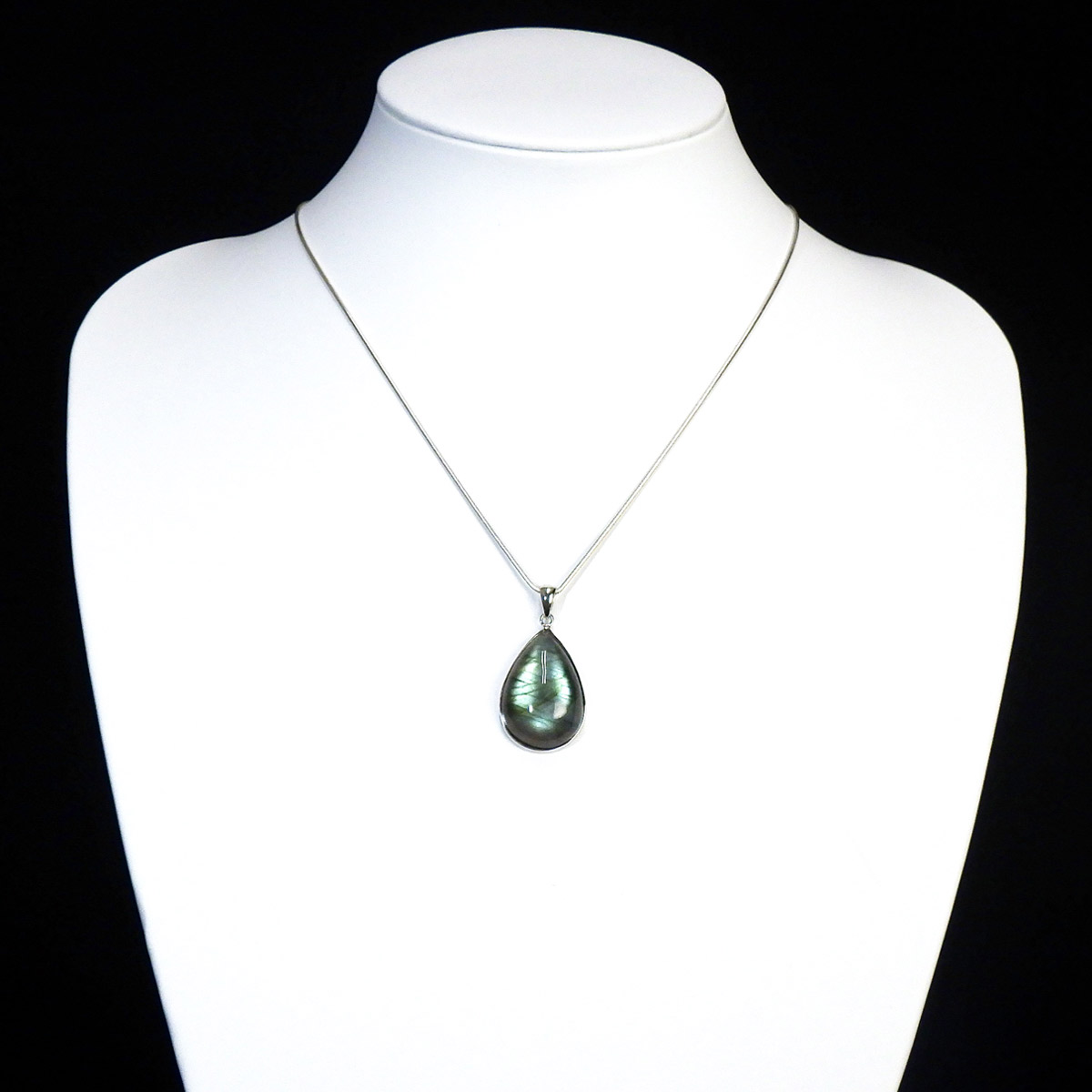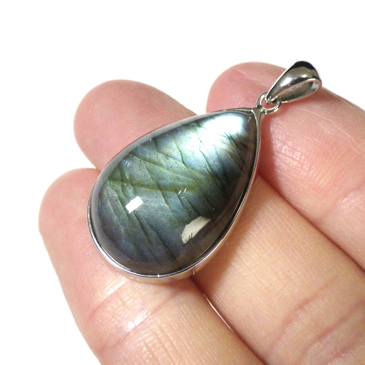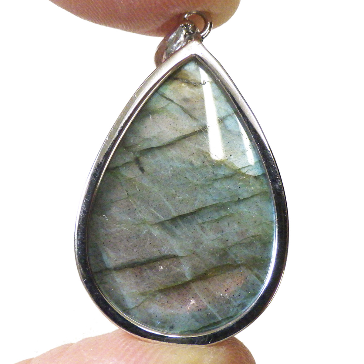 マダガスカル産ラブラドライトのペンダントトップです。ブルーグリーン系のラブラドレッセンスが見られます。よく見ると小さな内包物が星のようにキラキラと見られ、全体としてラブラドライトの大きな深みを感じます。また光に透かすとピンクやオレンジ系の色も見られ複雑な色相で非常に面白い個体です。石の加工はしずく形に艶やかな研磨を施しております。上から下から、どの角度から見てもラブラドレッセンスがしっかりと輝き、グリーンがかったブルーの表情の移り変わりが楽しいペンダントトップです。サイズも程よく存在感があり、ぷっくり具合もかわいいです。