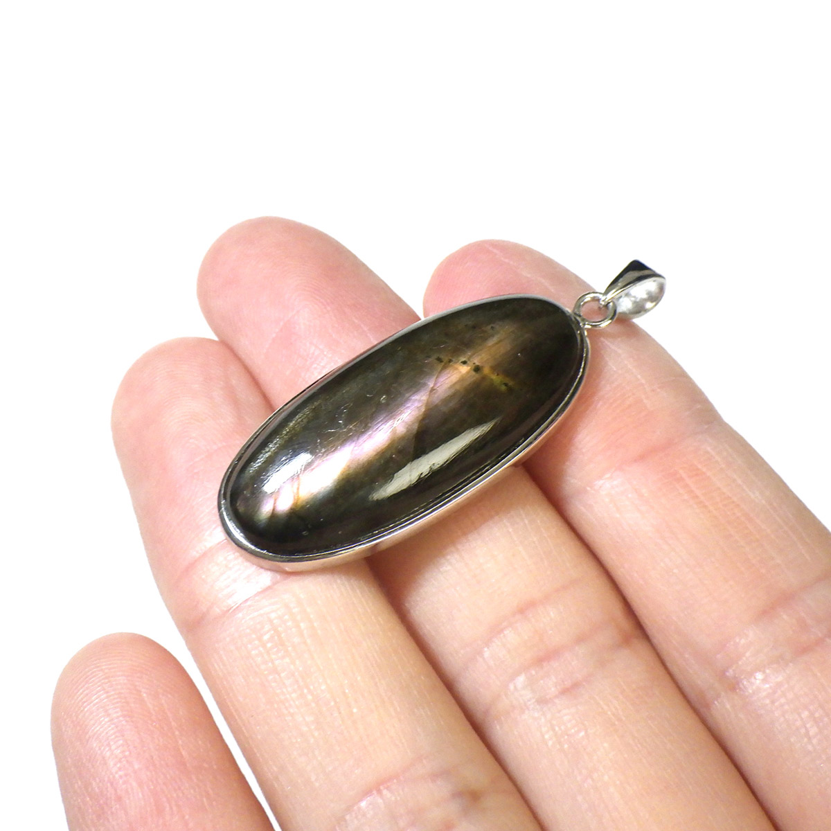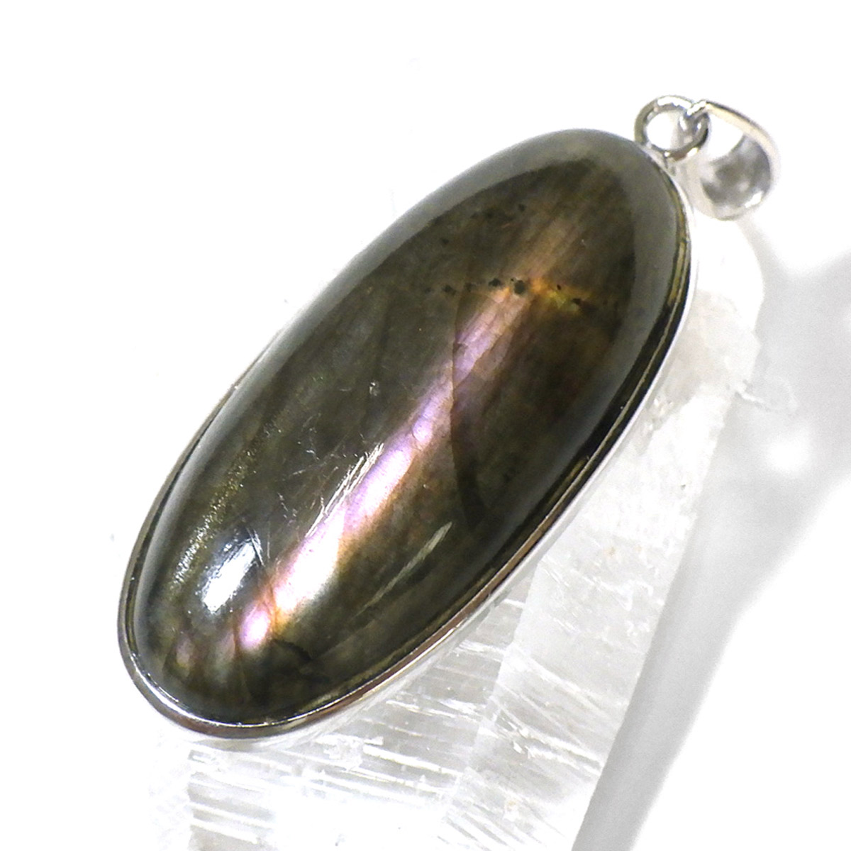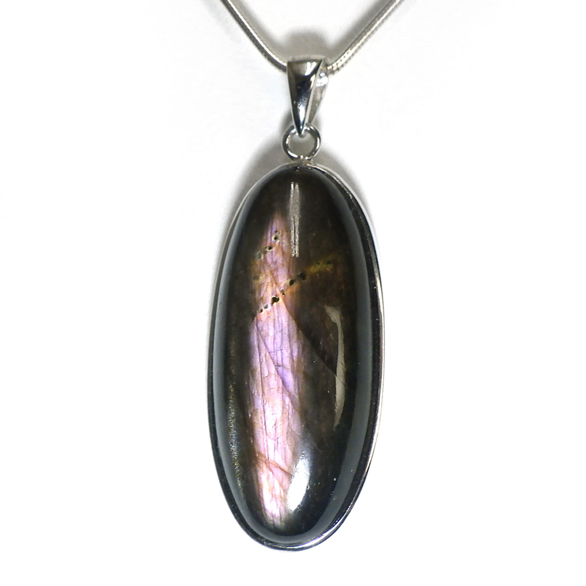 マダガスカル産ピンクラブラドライトのペンダントトップです。ピンク系のラブラドレッセンスが見られます。ピンクはラブラドライトの中ではレアなカラーとして知られています。よく見ると小さな内包物が星のようにキラキラと見られ、全体としてラブラドライトの大きな深みを感じます。光に透かしても面白いです。石の加工はロングオーバル形に一筋のラブラドレッセンスがカッコよく胸元で光ります。