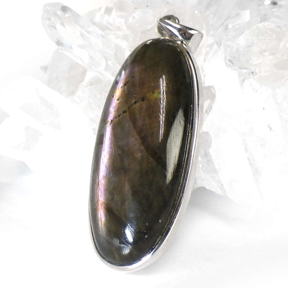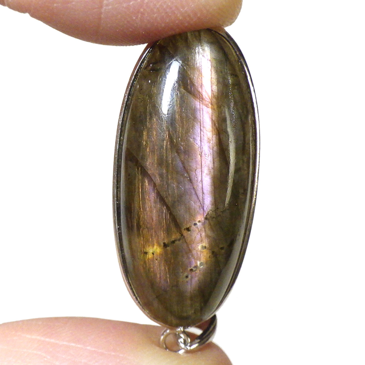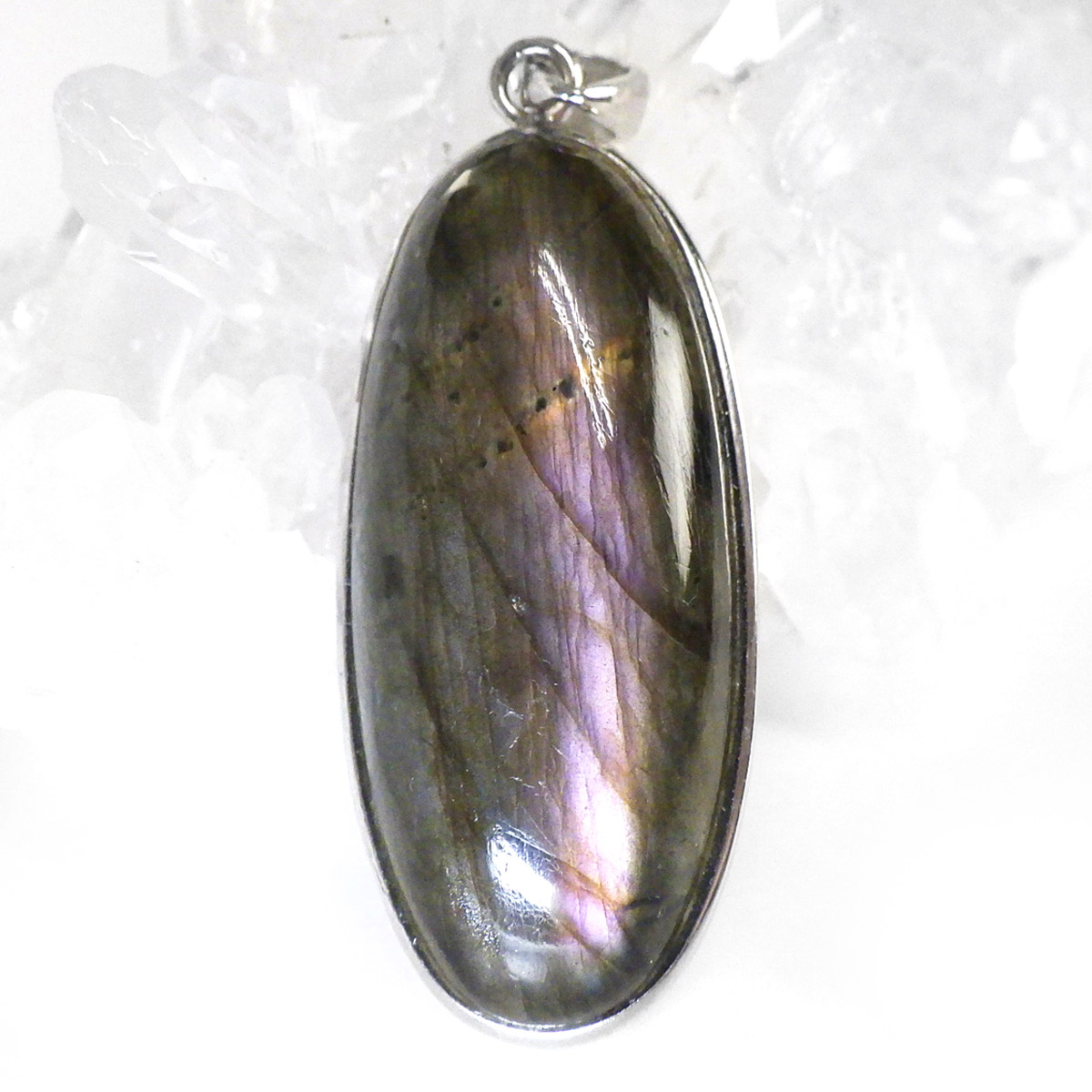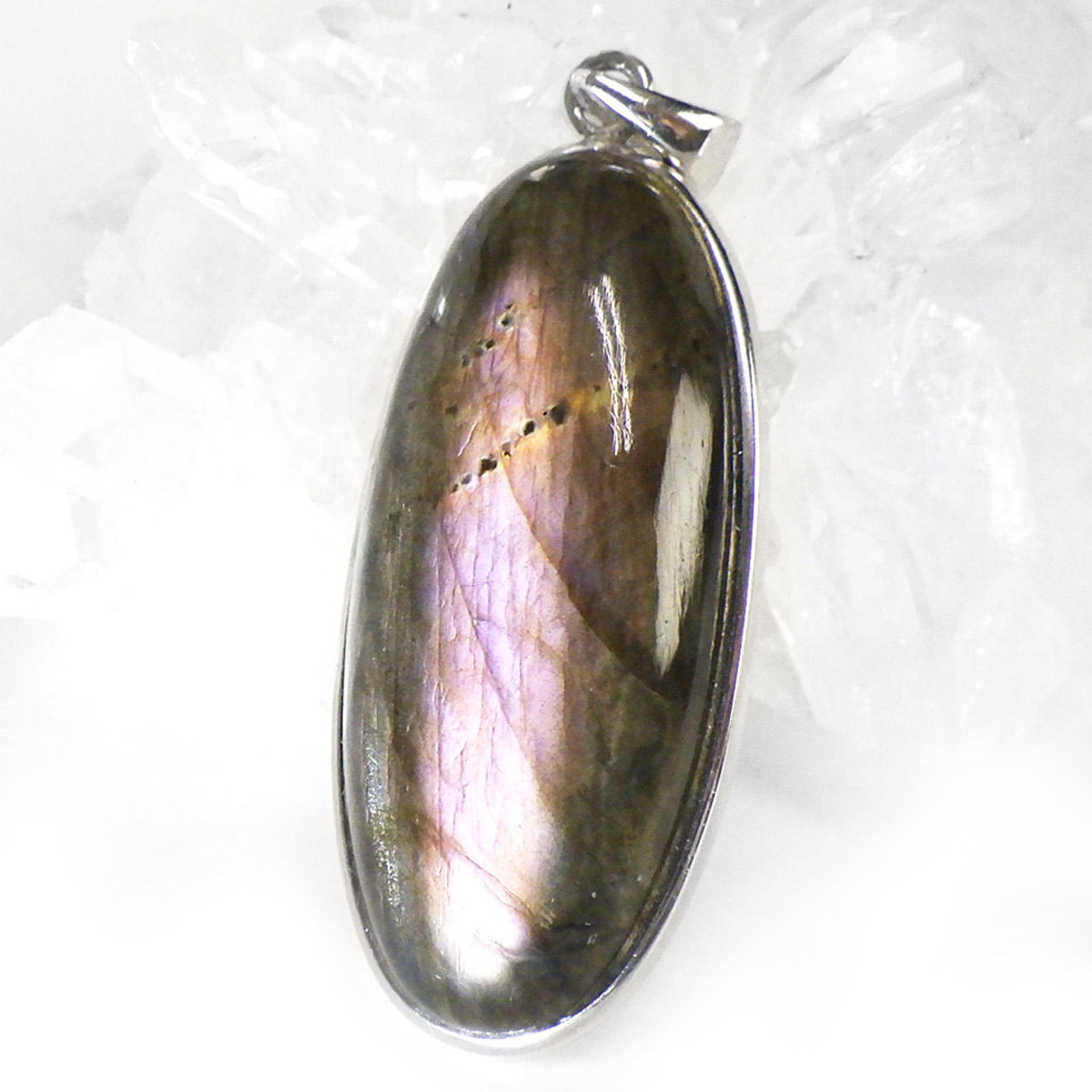 マダガスカル産ピンクラブラドライトのペンダントトップです。ピンク系のラブラドレッセンスが見られます。ピンクはラブラドライトの中ではレアなカラーとして知られています。よく見ると小さな内包物が星のようにキラキラと見られ、全体としてラブラドライトの大きな深みを感じます。光に透かしても面白いです。石の加工はロングオーバル形に一筋のラブラドレッセンスがカッコよく胸元で光ります。