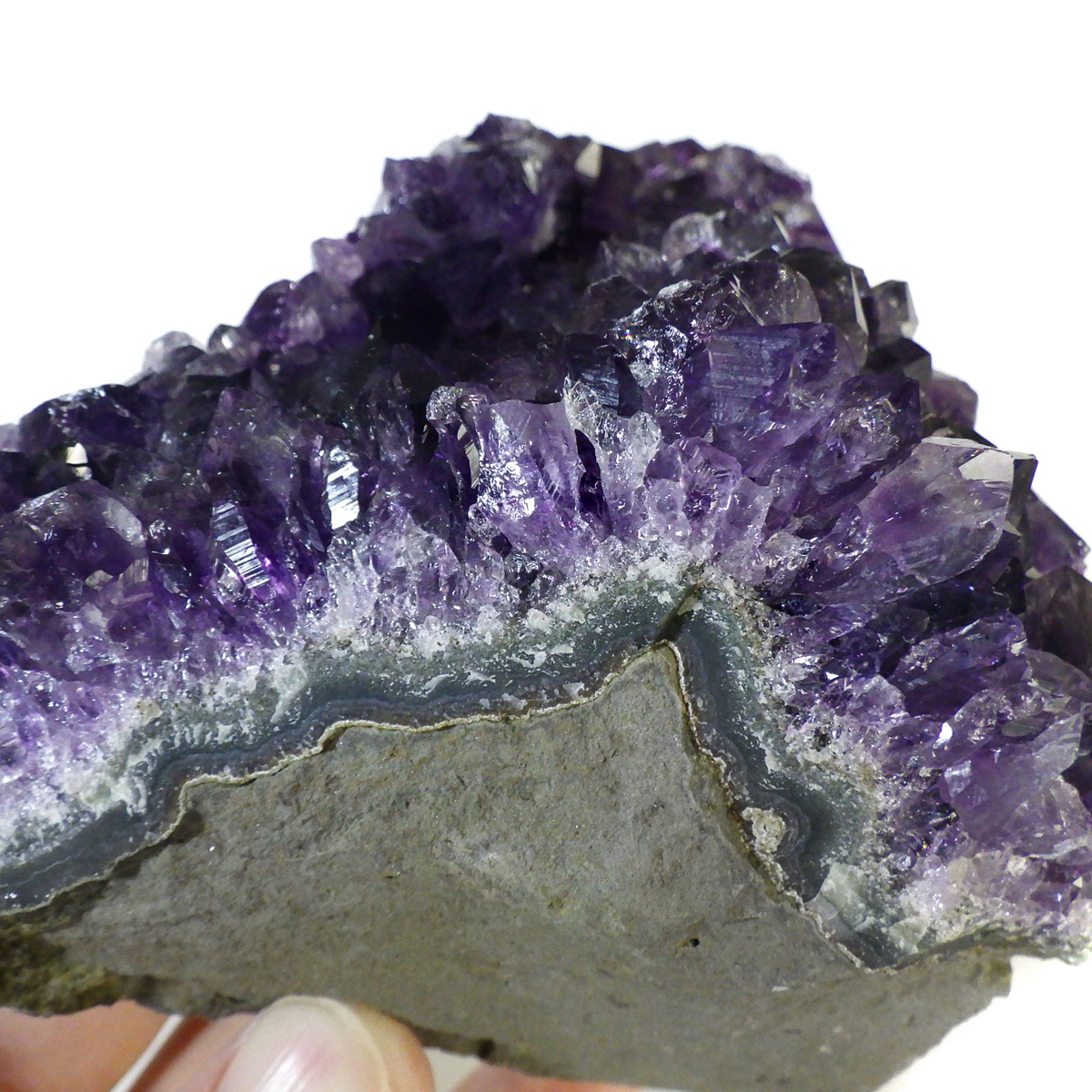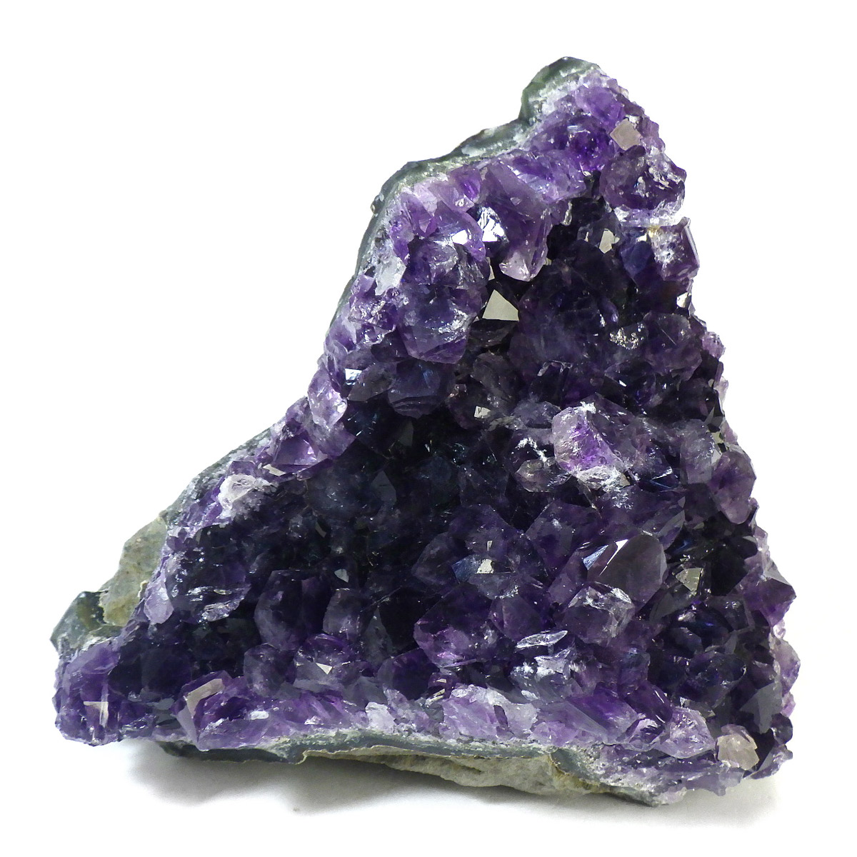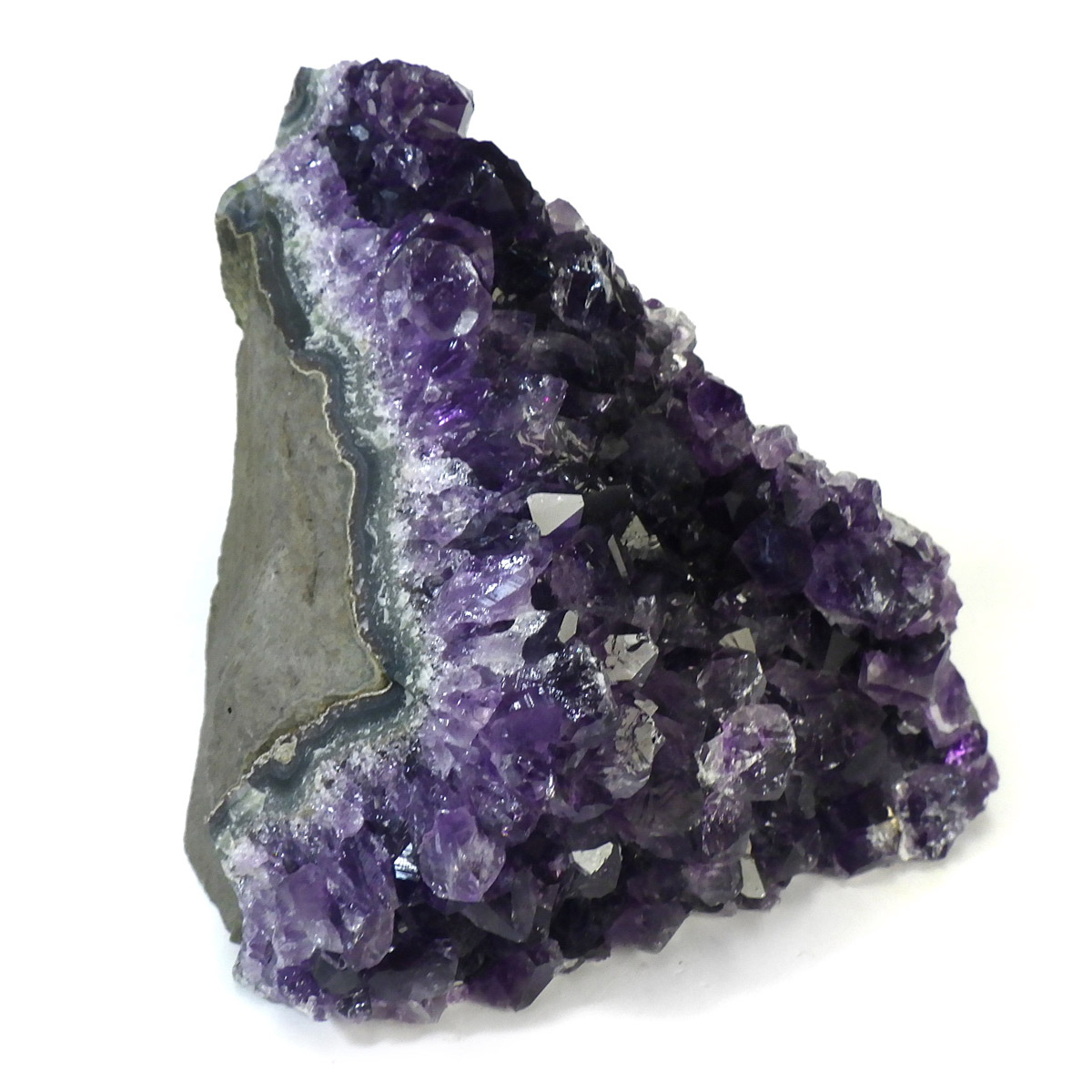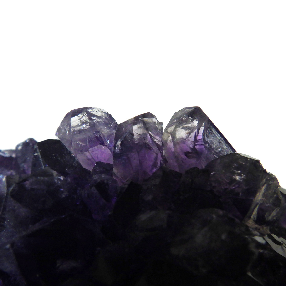 ウルグアイ産のアメジストクラスターです。一つ一つの結晶が細かく光の反射で美しくキラキラと輝きます。良質なアメジストの証である紫の色がしっかりと入っています。質の違う結晶が表裏にあり、どの角度でも楽しめ、安定感があるフォルムです。