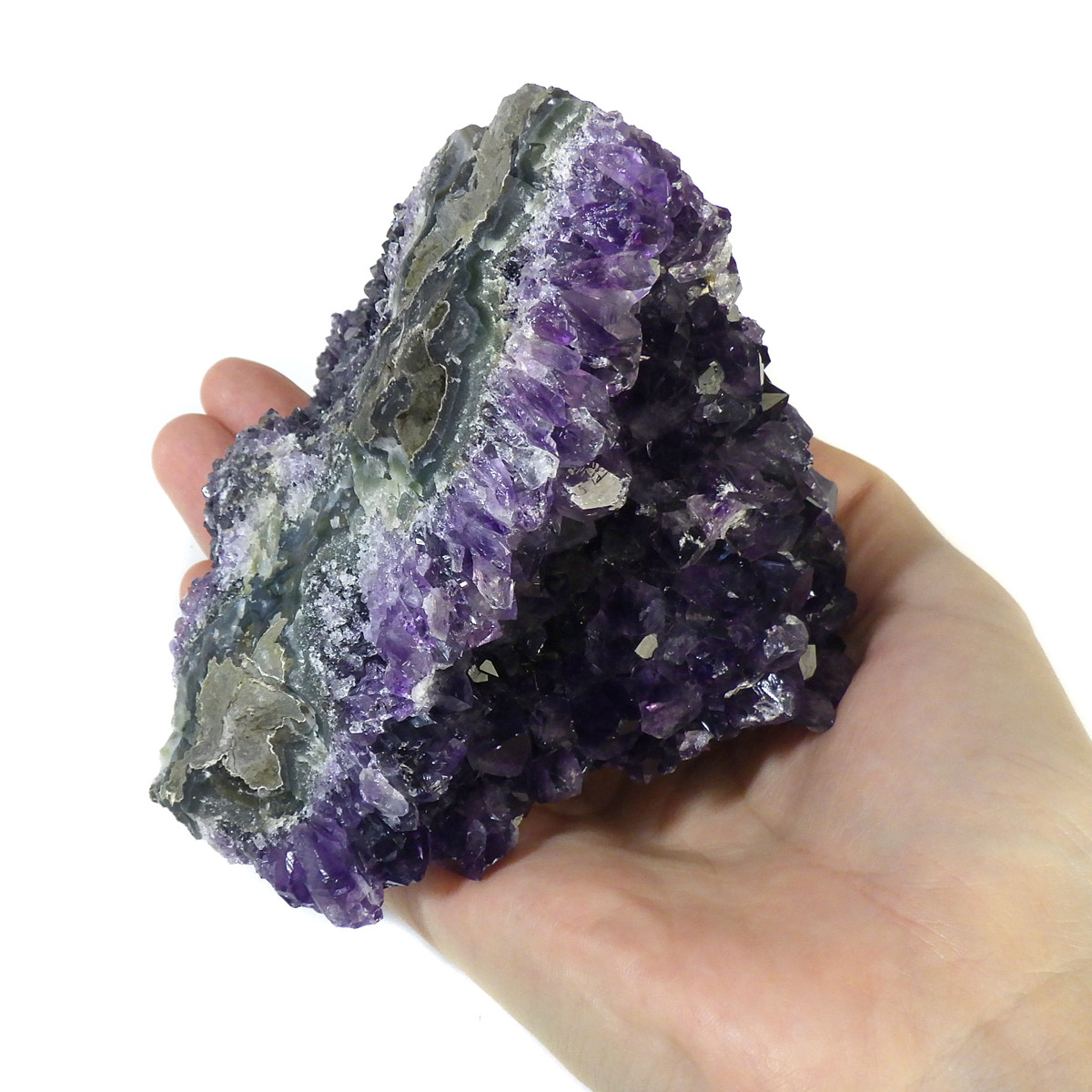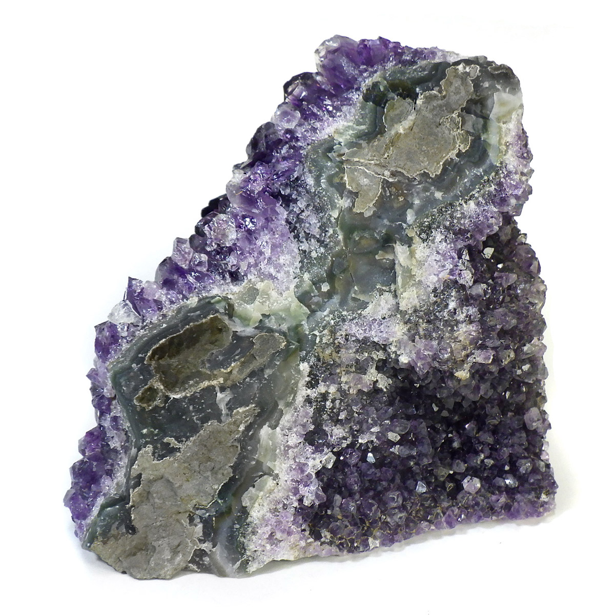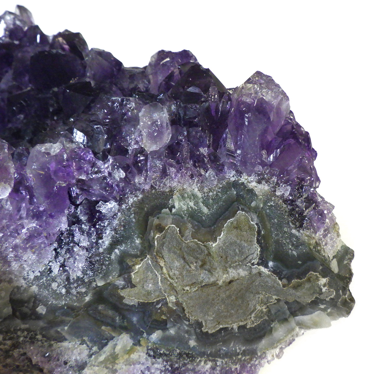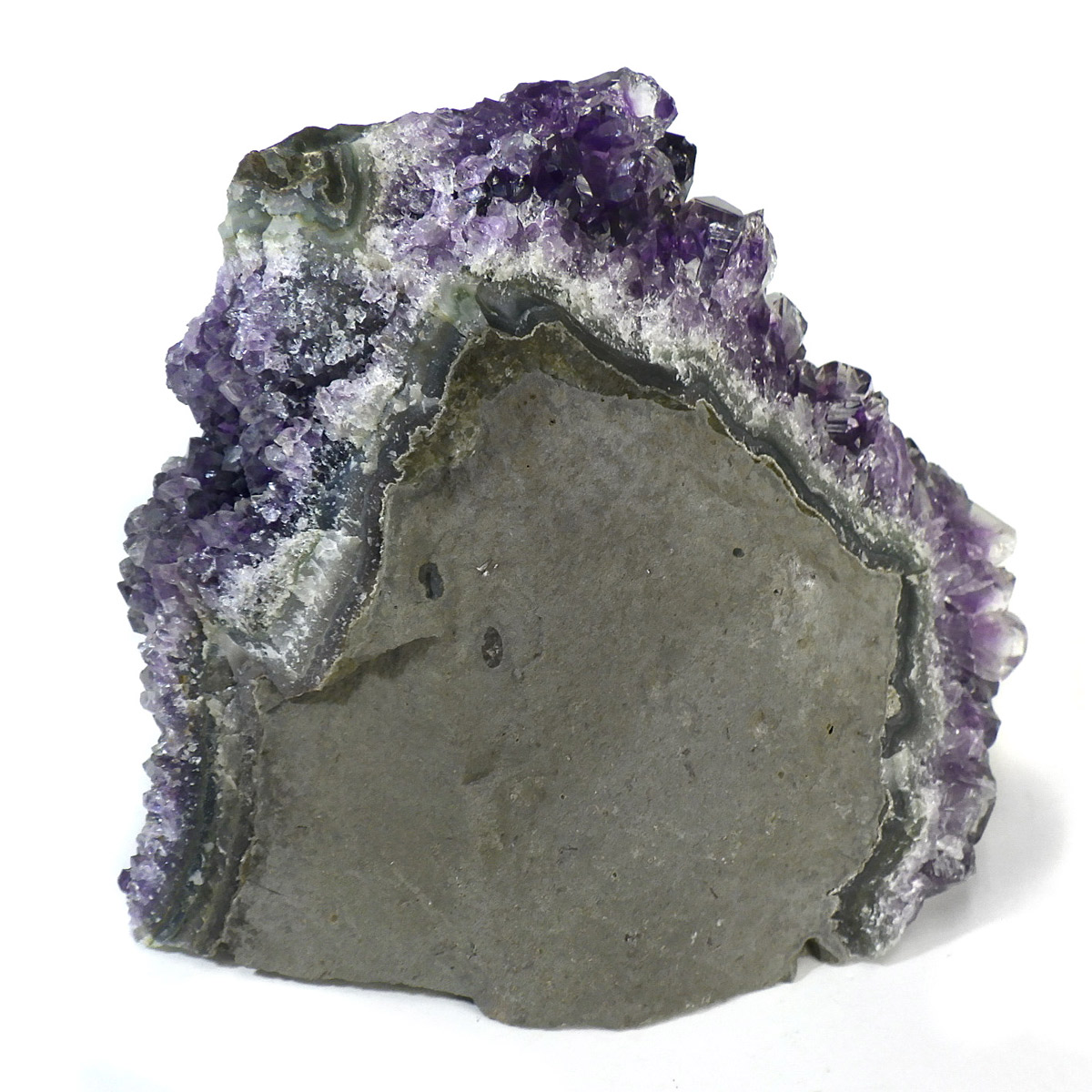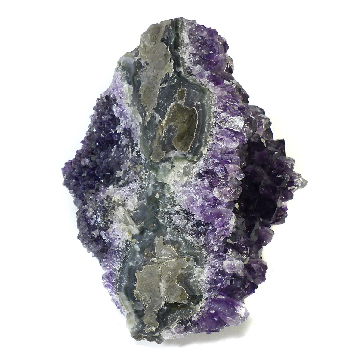 ウルグアイ産のアメジストクラスターです。一つ一つの結晶が細かく光の反射で美しくキラキラと輝きます。良質なアメジストの証である紫の色がしっかりと入っています。質の違う結晶が表裏にあり、どの角度でも楽しめ、安定感があるフォルムです。