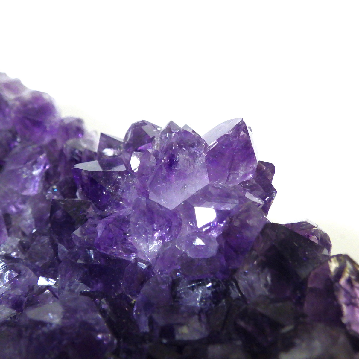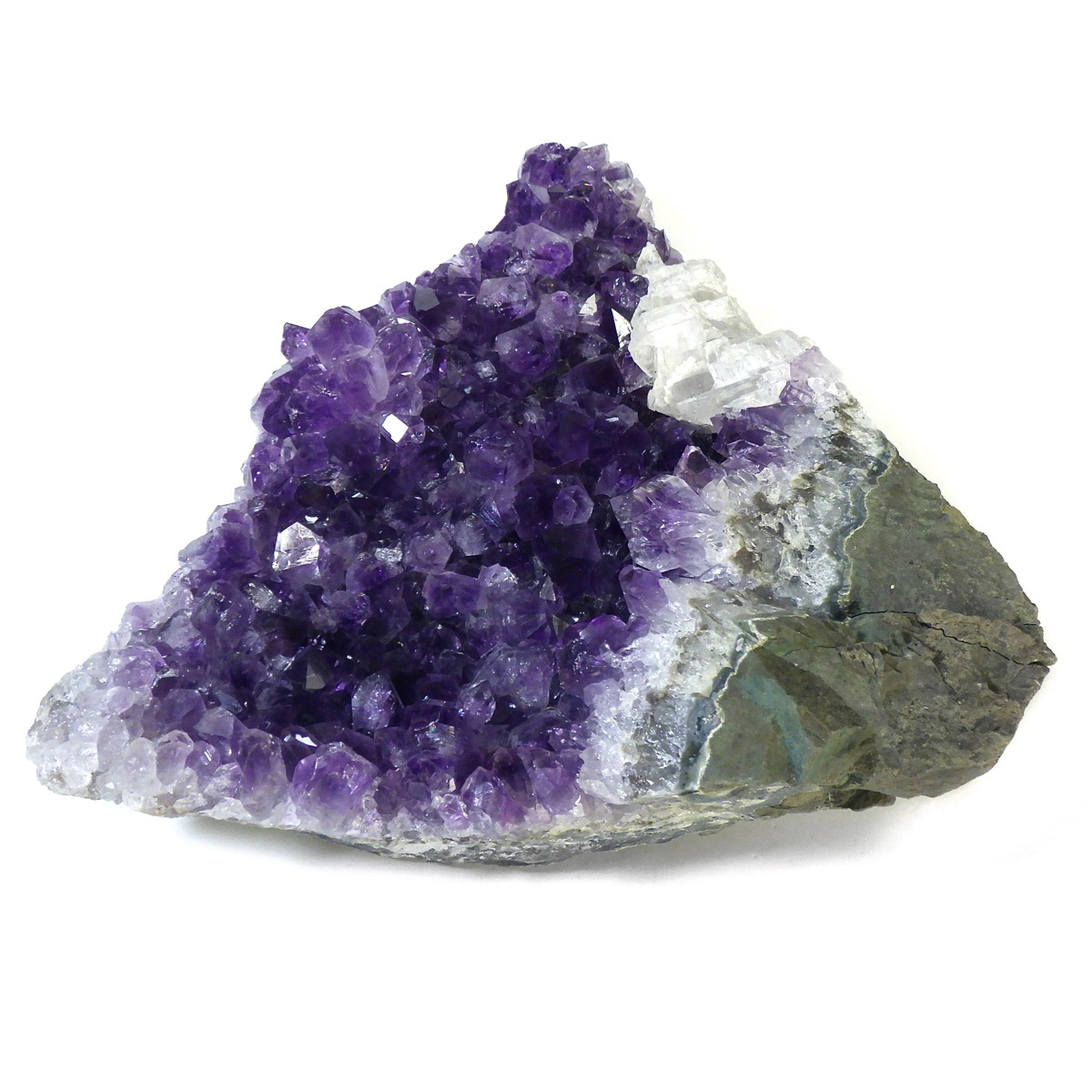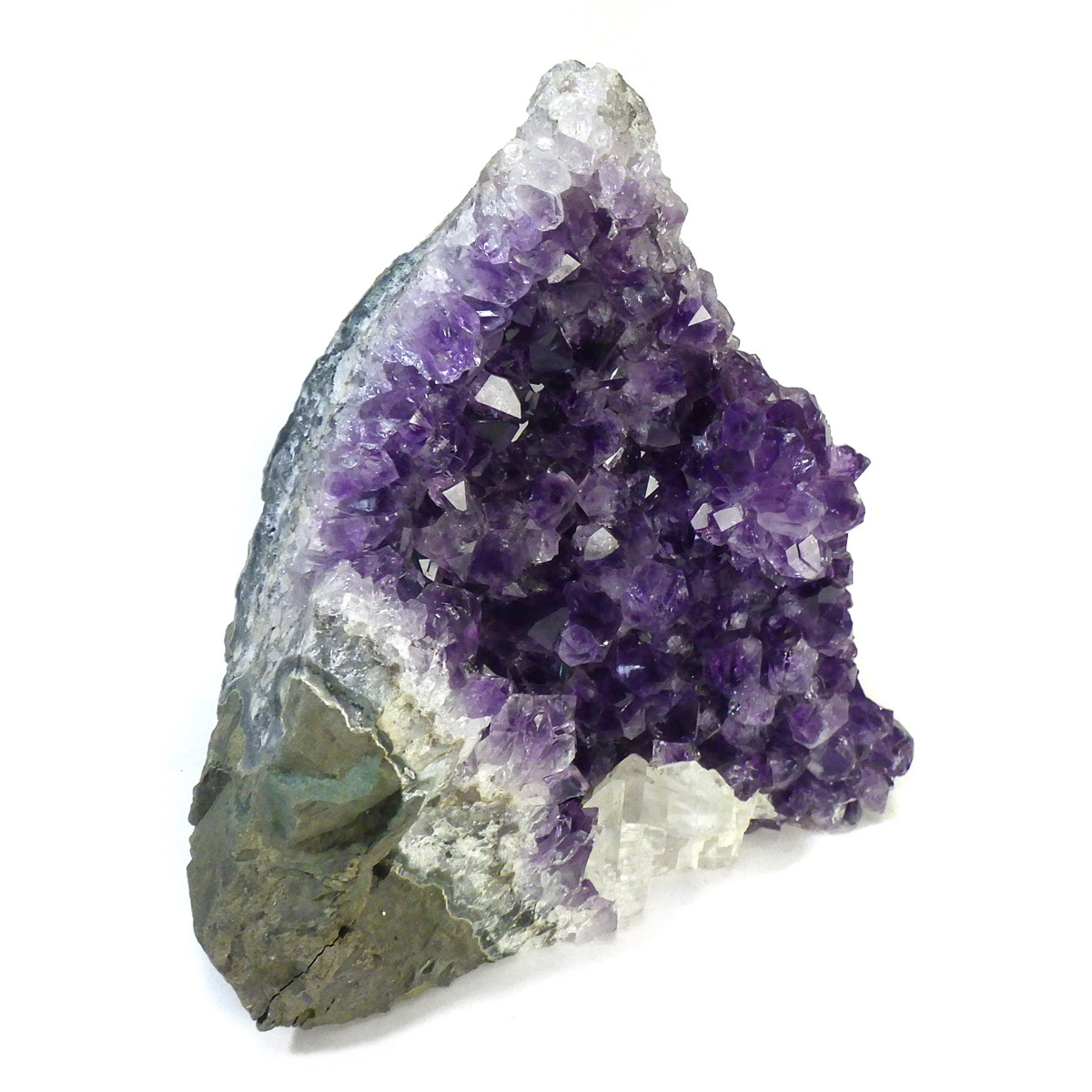 ウルグアイ産のアメジストクラスターです。一つ一つの結晶が細かく光の反射で美しくキラキラと輝きます。良質なアメジストの証である紫の色がしっかりと入っていて、カルサイトとの共生が楽しめます。