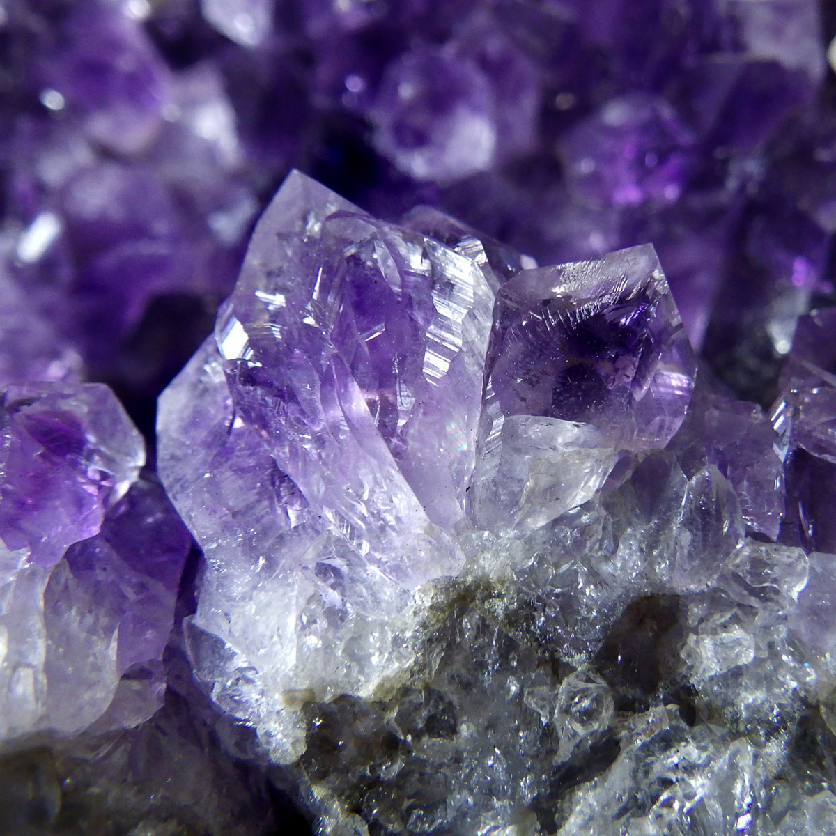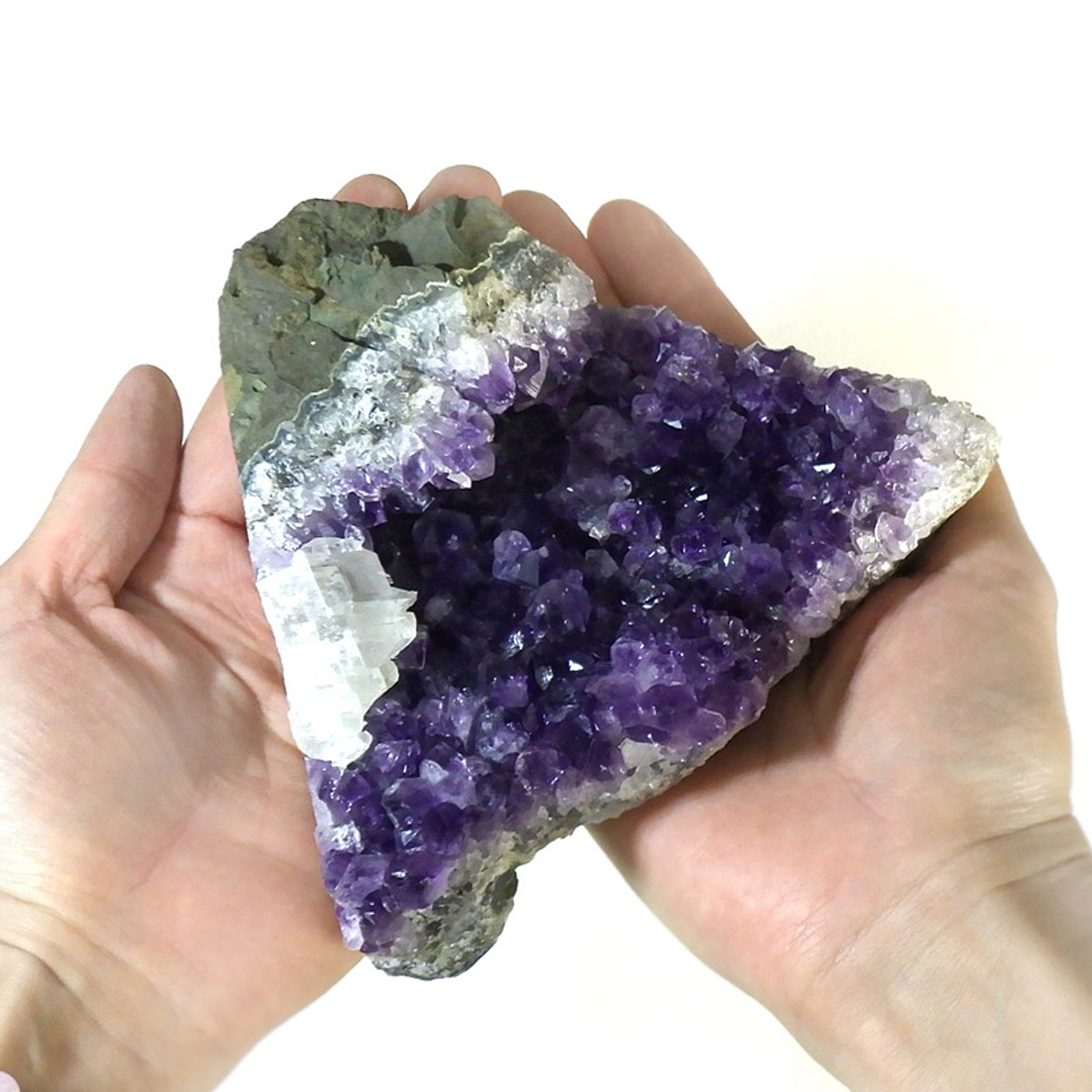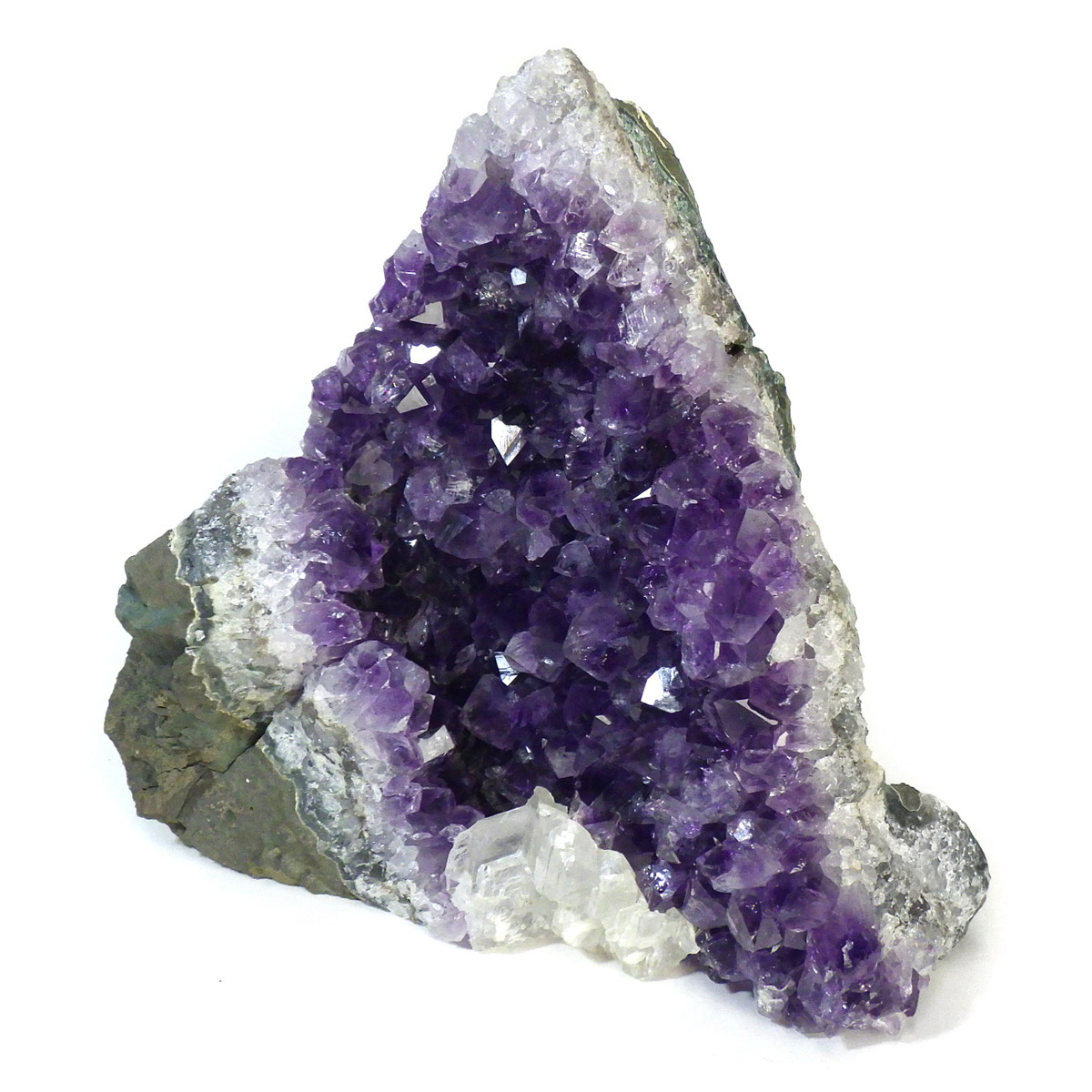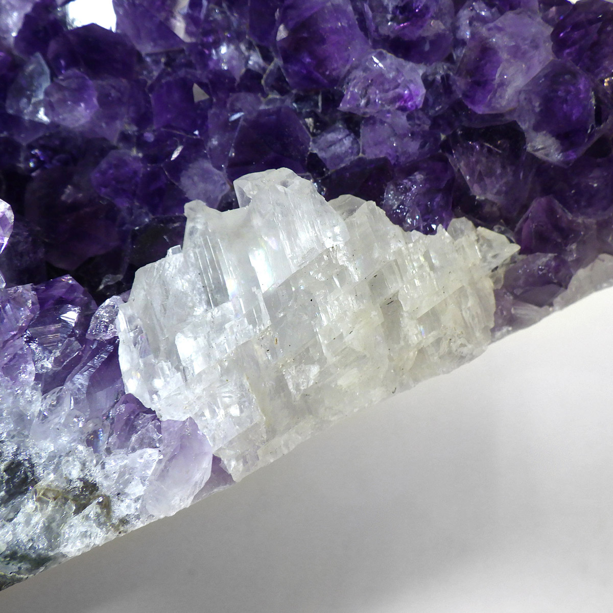 ウルグアイ産のアメジストクラスターです。一つ一つの結晶が細かく光の反射で美しくキラキラと輝きます。良質なアメジストの証である紫の色がしっかりと入っていて、カルサイトとの共生が楽しめます。