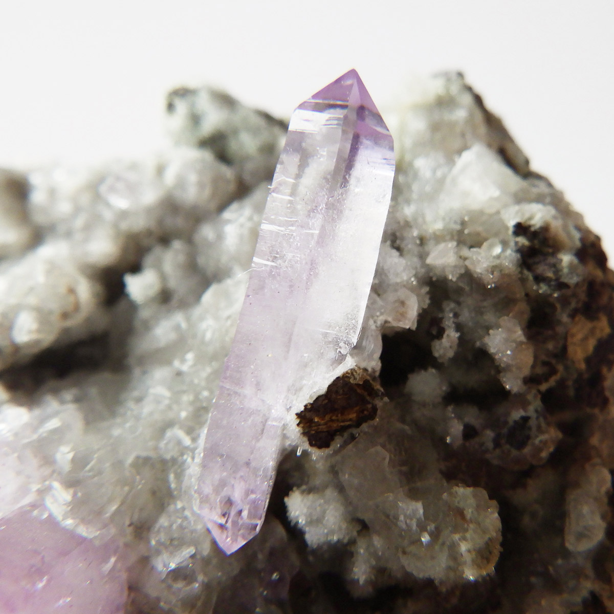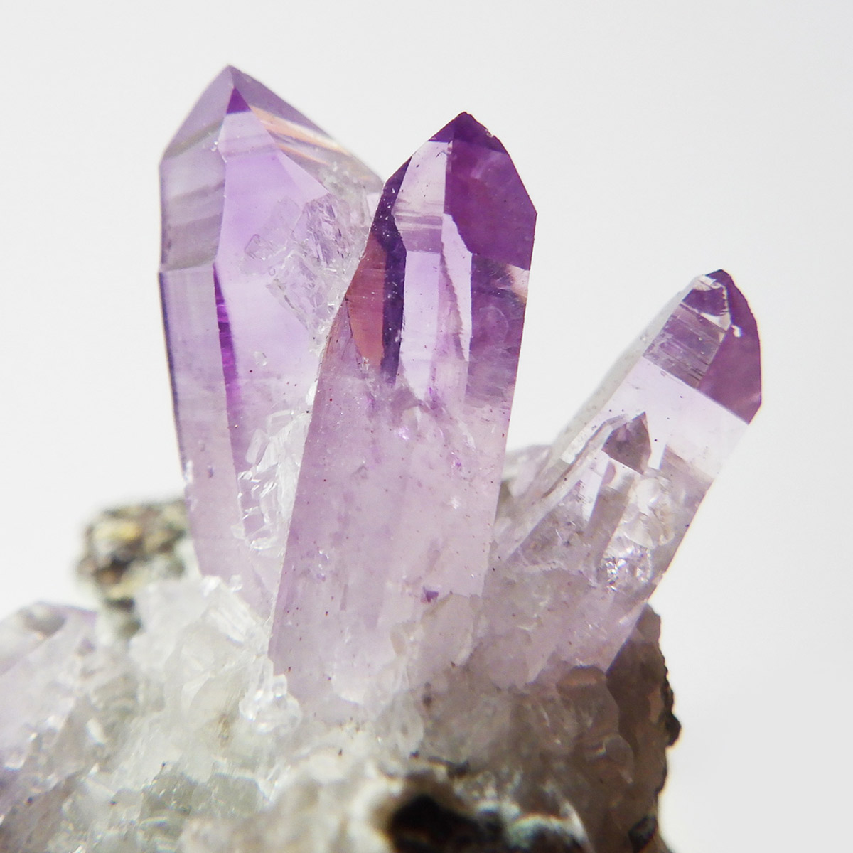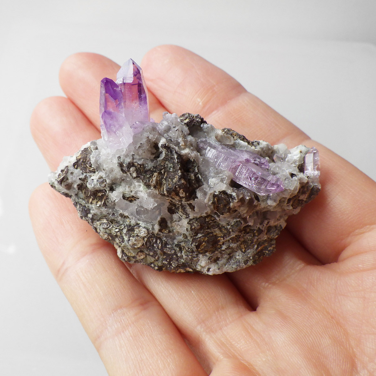ブラジル産やウルグアイ産などのアメジストとは異なり、ポイントが細長く形成されるのが特徴です。 また、ベラクルス州は大変透明度の高いアメジストが産出され、「世界一高透明で美しいアメジスト」と言われています。産出量が非常に少なく、更に鉱山はすでに閉山されていることから、現在出回っているものは大変希少となります。 淡くてほんのりとしたパープルが先端に向かって濃くなるのも特長です。 何とも言えない清純さを兼ね備えており、ため息の出るような透明度を持っています。心の底から綺麗だなぁと感嘆させられる原石です。