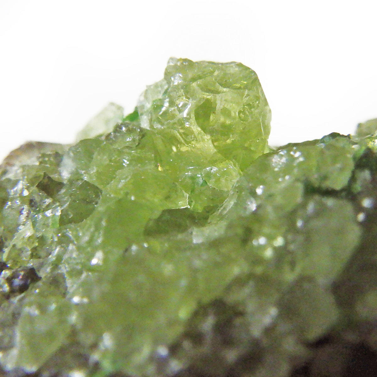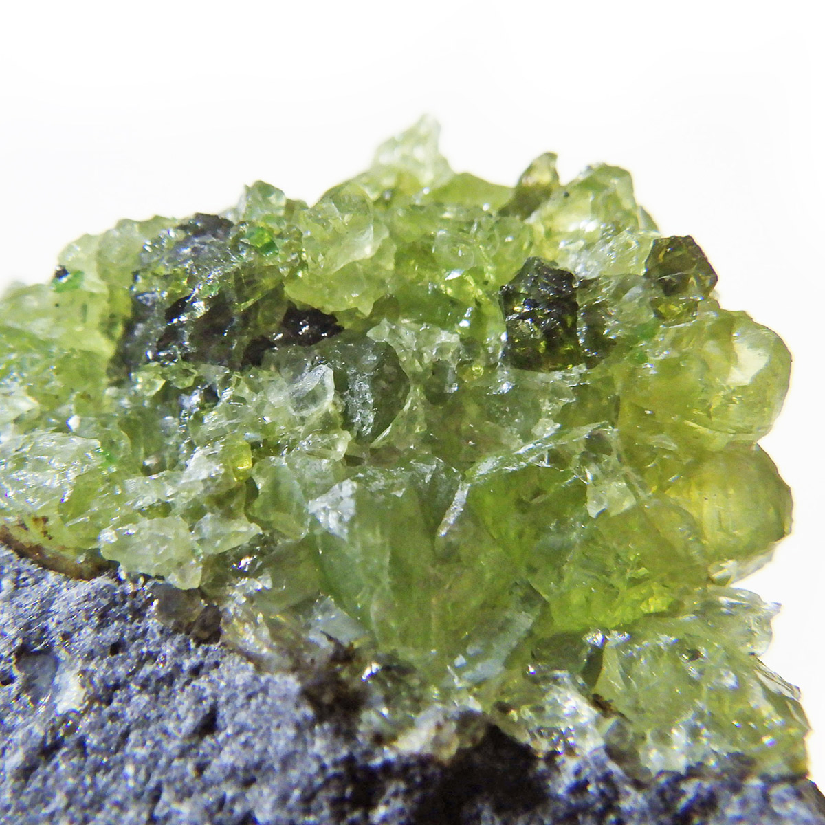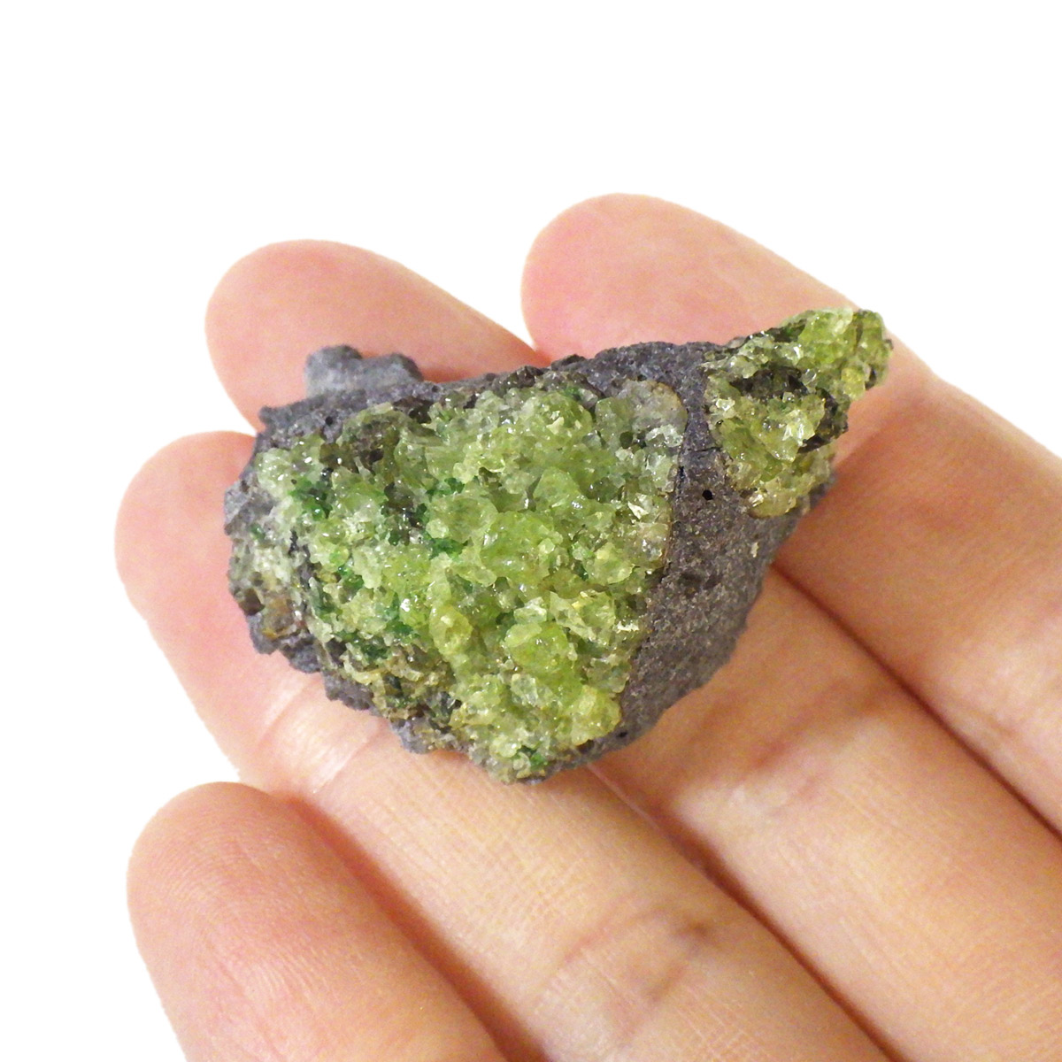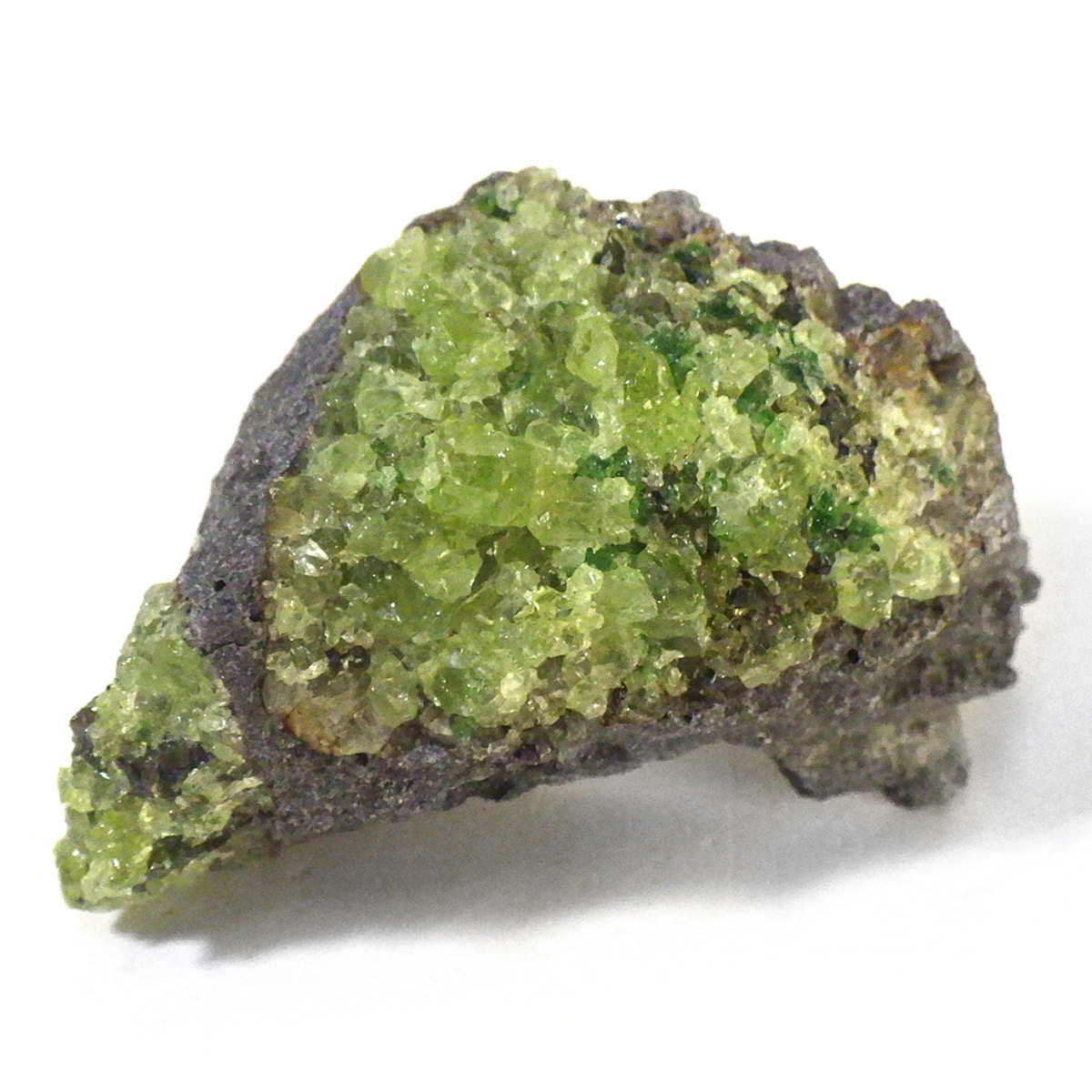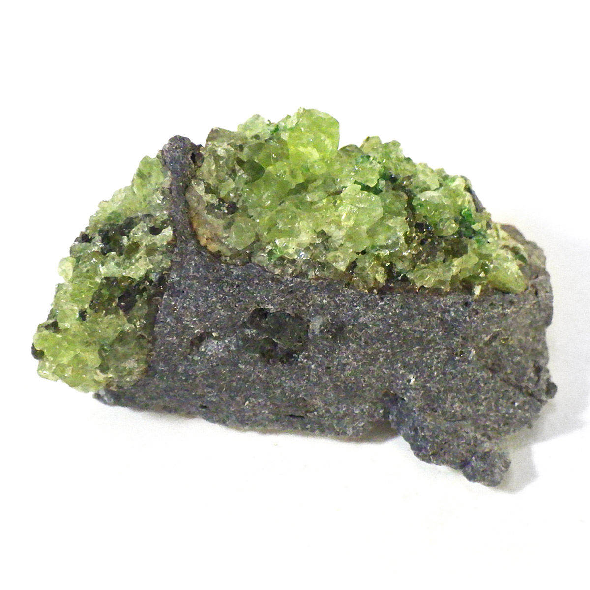 アメリカ・アリゾナ州産のペリドット母岩付き原石です。鉱物名をオリビンと呼ぶのですが、日本では宝石名のペリドットが浸透しています。和名は橄欖(かんらん)石といいます。主にグリーンの結晶がかんらん石でグレーの母岩が玄武岩です。かんらん石は月の岩石や石質隕石、石鉄隕石にも含まれており、鉄の含有量によって、白色から黒色まで色調が変化します。かんらん石は地球の上部マントルの主要構成鉱物でマグマの噴火によって溶岩の塊に運ばれて地表に出てきます。まさにその姿を切り取ったようなこの原石は、様々な濃淡の結晶が多面にわたり観察できます。