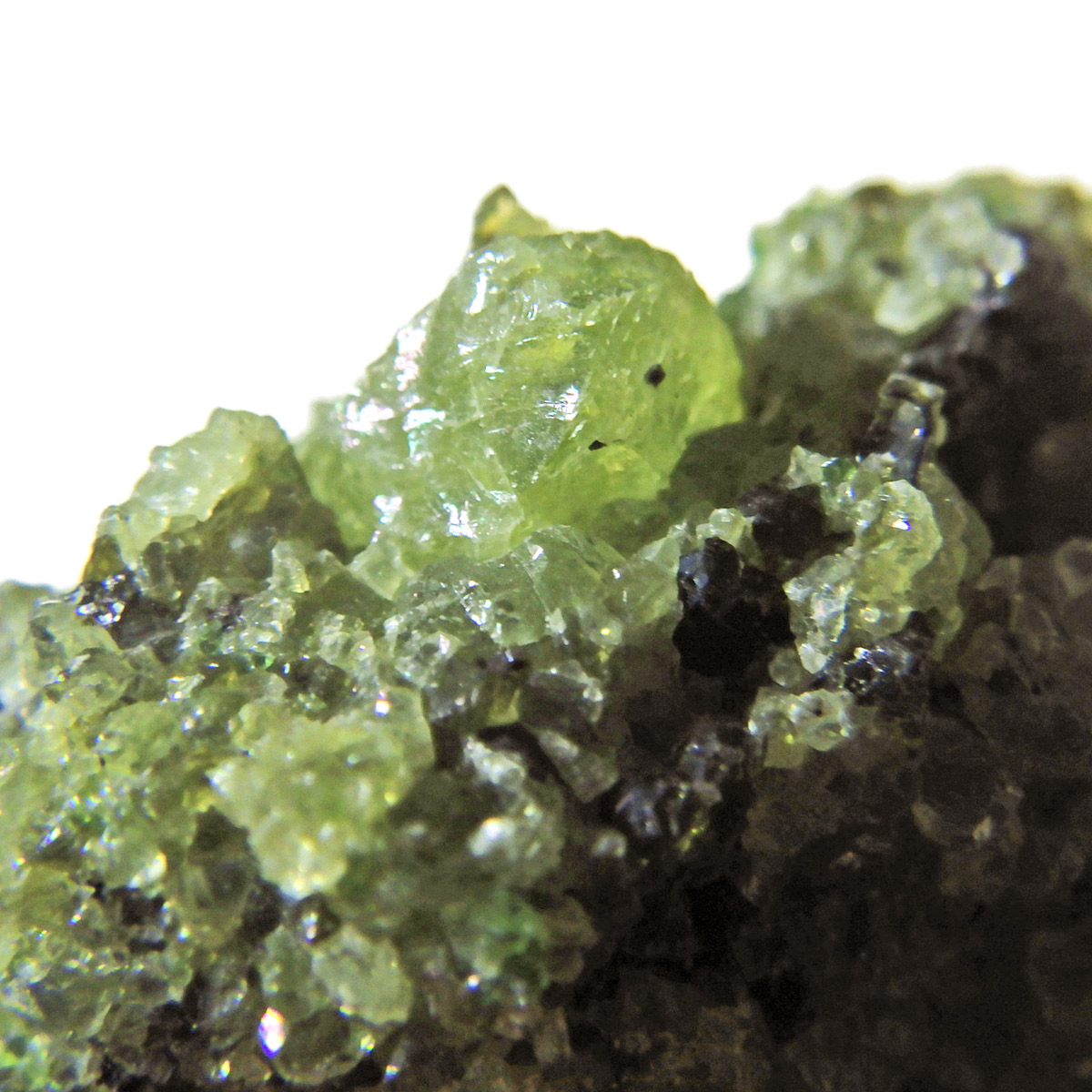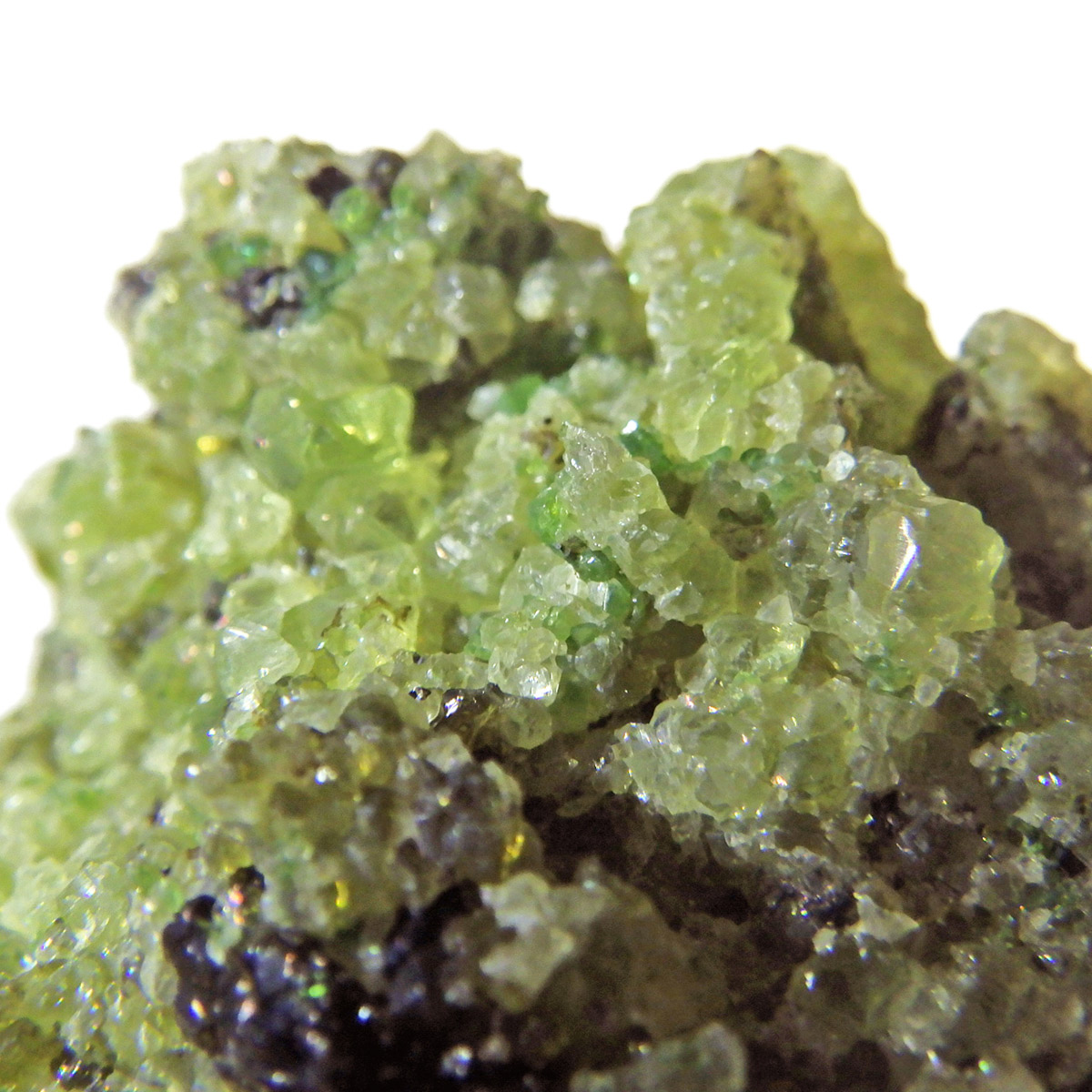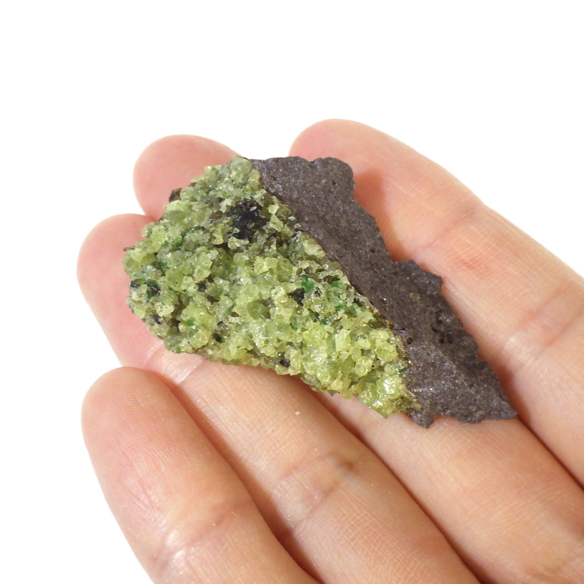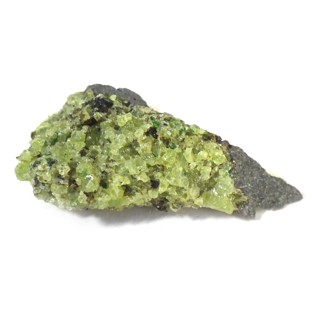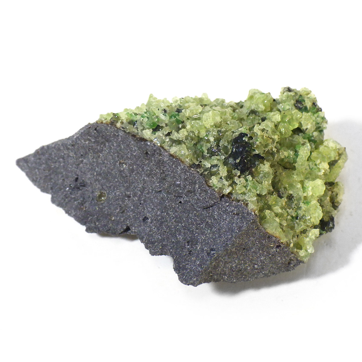 アメリカ・アリゾナ州産のペリドット母岩付き原石です。鉱物名をオリビンと呼ぶのですが、日本では宝石名のペリドットが浸透しています。和名は橄欖(かんらん)石といいます。主にグリーンの結晶がかんらん石でグレーの母岩が玄武岩です。かんらん石は月の岩石や石質隕石、石鉄隕石にも含まれており、鉄の含有量によって、白色から黒色まで色調が変化します。かんらん石は地球の上部マントルの主要構成鉱物でマグマの噴火によって溶岩の塊に運ばれて地表に出てきます。まさにその姿を切り取ったようなこの原石は、様々な濃淡の結晶が多面にわたり観察できます。