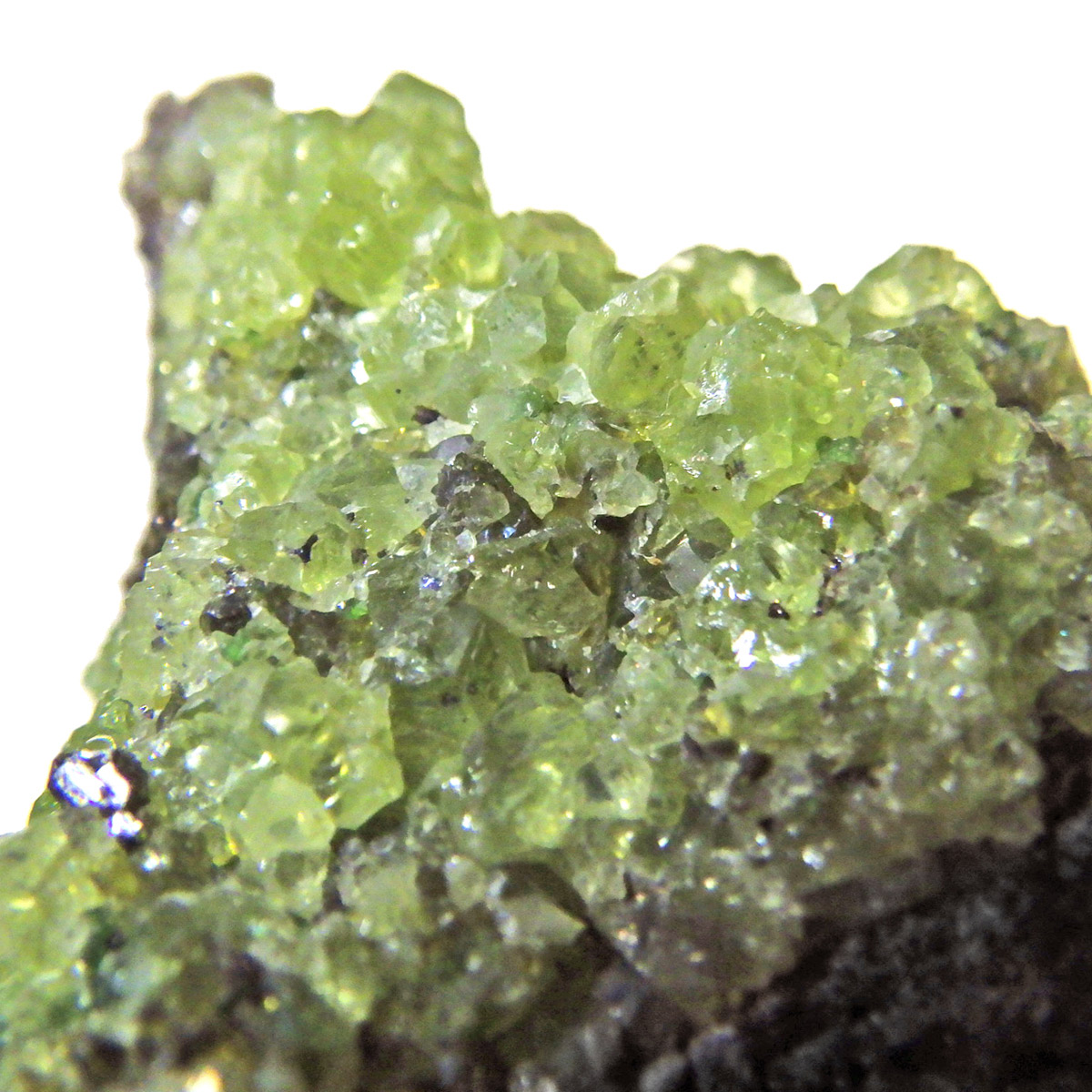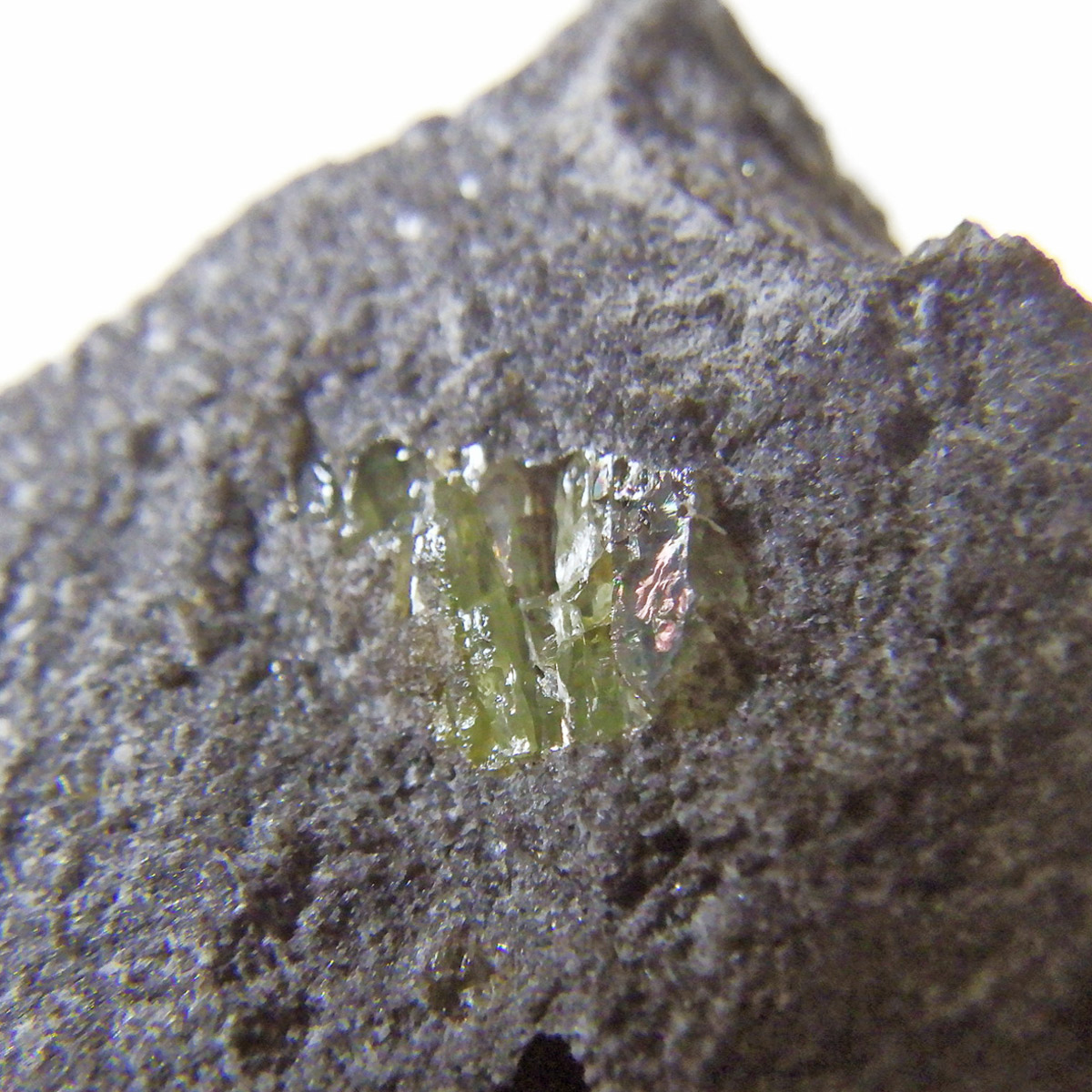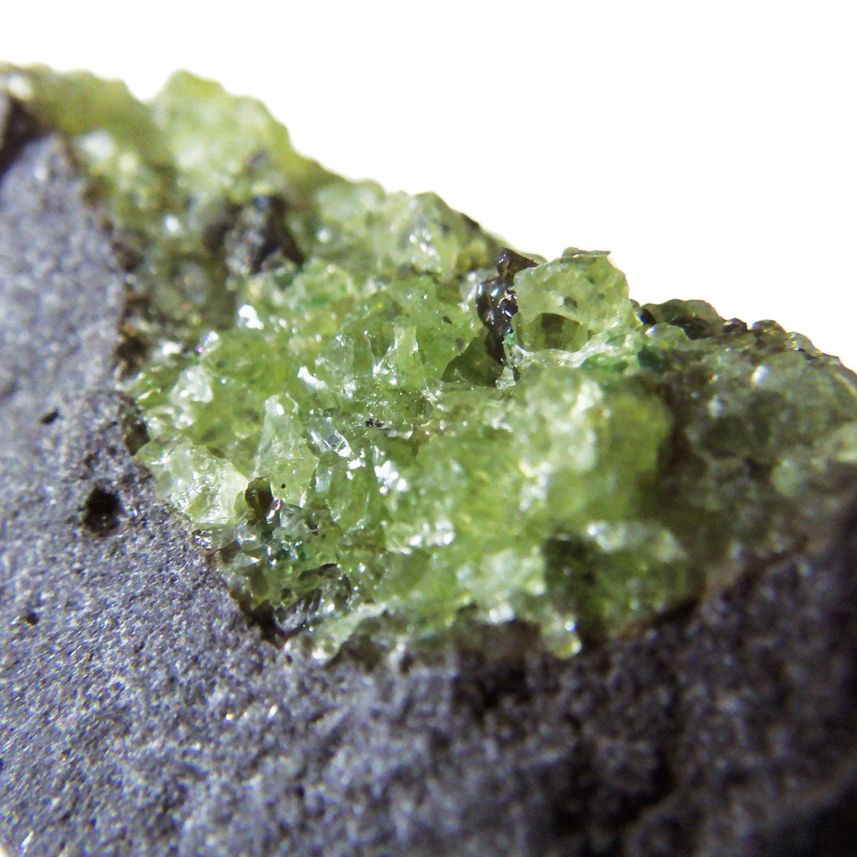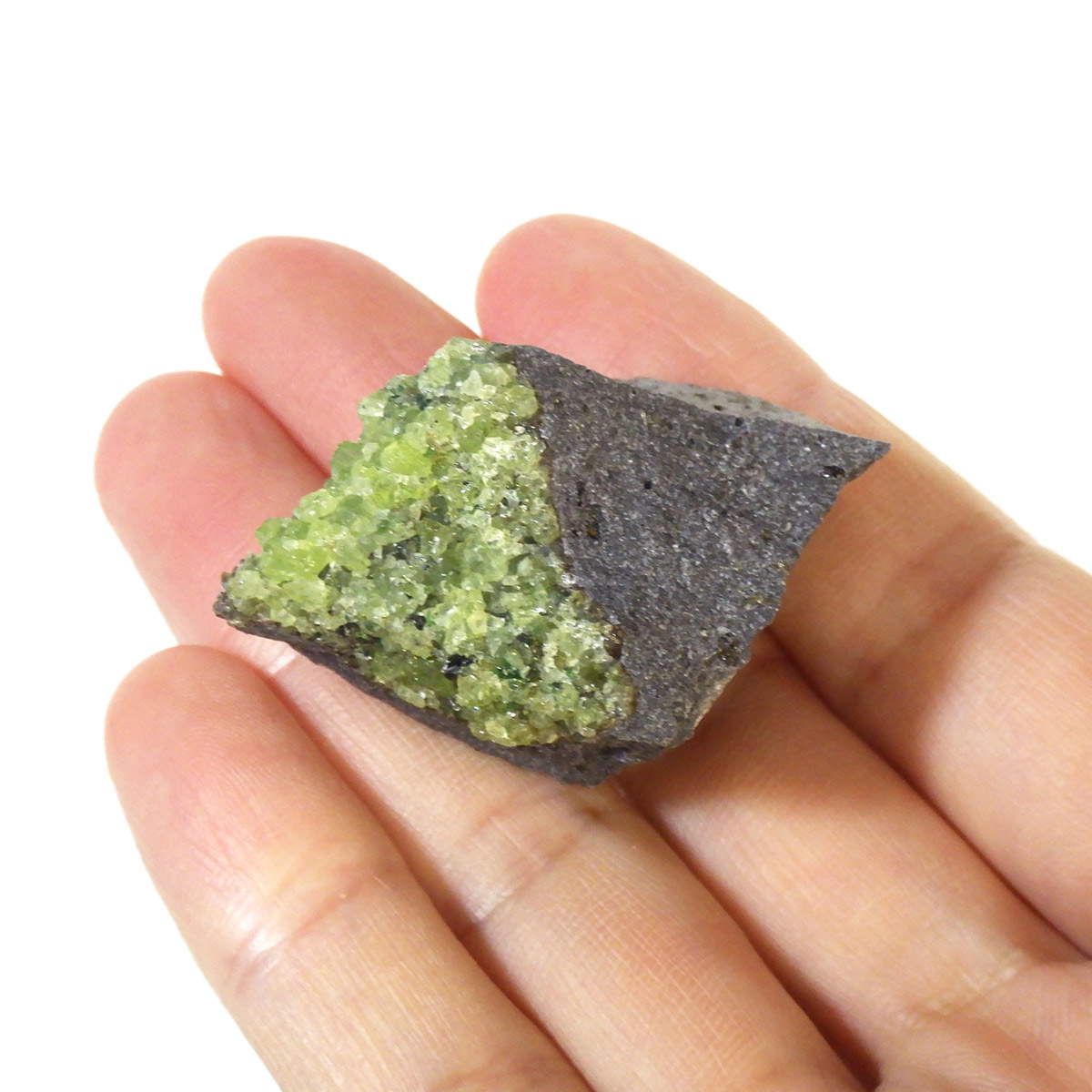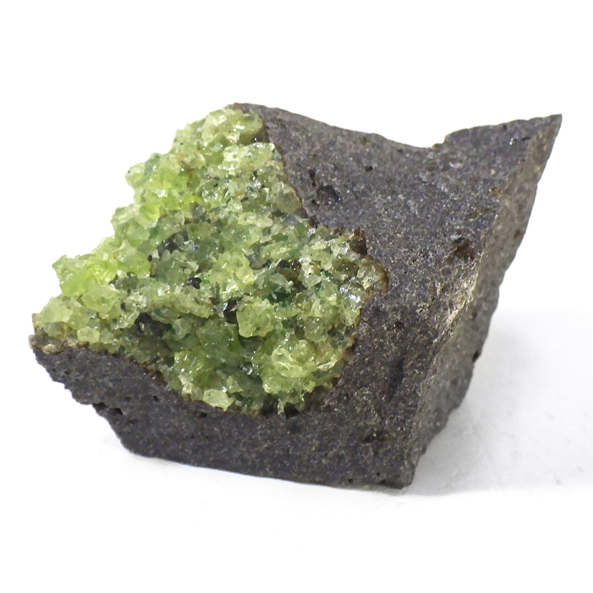 アメリカ・アリゾナ州産のペリドット母岩付き原石です。鉱物名をオリビンと呼ぶのですが、日本では宝石名のペリドットが浸透しています。和名は橄欖(かんらん)石といいます。主にグリーンの結晶がかんらん石でグレーの母岩が玄武岩です。かんらん石は月の岩石や石質隕石、石鉄隕石にも含まれており、鉄の含有量によって、白色から黒色まで色調が変化します。かんらん石は地球の上部マントルの主要構成鉱物でマグマの噴火によって溶岩の塊に運ばれて地表に出てきます。まさにその姿を切り取ったようなこの原石は、様々な濃淡の結晶が多面にわたり観察できます。