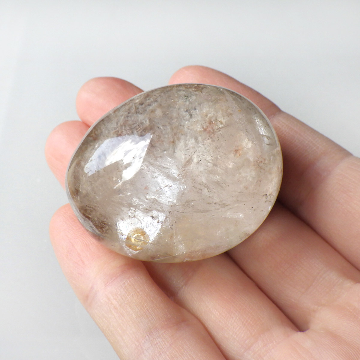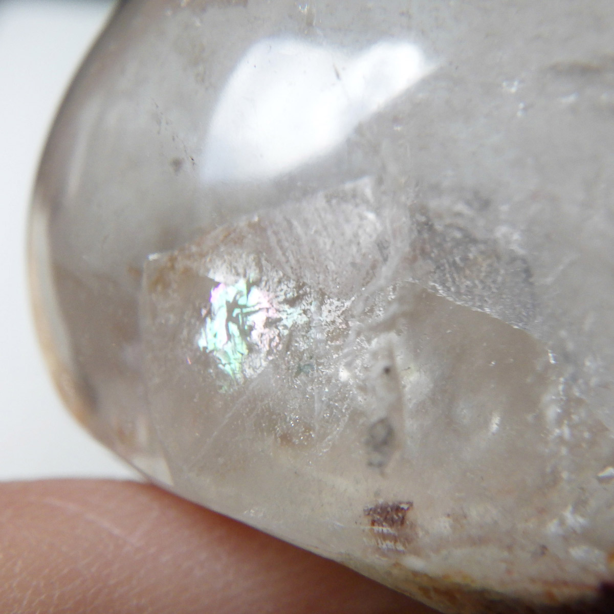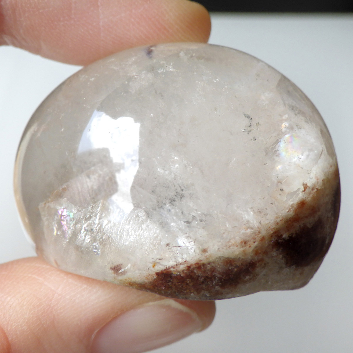 ガーデンクォーツは、水晶が形成される過程で、緑や茶色の鉱物や泥岩を巻き込みながら結晶した水晶です。水晶の中に自然の風景が閉じ込められたようにも見えるため、「庭園水晶」「苔入り水晶」とも呼ばれています。 ファントムクォーツは、ガーデンクォーツの一種で、水晶が成長していく過程で、水晶の成長が一時的に停止した際に、その表面に別の鉱物などが付着し、また水晶が再び成長を始めると結晶の中に斜めや三角、山型の模様ができます。このガーデンクォーツは内部にレインボー入りの結晶が育っていてクォーツインクォーツになっています。