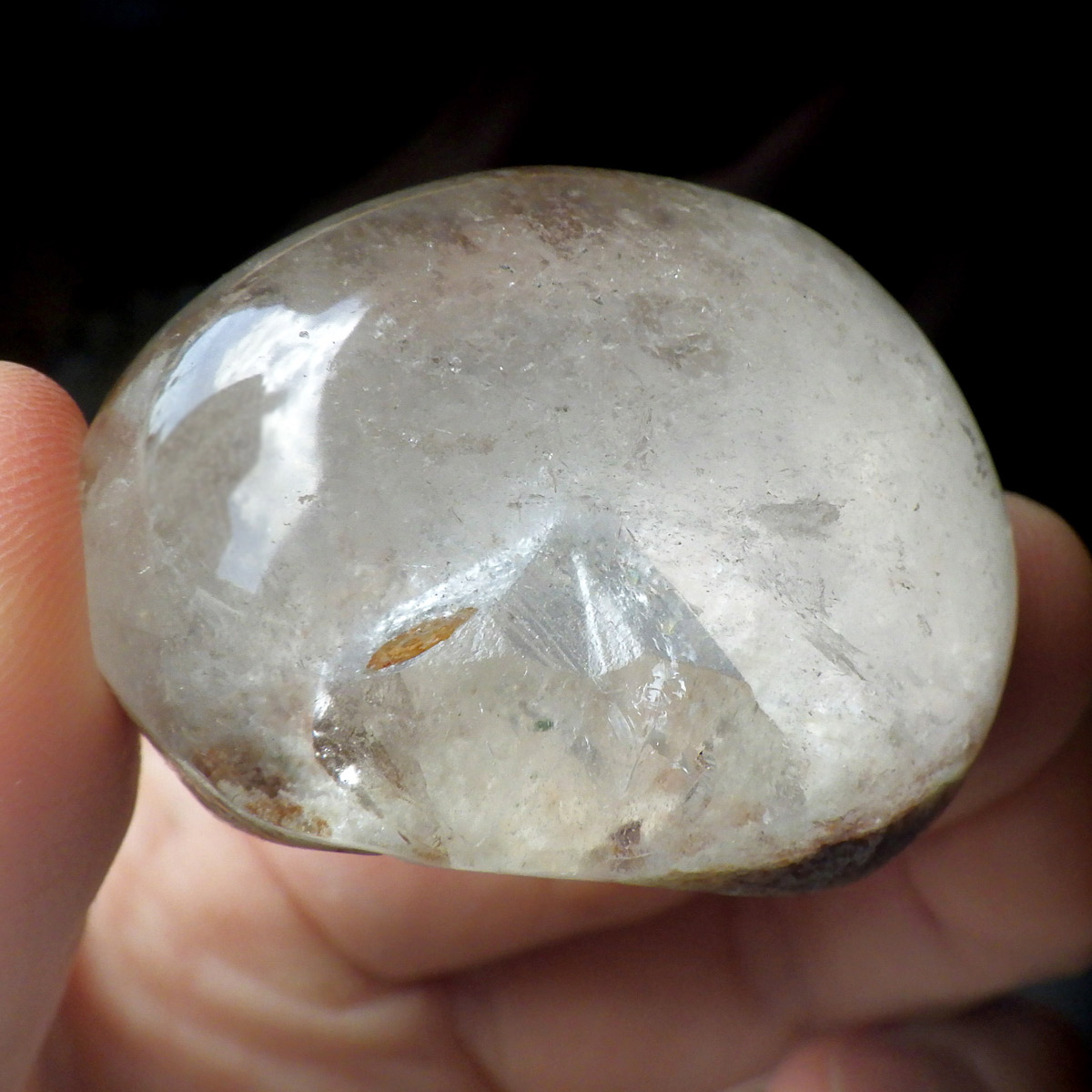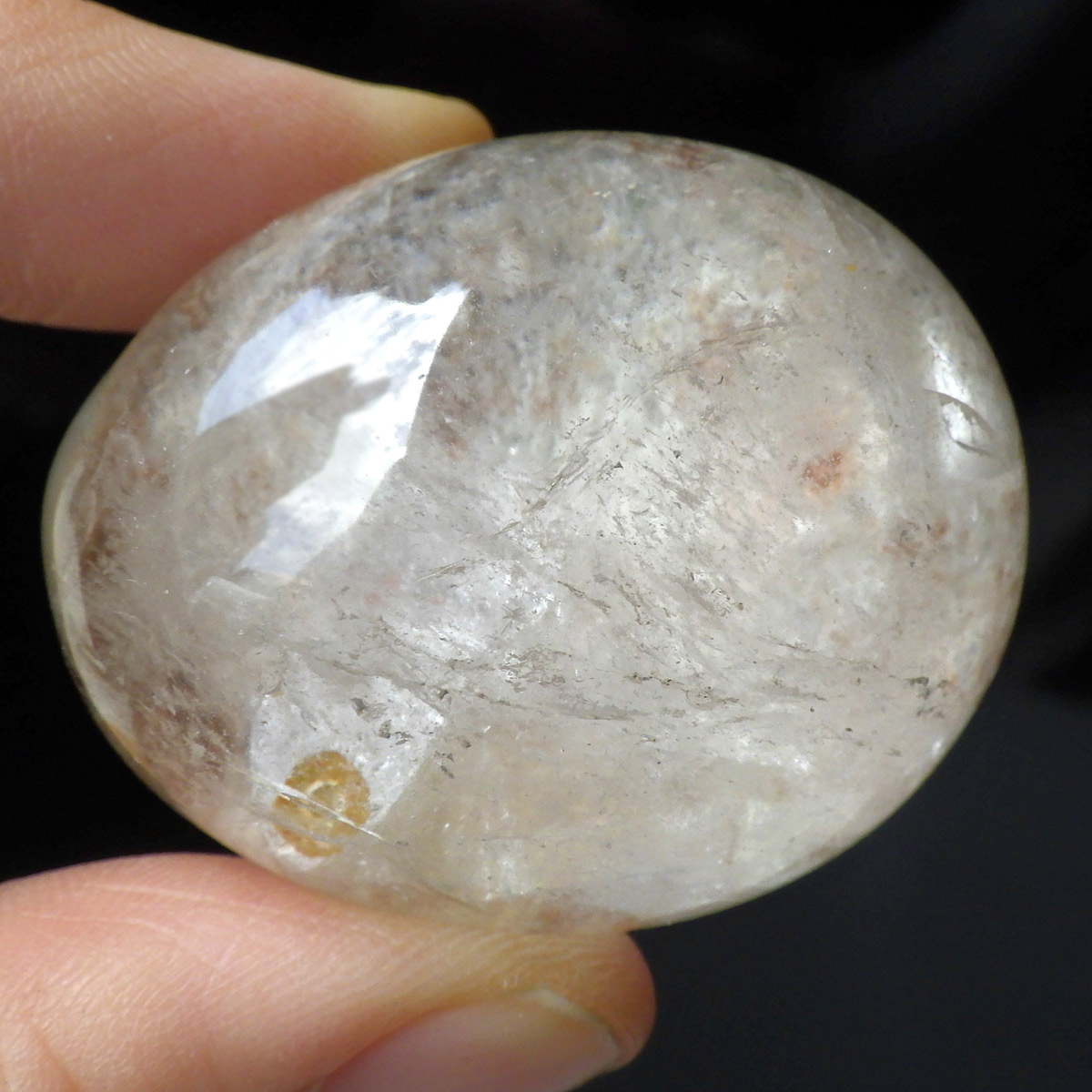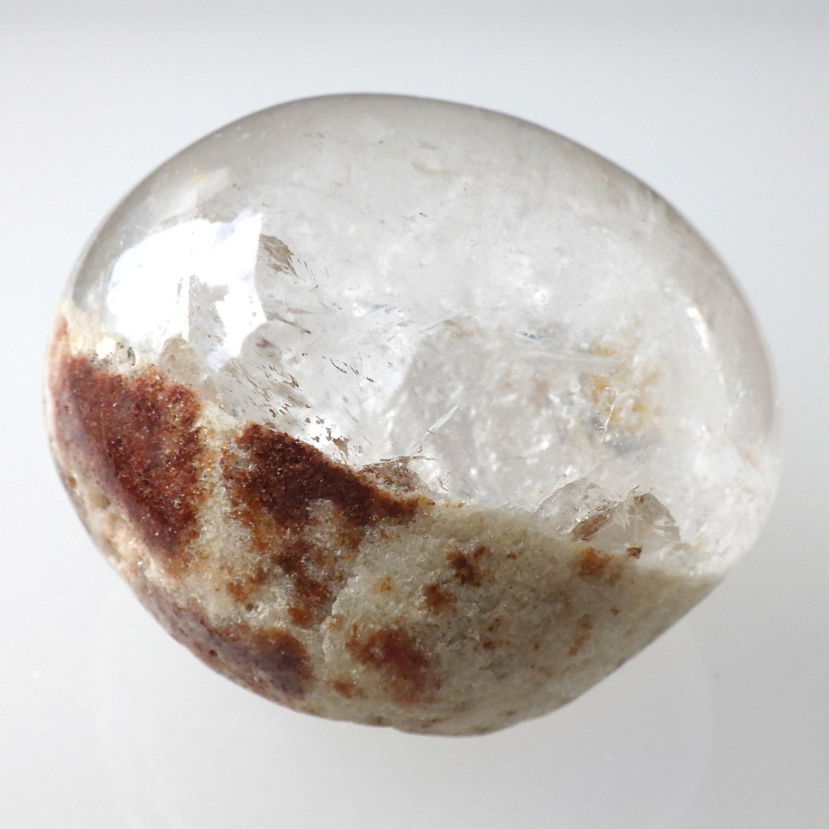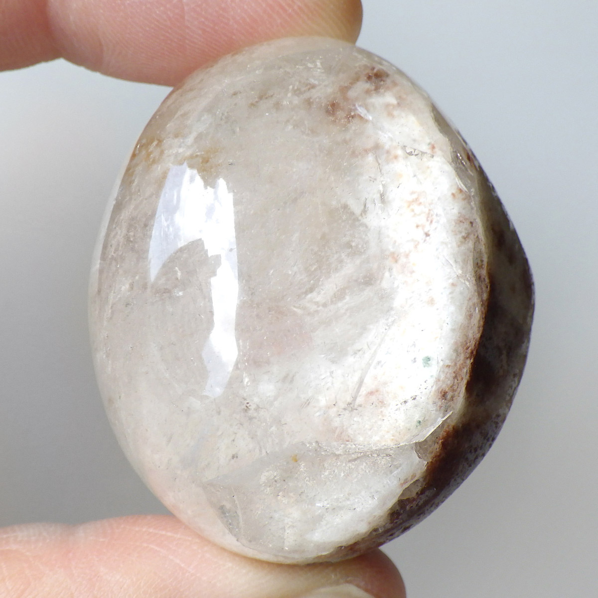 ガーデンクォーツは、水晶が形成される過程で、緑や茶色の鉱物や泥岩を巻き込みながら結晶した水晶です。水晶の中に自然の風景が閉じ込められたようにも見えるため、「庭園水晶」「苔入り水晶」とも呼ばれています。 ファントムクォーツは、ガーデンクォーツの一種で、水晶が成長していく過程で、水晶の成長が一時的に停止した際に、その表面に別の鉱物などが付着し、また水晶が再び成長を始めると結晶の中に斜めや三角、山型の模様ができます。このガーデンクォーツは内部にレインボー入りの結晶が育っていてクォーツインクォーツになっています。
