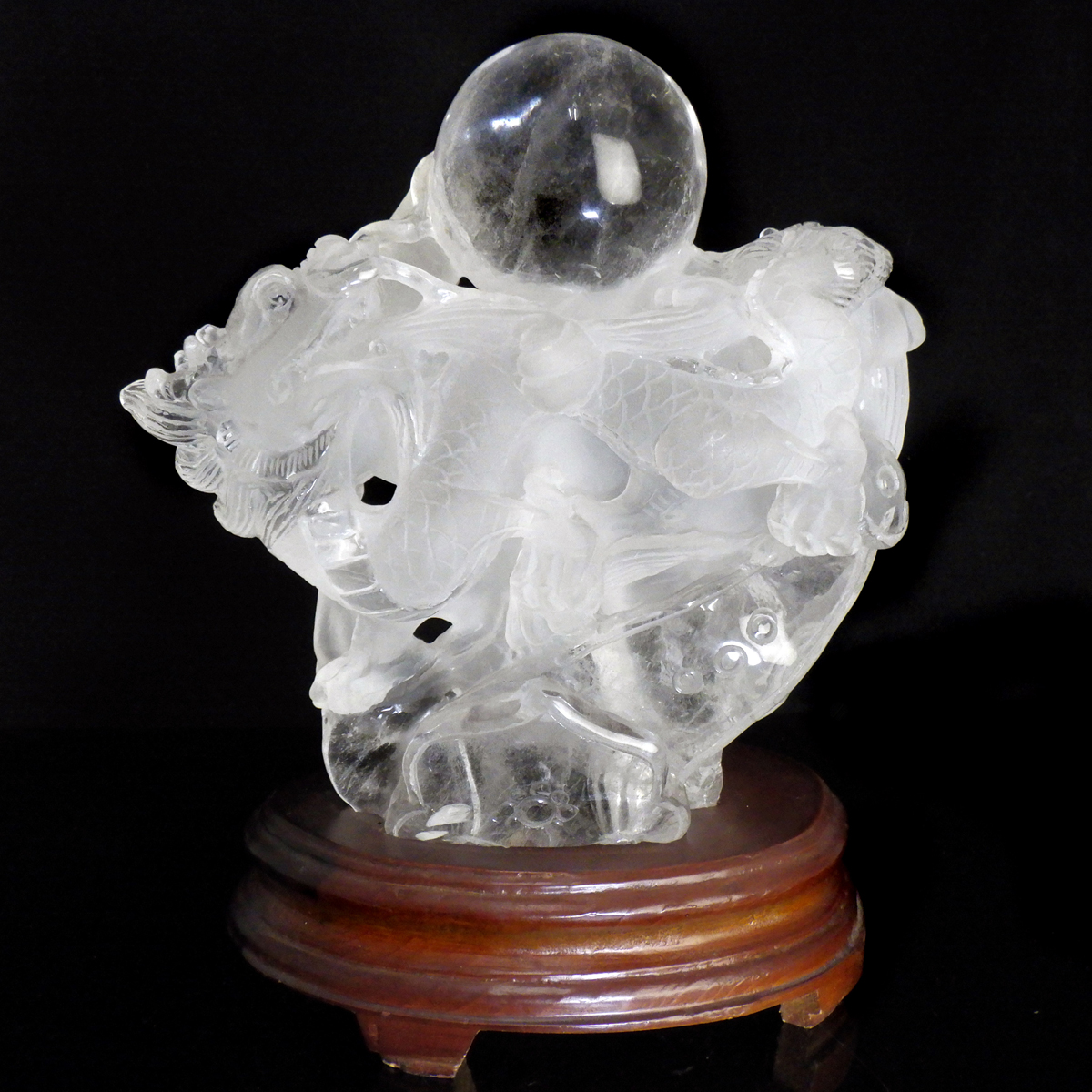水晶 龍彫刻 竜彫り 台付き 置物