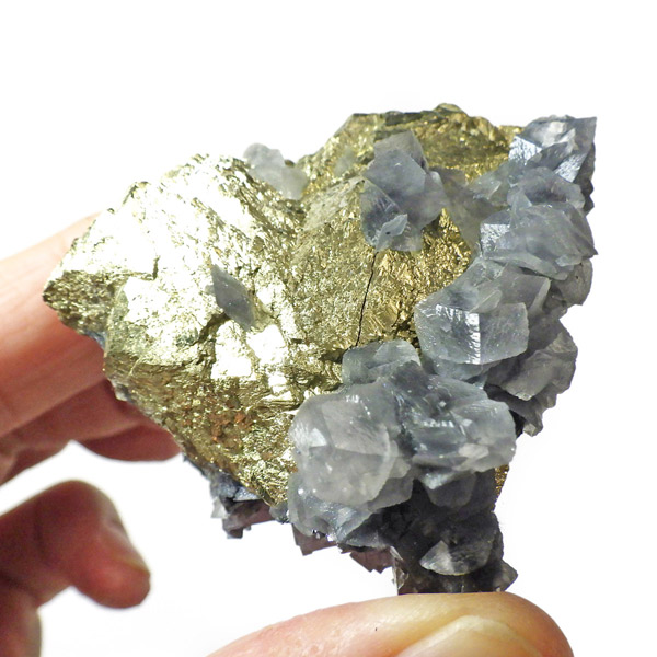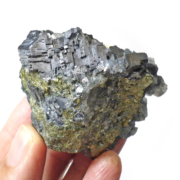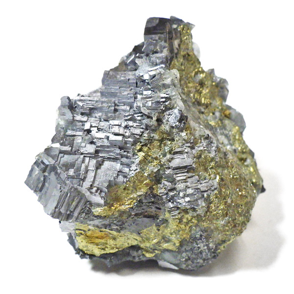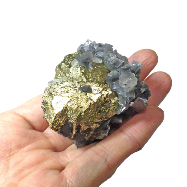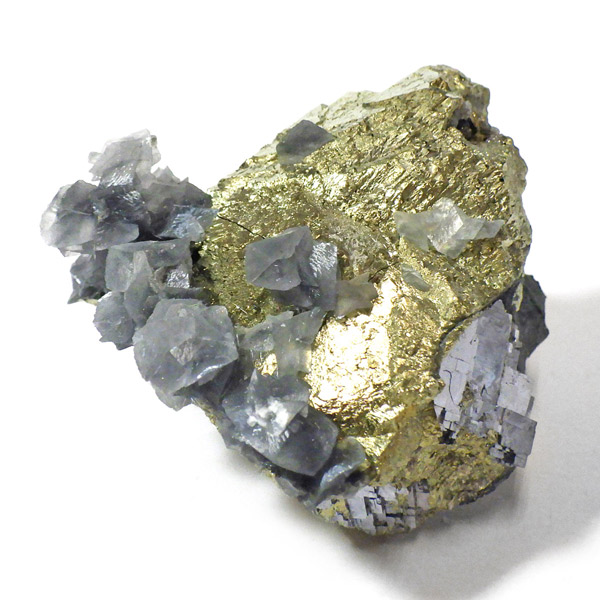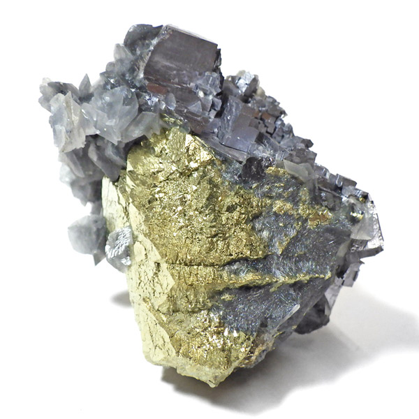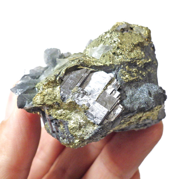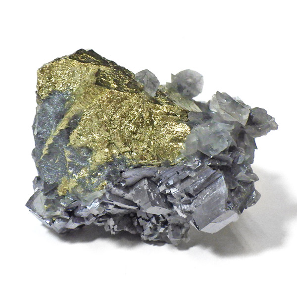 ガレーナ(方鉛鉱)に、パイライト(黄鉄鉱)とカルサイト(方解石)が共生した原石です。 比較的大きめのパイライトとガレーナ結晶が特徴で、金属光沢のある表面が美しく輝きます。 金と間違うぐらいの黄金色のパイライトとカルサイトの柔らかな白色が調和し、重厚感の中にも上品さを感じさせる標本です。