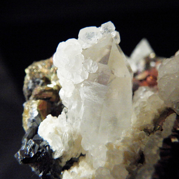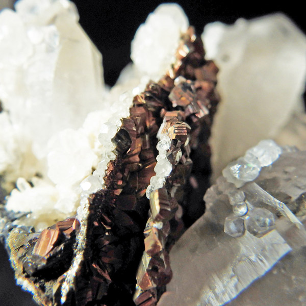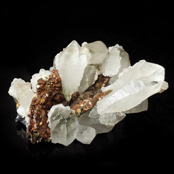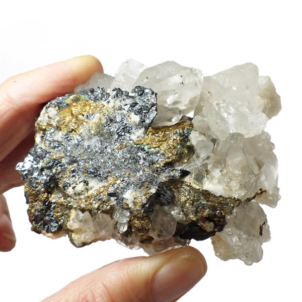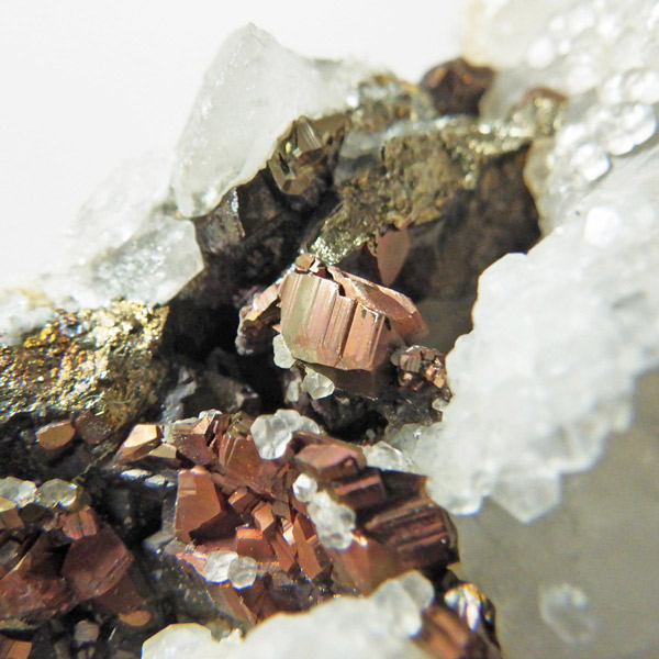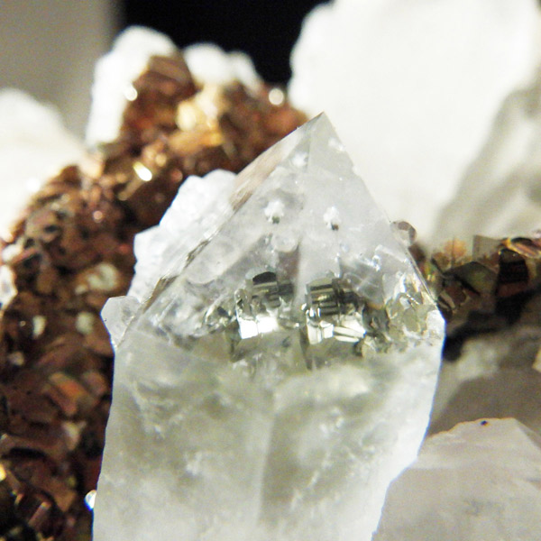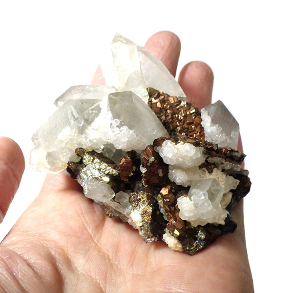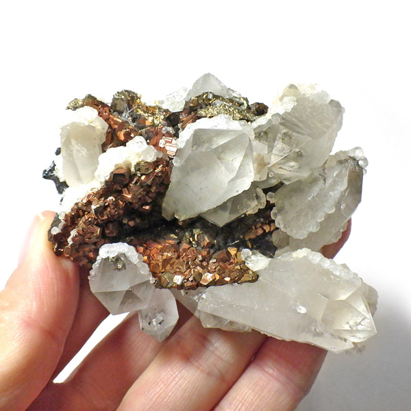 コソボ産のチャルコパイライト(銅鉄鉱)にクォーツ(水晶)が共生した原石です。 チャルコパイライトは鮮やかな金属光沢と赤銅色の輝きが特徴で、結晶の形もはっきりとしています。 透明感のあるクォーツとのコントラストにより、角度によって表情が変わる美しい標本です。 重厚感と輝きを併せ持ち、眺めて楽しめる一品です。