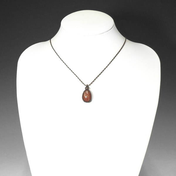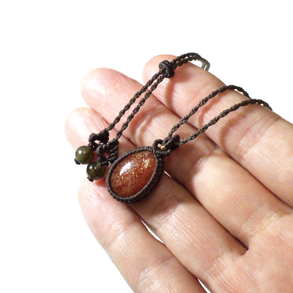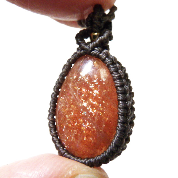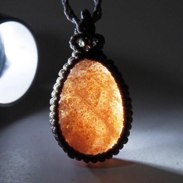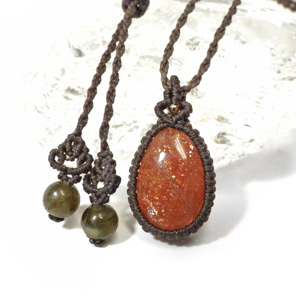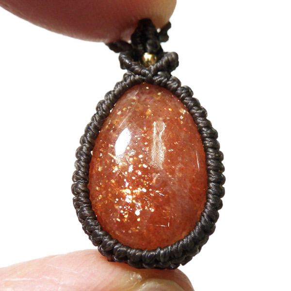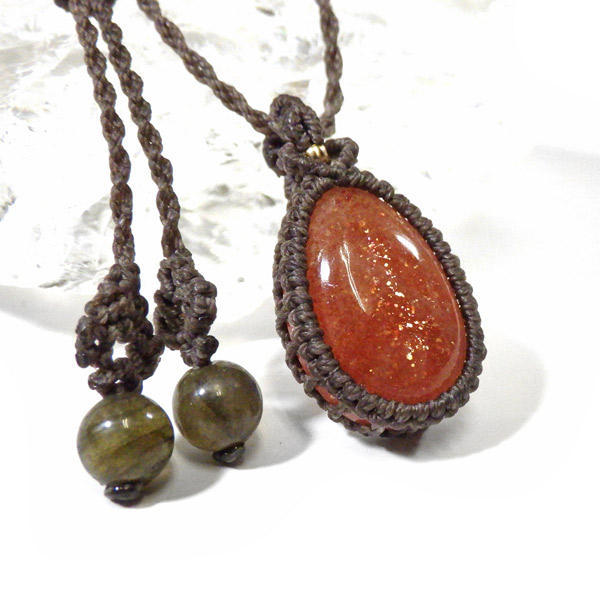 インド産サンストーンを使用したマクラメペンダントです。 サンストーンはオレンジの中に煌めきが浮かぶように輝き、太陽の光を閉じ込めたような明るさを感じさせます。 石をしっかりと包み込みながらも、ナチュラルな風合いを活かしたマクラメ編みで仕上げました。 見る角度によって煌めく光が変化し、身に付けて頂く度に新しい表情を楽しめます。