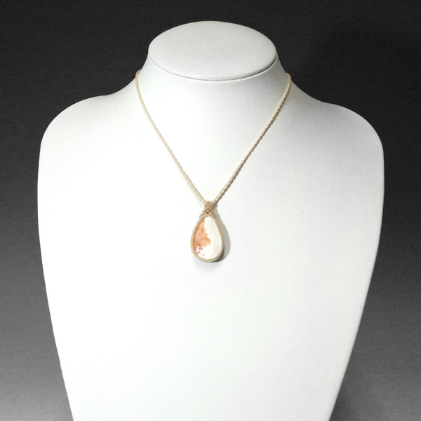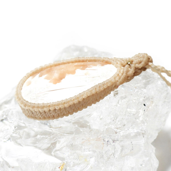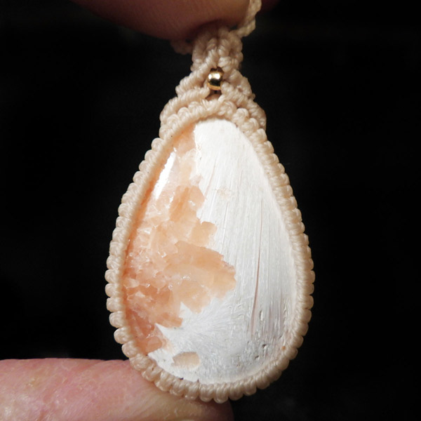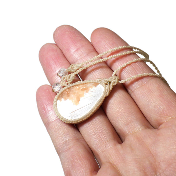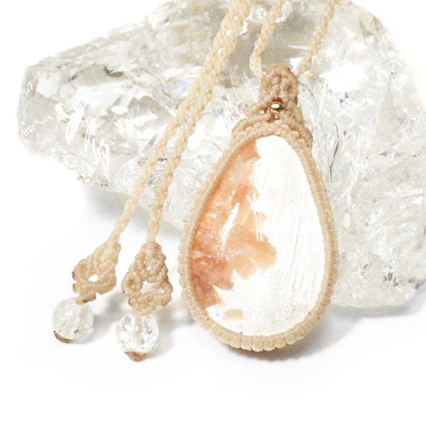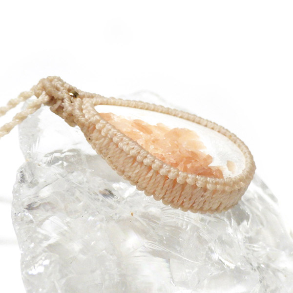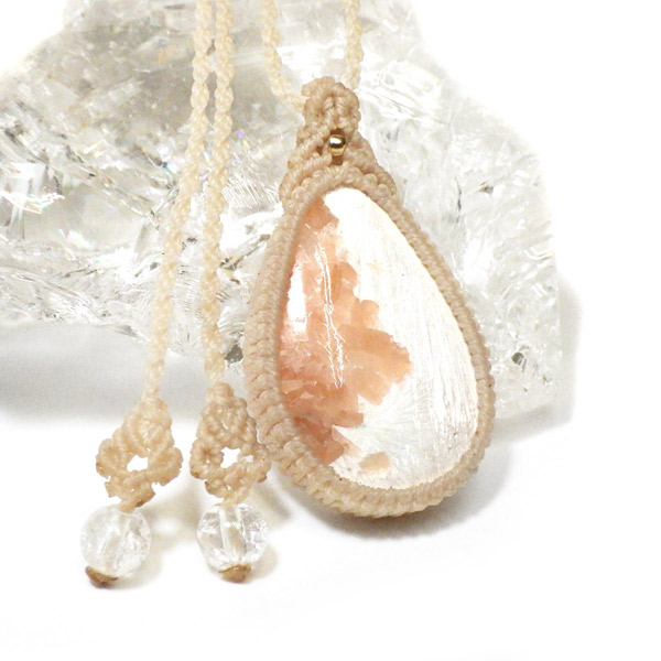 オレンジの束状がスティルバイト、白く細長い繊維状の結晶がスコレサイトです。スコレサイトは純粋さや調和を象徴し、心を穏やかに整えてくれる石。深い癒しをもたらすといわれています。スティルバイトは優しさと安らぎの波動を持ち、感情のバランスを整えるサポートをしてくれる石。直感力や創造力を高めるともいわれています。この2つの鉱物が織りなす神秘的なハーモニーにより、穏やかで落ち着きを与えてくれるペンダントとなっています。
