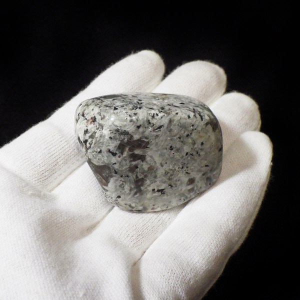 アメリカ・ミシガン州産のユーパーライトのタンブルです。 ユーパーライトは2017年に発見された比較的新しい天然石で、ブラックライトを当てると鮮やかなオレンジ色に輝く特別な性質を持ちます。鉱物としてはソーダライト含有閃長岩。 一見すると落ち着いたグレー調の石ですが、ライトを当てた瞬間に内側から炎のように光り出す姿は神秘的です。