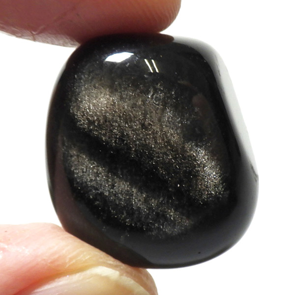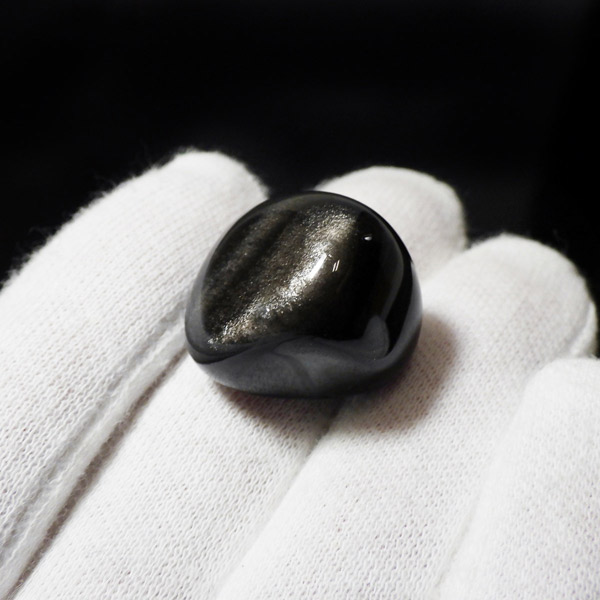 メキシコ産のシルバーオブシディアン、タンブルです。オブシディアンは和名で黒曜石。シルバーオブシディアンは黒曜石の中でもシルバーのシラー光沢を確認できる天然の火山ガラスです。マグマが急速に冷却される過程でナノ粒子が閉じ込められ、その微細な内包物が光を干渉させることで、独特のシルバーの輝きが生まれます。見る角度によってふわりと現れるメタリックな光沢はとてもシックで、クールな存在感を放ちます。