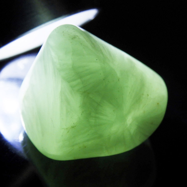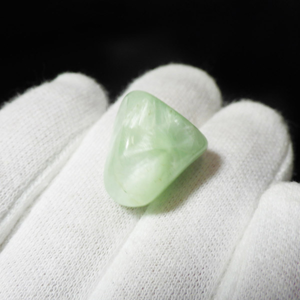ナミビア産のアップルグリーンプレナイト、タンブルです。プレナイトは、淡い青緑から黄色にかけての色合いの石。1788年に南アフリカで初めてこの石を発見したフォン・プレーン大佐にちなんで名付けられました。葡萄石という和名は産出時に見た目が葡萄のようであったことから名づけられました。今回は黄色味がかったものではなく、発色の良いアップルグリーンのプレナイトをご用意いたしました。綺麗な色合いで心が落ち着きます。