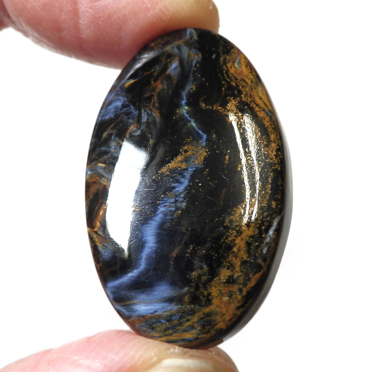 ナミビア産ブルーピーターサイトのペンダントトップです。タイガーアイの成分を持つ鉱物が、地殻変動によって粉砕され、膨大な年月を掛けて石英により自然に接合されて出来た鉱物です。そのため、タイガーアイのように繊維が直線状に形成されず、油絵のような独特のうねりのある模様になります。名称は「シド・ピーターズ」によってナミビアで初めて発見されたため、発見者にちなんで「ピーターサイト」命名されました。独特の色模様が、嵐のようにも見えることから、別名「テンペストストーン(嵐の石)」とも呼ばれることが有ります。鉱物学的名正式名称はクロシドライトアゲートとなります。