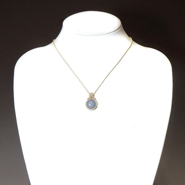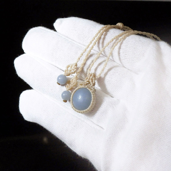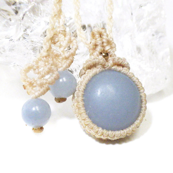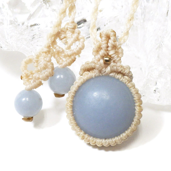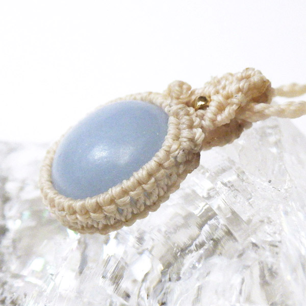 ペルー産エンジェライトを使用したマクラメペンダントです。 やわらかな空色が印象的で、穏やかさと優しさを感じさせる石です。 石の雰囲気を損なわないよう、ナチュラルなマクラメ編みで丁寧に包み込みました。 癒しや安心感を求める方におすすめです。