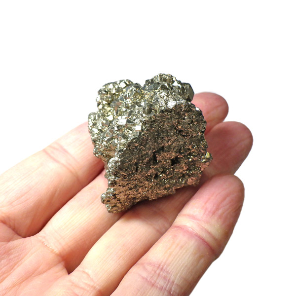 ペルー産のパイライト原石です。コロッとかわいらしいサイズでキラキラが信じられないほどまぶしい原石。パイライトは、火山活動の活発な場所で生成されます。結晶は大変整った六面体や八面体です。金と間違えるほどのゴールドで、硫黄と鉄で構成された鉱物の一種です。