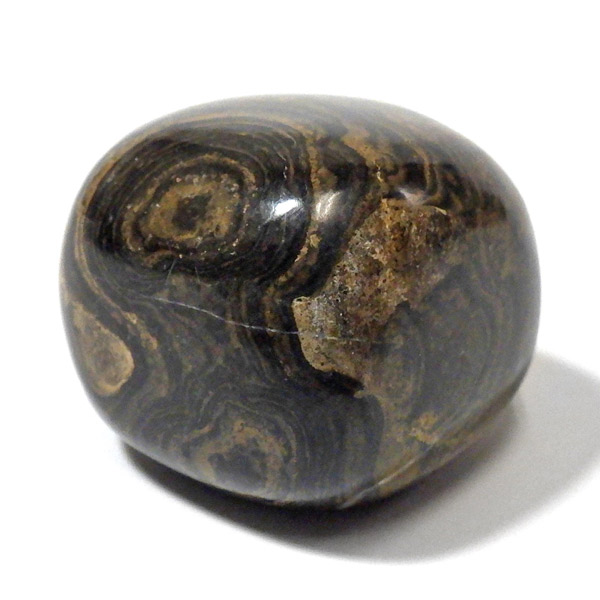 ペルー産、ストロマトライトのタンブルです。ストロマトライトは30億年前以上、シアノバクテリアなどの藍藻類の死骸と泥粒などによって作られる層状の構造をもつ岩石のことです。海水、淡水域どちらからも見つかり地球上に広く分布していたことが伺えます。長い年月をかけて堆積した岩石で縞模様の広さから当時の様子が伺えることなどから化石に分類されています。