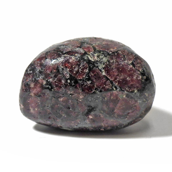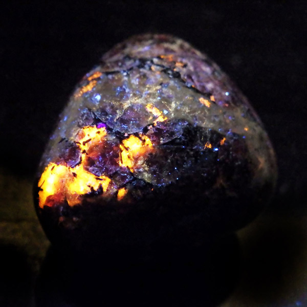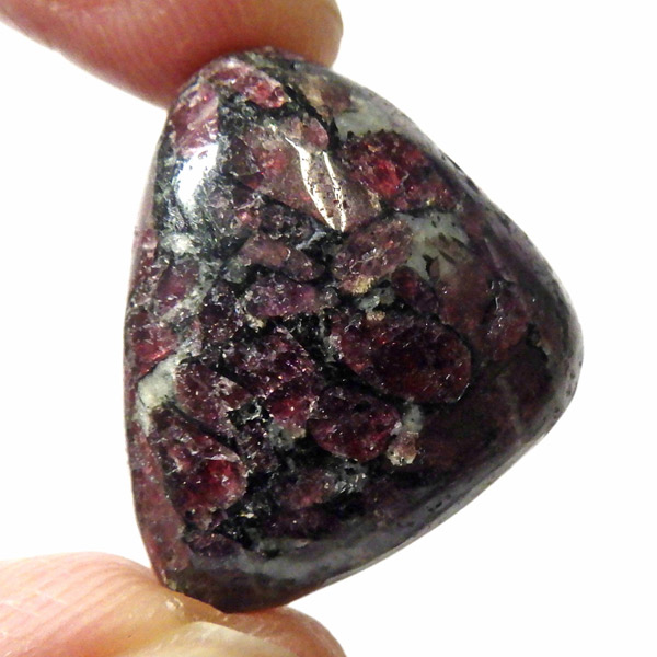 ロシア産のユーディアライト、タンブルです。産出量の少ない希少な石。深いワインレッドとキラキラとした結晶がとてもきれいで、神秘的な輝きを放ちます。赤い色が鮮やかであるほど貴重で、産地であるロシア・ラップランドではラップランドのルビーという愛称があります。ユーディアライトではない母岩部分(おそらくソーダライト)が365nmの波長で蛍光しました。