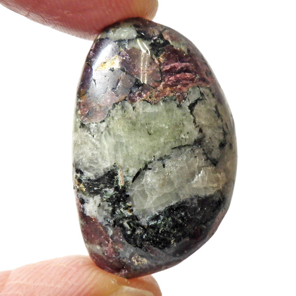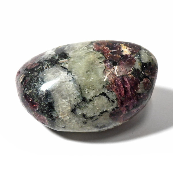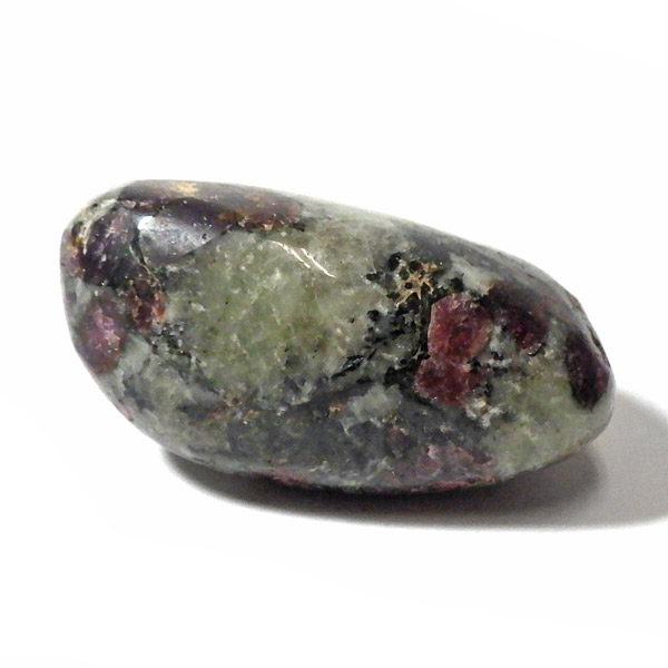 ロシア産のユーディアライト、タンブルです。産出量の少ない希少な石。深いワインレッドとキラキラとした結晶がとてもきれいで、神秘的な輝きを放ちます。赤い色が鮮やかであるほど貴重で、産地であるロシア・ラップランドではラップランドのルビーという愛称があります。ユーディアライトではない母岩部分(おそらくソーダライト)が365nmの波長で蛍光しました。